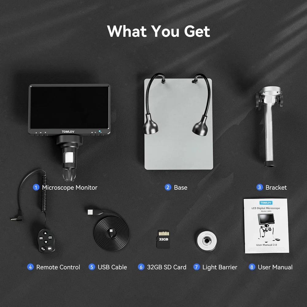 Tons of Fun and Applications: With easy-to-use operation and a wide range of applications, from micro soldering and rock inspection to coin and stamp observation, this coin microscope with screen is perfect for adults, students, and young learners, enhancing interaction between parents and kids, as well as teachers and students 7-Inch Rotatable FHD Screen: Equipped with a 12MP ultra-precise focusing camera and 1080P high-definition imaging, this LCD digital microscope captures high-quality images and videos, delivering an incredible microscopic viewing experience. The rotatable (90-degree) screen design improves ergonomics and reduces eye and neck strain 5X-1200X Magnification: Allows you to zoom in and observe the tiniest details with a magnification range from 5X to 1200X. The 8 LED fill lights, plus 2 additional gooseneck lights, ensure a well-lit view. The actual magnification varies depending on the screen size and the distance between the camera and objects Hook Up to PC for a Larger View: Compatible with Windows and macOS, the PC view allows you to observe on a larger screen and facilitates data sharing and analysis. No additional software required—simply use the default apps: "Windows Camera" for Windows and "Photo Booth" for iMac/MacBook 32GB SD Card Included: This coin magnifier with light includes a 32GB Micro SD card, allowing you to store numerous photos and videos. Press and hold the menu button for 3 seconds to switch between “Photographing,” “Video Recording,” and “Playback” modes Solid Metal Frame Construction: Constructed with an aluminum alloy base, stand, and holder, this soldering microscope ensures long-term durability, making it ideal for micro soldering and PCB repairs Available Photo & Video Resolutions: Photo Resolution: 12MP (4023×3024), 10MP (3648×2736), 8MP (3264×2448), 5MP (2592×1944), 3MP (2048×1536). Video Resolution: 1080FHD (1920×1080), 1080P (1440×1080), 720P (1280×720). Please note that higher resolutions take up more storage space, and resolution may be limited when viewed on a PC Product Description The Most Popular 7" Soldering & Coin Microscope - TOMLOV DM9 1 Mass Storage 2 Capture & Record 1 Rechargeable Battery 2 Convenient Remote Control TOMLOV DM9 Digital Microscope - The Most Useful Tool for You & Your Child! Parameter Difference of TOMLOV DM9 Series Digital Microscope Customer Reviews 4.4 out of 5 stars 2,505 4.4 out of 5 stars 2,505 4.5 out of 5 stars 307 4.4 out of 5 stars 275 Price $69.99 $ 69 . 99 $72.99 $ 72 . 99 $89.99 $ 89 . 99 $129.99 $ 129 . 99 Screen Size 7" LCD Display 7" LCD Display 7" IPS Display 10.1" IPS Display Magnification 5X-1200X 5X-1200X 10X-1200X 5X-1500X Photo Resolution 12MP 12MP 16MP 20MP Video Resolution 1080P 1080P 1080P 1080P Stand Height 8.5" 8.5" 10" 12.6" Base Size 4.6"*6.5" 4.6"*6.5" 4.6"*7.8" 7"*8" Base Color Silver Black Black Black Compatible System Windows/macOS Windows/macOS Windows/macOS/HDMI Windows/macOS/HDMI SD Card 32GB 32GB 32GB 64GB