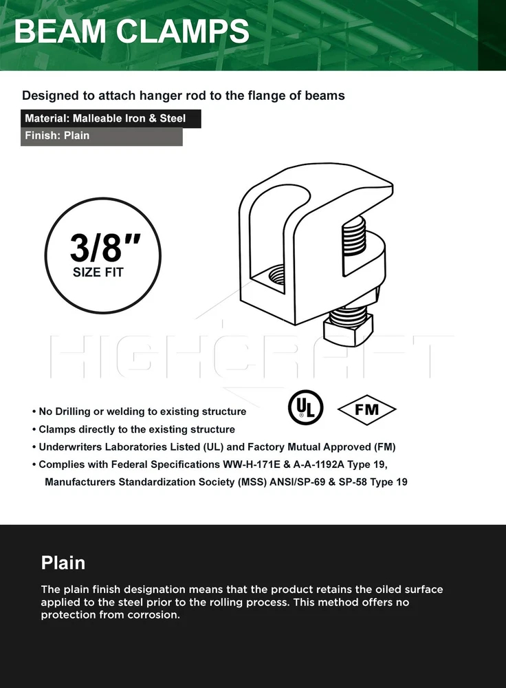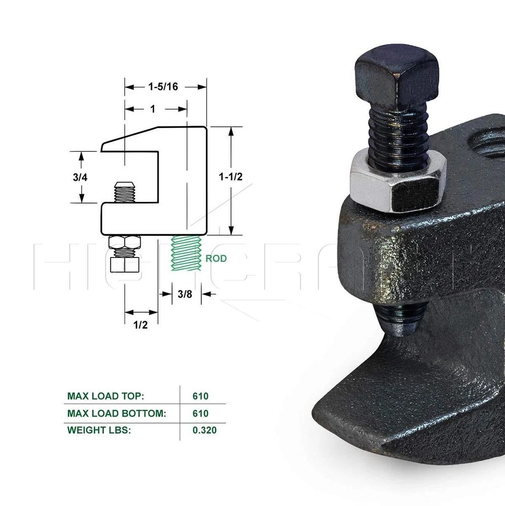 Function: Clamps onto beam flange to anchor vertical threaded rod Specialty Clamp Features: Reduces need for drilling / allows vertical Adjustment of rod / handy in various different Applications Specifications: Rod Fitting 3/8 in. / Jaw Opening 3/4 in. / Max Load 610 Superior Quality: unCoated steel Construction Compliance: UL listed and FM approved