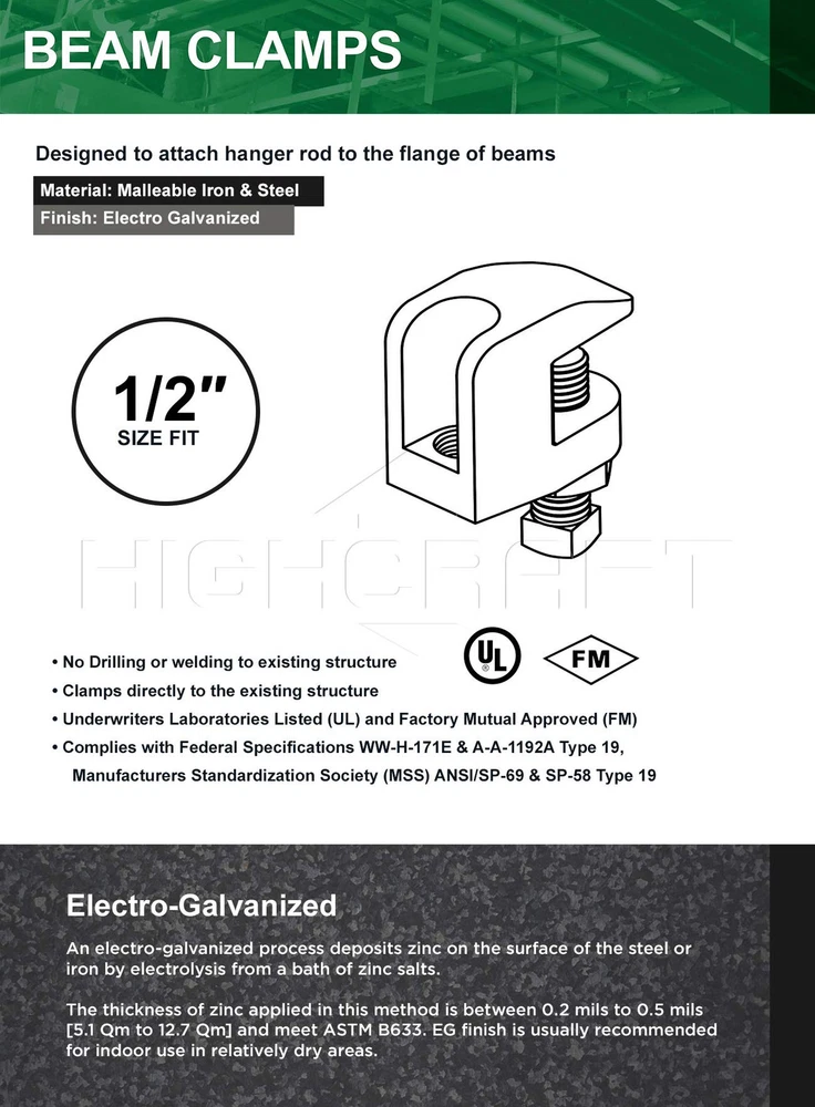 Function: Clamps onto beam flange to anchor vertical threaded rod Specialty Clamp Features: Reduces need for drilling / allows vertical Adjustment of rod / handy in various different Applications Specifications: Rod Fitting 1/2 in. / Jaw Opening 3/4 in. / Max Load 1130 Superior Quality: electro galvanized steel Construction Compliance: UL listed and FM approved