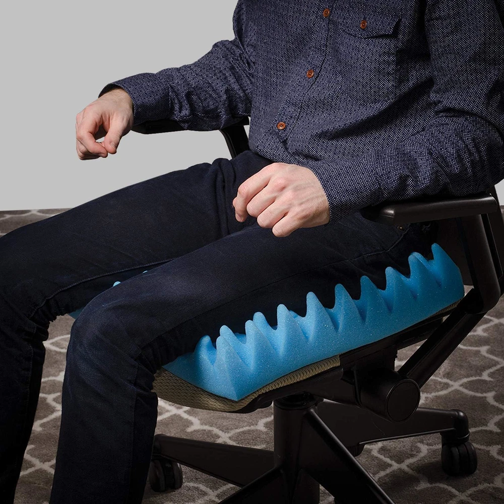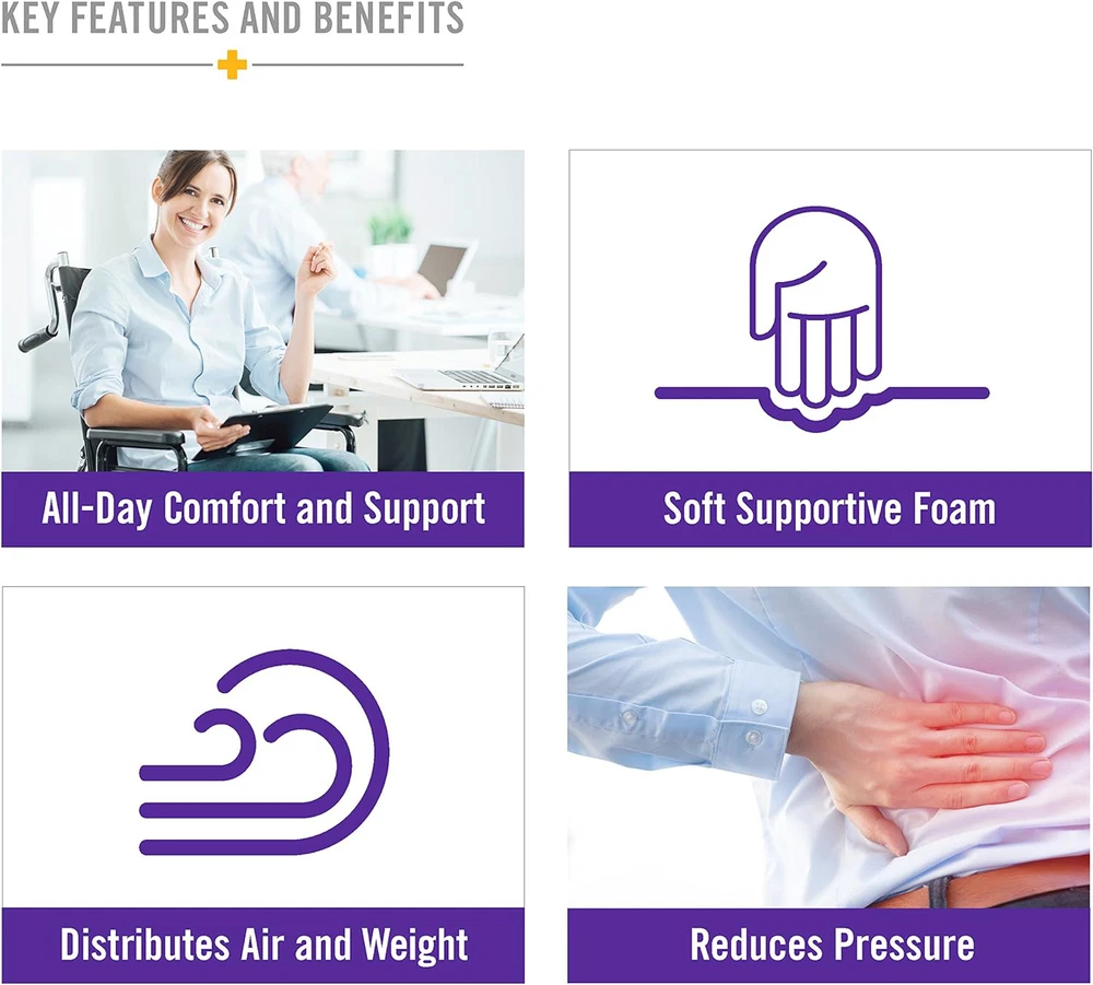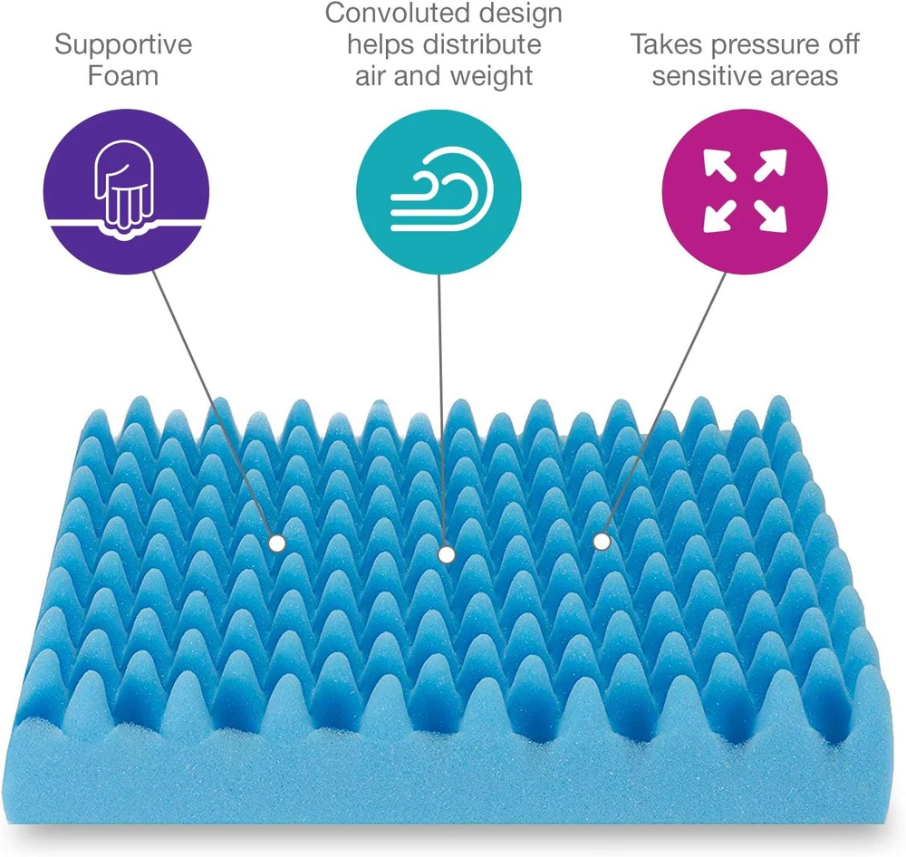 SCULPTED FOAM SEAT CUSHION provides comfort and support by turning any uncomfortable office chair, car seat or wheelchair into a comfortable area to sit with durable support. MEDICAL GRADE SEAT CUSHION is constructed of medical-grade egg crate foam to help reduce or heal pressure sores by taking weight off sensitive areas and improving air circulation. WAFFLE CUSHION is great for using on office chairs, kitchen chairs, car seat, wheelchairs or recliners to help reduce back pain, hip discomfort, sciatica, pregnancy back pain, herniated discs, tailbone injuries and hemorrhoids. ERGONOMIC LUMBAR CUSHION PROVIDES SUPPORT from the bottom up for everyday use or after surgery or injuries. The egg sitter convoluted foam seat pad cushion surface helps add surface comfort. Chair padding is non-skid and stays in place. CHAIR PILLOW SIZE: 18 x 16 x 4. Our egg sitter is made from medical-grade foam and is spot clean only. This convoluted (egg crate) Foam Seat Cushion with Back will add comfort to your chair and relieve pain when sitting for long periods of time. If you use a wheelchair or need to sit for extended periods in a regular chair, this soft cushion can give you more comfort. Made of medical grade foam, this cushion helps to better distribute your weight and promote better air circulation. It can help to prevent or heal pressure sores.