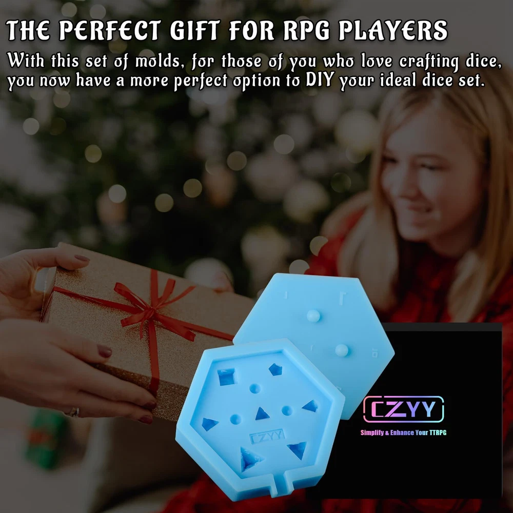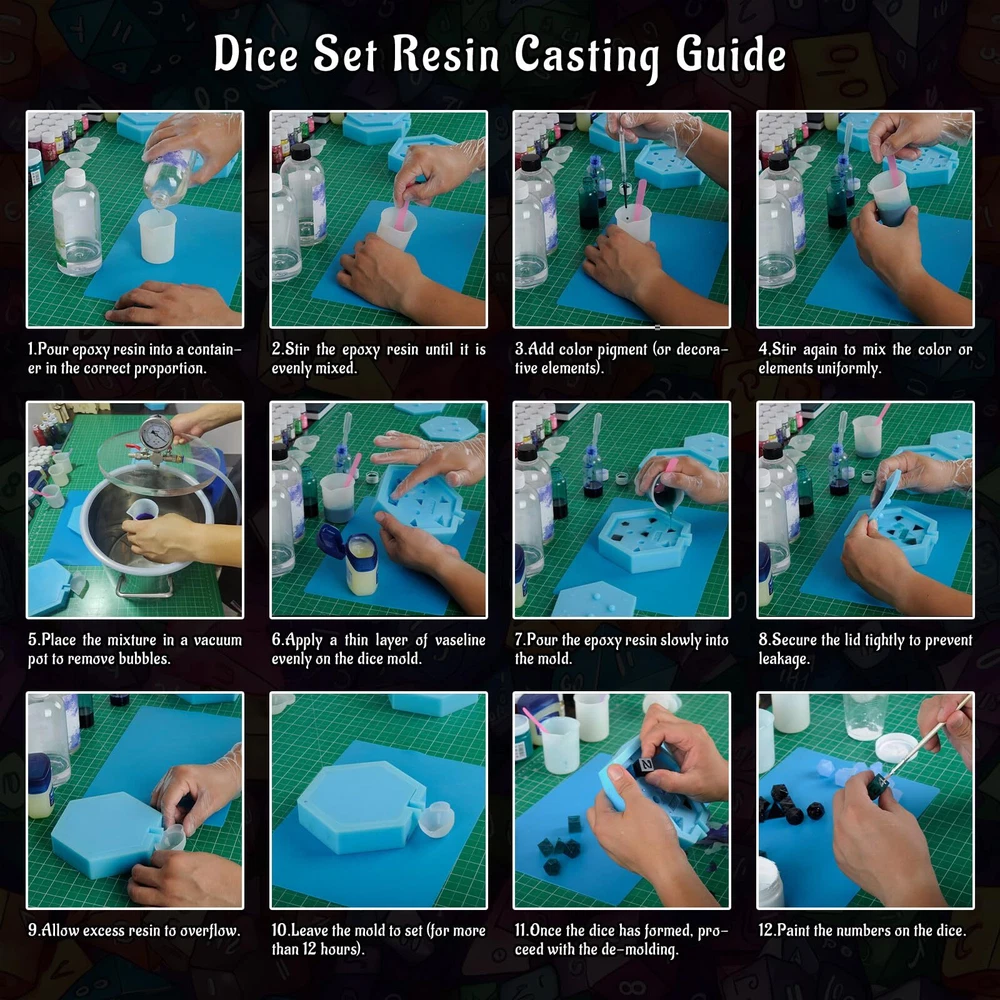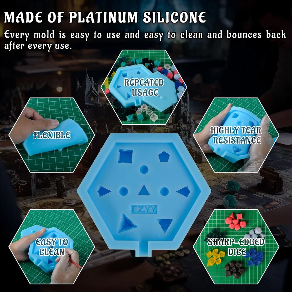 Have you ever wanted to make your own dice? With dice mold, you can! This slab mould contains 7 cavities for a full DnD or Pathfinder polyhedral dice set. The mould itself is a slab type mould consisting of a base layer with mould cavities and a lid with the top face of each dice. The base and lid are keyed to fit together in specific way which means the dice line up perfectly with their faces every time. The mould itself is made from silicone which is both flexible and tear resistant. This mould type is ideal for both "Petri" and "Dirty pour" style dice due to the size of the pour/fill point. Features: - Mold is polished to 15 micron finish for quick and easy dice casting polishing. - Dice that you cast are yours to make and sell freely, no font copyright claim concerns. - No pockets or voids in molds. - Works with UV resin for casting. Mold Size:5.9"x5.1"x1.4" NOTE: We recommend when filling these moulds to overfill slightly and to coat the face side of the lid in a thin layer of resin which limits air bubbles and provides a small discharge hole. PERFECT FOR DICE SET MAKING - This 7 Cavity dice mold is ideal for both new beginners to the dice making hobby looking to upgrade their moulds and seasoned dice makers. A perfect all in silicone mould for a full set of DND dice for epoxy or UV resin crafting. MADE OF PLATINUM SILICONE - Made from platinum silicone, up to 480°F and can be applied in temperatures as low as -104°F. This mold is strong enough to withstand repeated usage but still stretchy enough for easy removal of your cast pieces. Every mold is easy to use and easy to clean and bounces back after every use. EASILY CREATE YOUR OWN DICE - The dice slab mould design features and open face in which to pour resin or add inclusions, easy to use and popped out of the mold smoothly. It allows you to be as creative as can be, and then some more! Less bubbles, way easier, and much neater, a super easy mold to use for a beginner! 7 POLYHEDRAL STANDARD DICE SET - This reusable mould is perfect for resin casting and making a full 7 piece set of dnd dice (1 D4, 1 D6, 1 D8, 2 D10s (0-9 and 00-90), 1 D12, and 1 D20). This mold will give you smooth, shiny, sharp-edged dice, with all numbers intact. WORKS WITH VARIOUS MATERIALS - Our silicone rubber dice mold can be used with many materials, such as epoxy resin, polyester resin, polyurethane resin, wax, soap, precious metal clay, fimo clay, concrete, and more. Happy dice making!