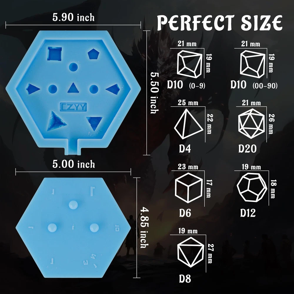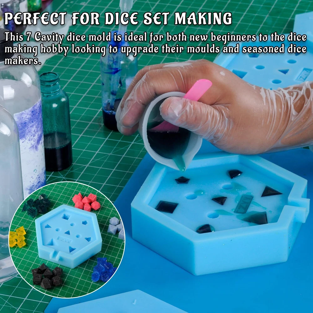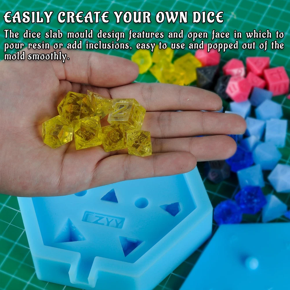 Have you ever wanted to make your own dice? With dice mold, you can! This slab mould contains 7 cavities for a full DnD or Pathfinder polyhedral dice set. The mould itself is a slab type mould consisting of a base layer with mould cavities and a lid with the top face of each dice. The base and lid are keyed to fit together in specific way which means the dice line up perfectly with their faces every time. The mould itself is made from silicone which is both flexible and tear resistant. This mould type is ideal for both "Petri" and "Dirty pour" style dice due to the size of the pour/fill point. Features: - Mold is polished to 15 micron finish for quick and easy dice casting polishing. - Dice that you cast are yours to make and sell freely, no font copyright claim concerns. - No pockets or voids in molds. - Works with UV resin for casting. Mold Size:5.9"x5.1"x1.4" NOTE: We recommend when filling these moulds to overfill slightly and to coat the face side of the lid in a thin layer of resin which limits air bubbles and provides a small discharge hole. PERFECT FOR DICE SET MAKING - This 7 Cavity dice mold is ideal for both new beginners to the dice making hobby looking to upgrade their moulds and seasoned dice makers. A perfect all in silicone mould for a full set of DND dice for epoxy or UV resin crafting. MADE OF PLATINUM SILICONE - Made from platinum silicone, up to 480°F and can be applied in temperatures as low as -104°F. This mold is strong enough to withstand repeated usage but still stretchy enough for easy removal of your cast pieces. Every mold is easy to use and easy to clean and bounces back after every use. EASILY CREATE YOUR OWN DICE - The dice slab mould design features and open face in which to pour resin or add inclusions, easy to use and popped out of the mold smoothly. It allows you to be as creative as can be, and then some more! Less bubbles, way easier, and much neater, a super easy mold to use for a beginner! 7 POLYHEDRAL STANDARD DICE SET - This reusable mould is perfect for resin casting and making a full 7 piece set of dnd dice (1 D4, 1 D6, 1 D8, 2 D10s (0-9 and 00-90), 1 D12, and 1 D20). This mold will give you smooth, shiny, sharp-edged dice, with all numbers intact. WORKS WITH VARIOUS MATERIALS - Our silicone rubber dice mold can be used with many materials, such as epoxy resin, polyester resin, polyurethane resin, wax, soap, precious metal clay, fimo clay, concrete, and more. Happy dice making!