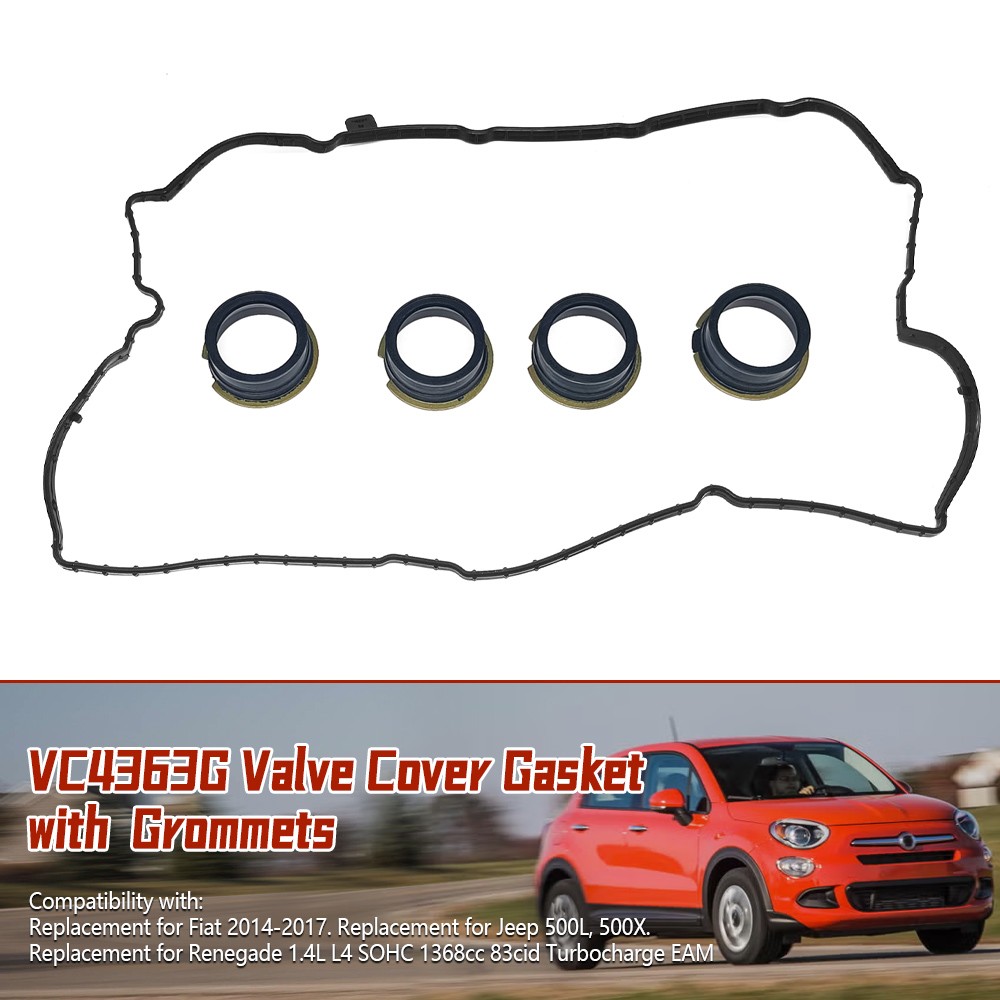 Product Description VC4363G Valve Cover Gasket W/Grom for Fiat 1.4L L4 SOHC 16v 2014-2016 Description : Condition: New High Quality and 100% NEW Fast shipping and good operation Sturdy and durable, long life service Direct replace, easy installation Please check the compatibility before ordering Replace Part Number: For VC4363G, 55233643, 55233644 Fitments: For Fiat 500L 1.4L,500X 1.4L 2014-2017 For Jeep Renegade 1.4L 2015-2018 For DODGE DART WITH 1.4L TURBO ONLY- 2013-2017 About Us Shipping Returns Contact Us We are a professional supplier of auto parts.We supply ranges of parts for Sedan, Pickup, Truck, SUV, Bus, Van.We possess widely channels for the products and gasp all the technics of auto parts process.We have excellent work teams on operations and professional management information system on auto parts.We are able to supply quality auto parts and delivery them to all over the world in time.