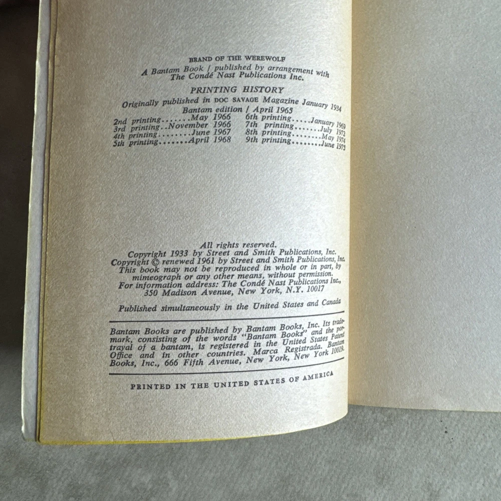 ISBN:n/aTopic:actionVintage:YesGenre:ActionLanguage:EnglishBook Title:Doc Savage brand of the werewolfPublication Year:1965gtin13:n/aFormat:PaperbackAuthor:Kenneth RobesonBook Series:Doc SavagePublisher:Bantam Books