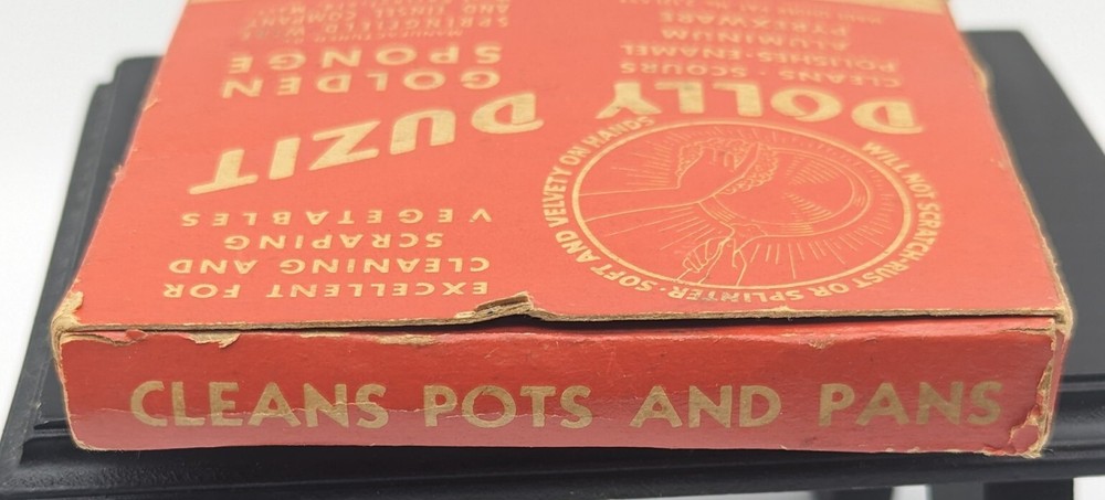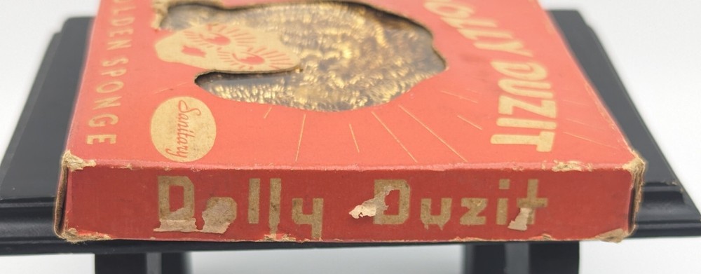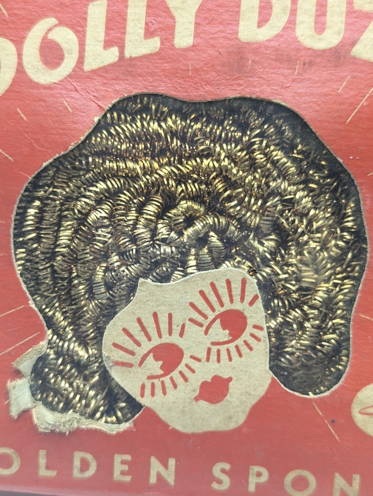 This vintage Dolly Duzit metal sponge is a rare find for any collector or enthusiast. The golden metal dish cloth adds a touch of elegance to any kitchen or dining area. Made in the United States, this unit is of high quality and has never been opened. The unique distressed design adds character to the piece, making it a one-of-a-kind addition to any collection.