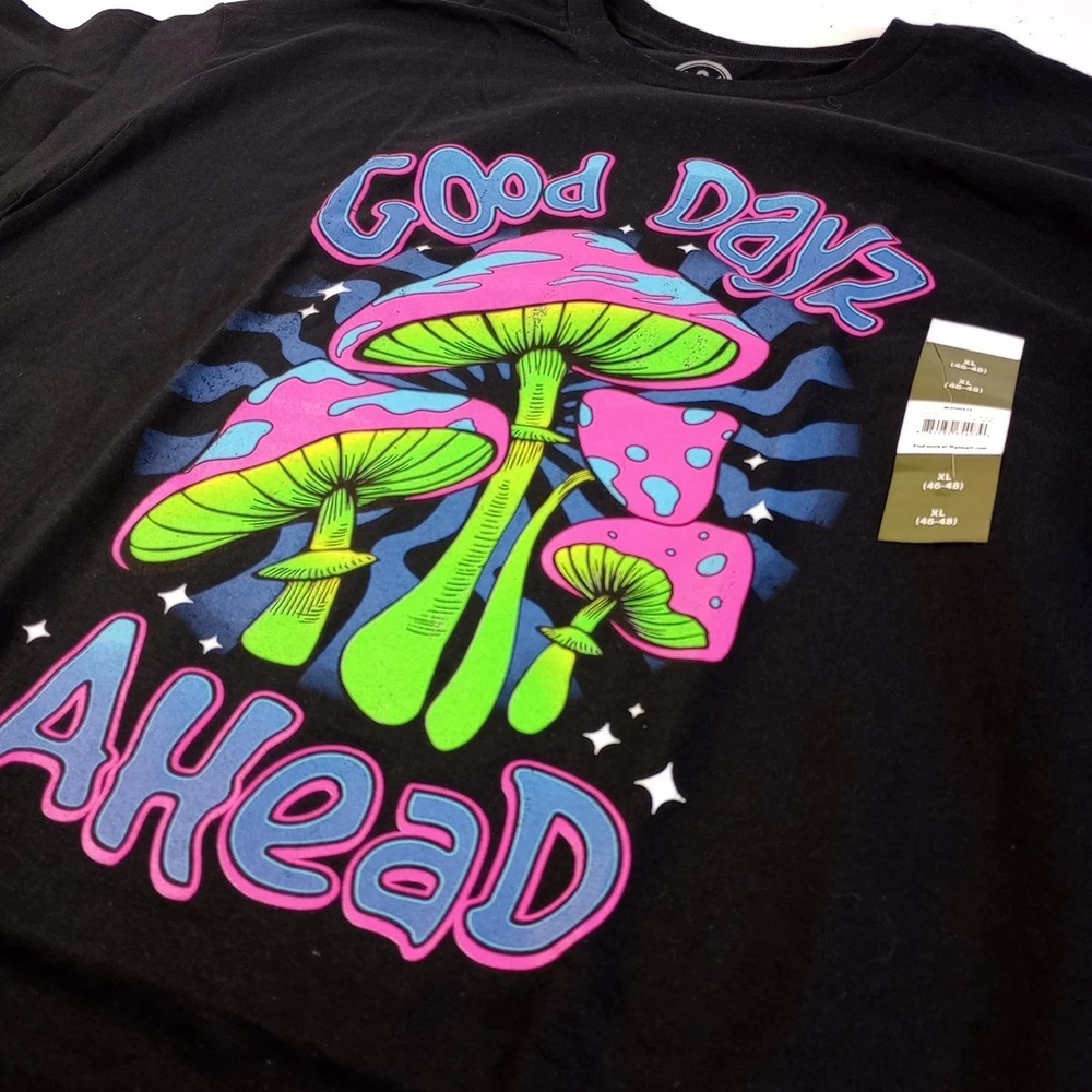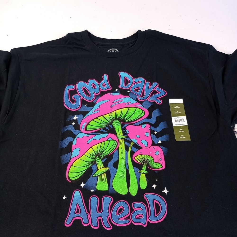 The DOM Men's Black GOOD DAYZ AHEAD Neon Mushroom T-Shirt in size XL is a stylish and comfortable addition to any man's wardrobe. Made from cotton, this short sleeve shirt features a crew neck and a regular fit, making it perfect for the summer, fall, or spring seasons. With its bold neon mushroom design, this shirt is sure to make a statement and stand out from the crowd. Machine washable for easy care, this shirt is a practical and trendy choice for any occasion.