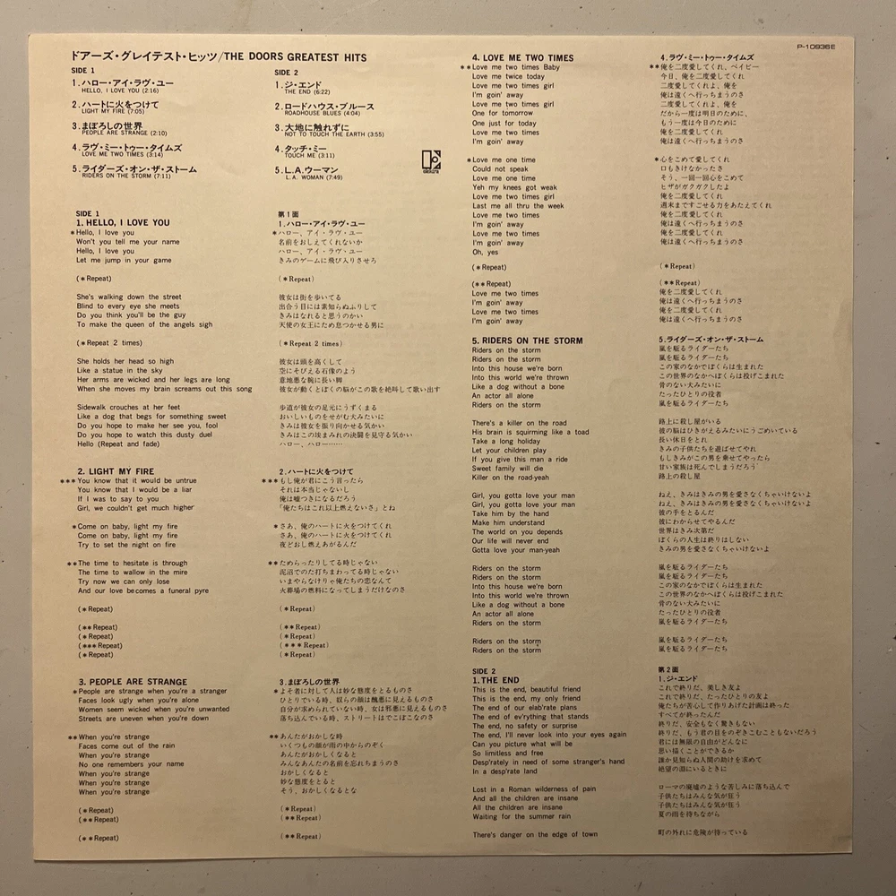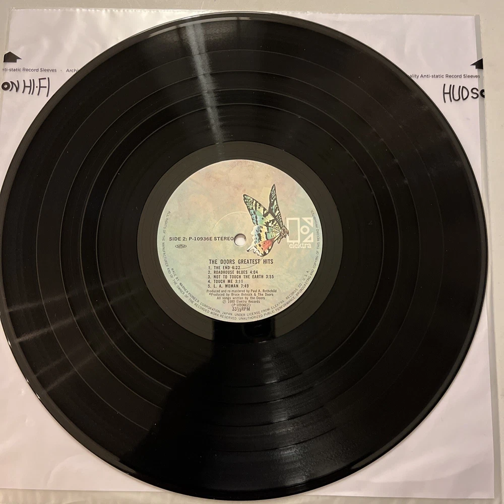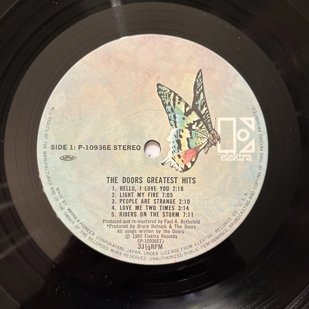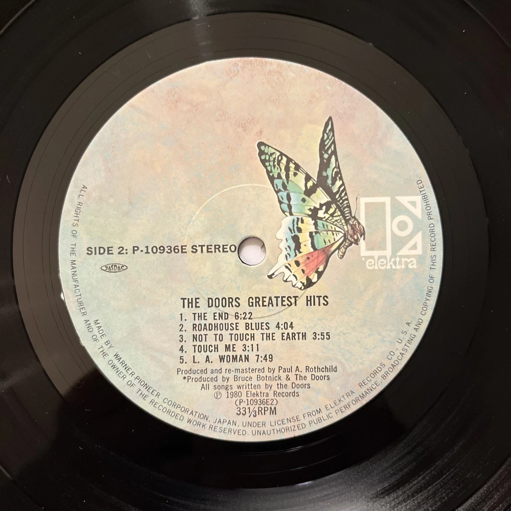 This is a must-have for any rock music fan! The Doors Greatest Hits from 1980 is a compilation LP that features their biggest hits from the 1960s. The vinyl record is in excellent shape and comes in a cardboard sleeve with an obi and insert. The 12" record has a speed of 33 RPM and is on the Elektra Records label. It was manufactured in Japan and is a great addition to any vinyl collection. Don't miss out on the chance to own this classic LP!