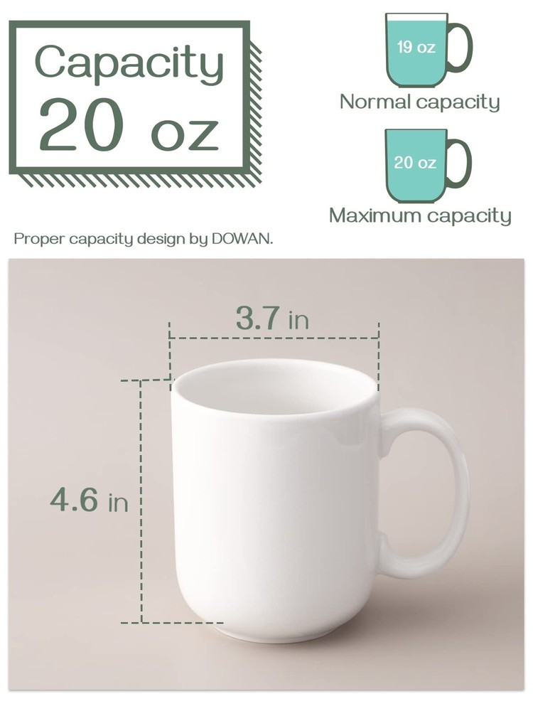 Description Features: 20 OZ Large Coffee Mugs - These white large coffee mugs are bigger than other normal coffee mugs. Therefore, the larger capacity of our large coffee mug satisfies your coffee with extra room for coffee or milk. Enjoy nice soup, and tea with our oversize coffee mugs. Comfortable Large Handle & Easy to Grip - Our coffee mugs have large handles and big enough space between the handle and the mug body which is really suitable for adult hands, and can be easily held firmly and not heavy at all. Both adults and children can hold it smoothly. Healthy Porcelain & Easy to Clean - Unlike other materials, our porcelain coffee mugs have no harmful plastics, cadmium, or Lead. Never worry about harmful substances leaching into your food. A smooth glaze prevents coffee stains from remaining easily. No longer worry about coffee being left too long, greatly saves your time to clean. Microwave & Dishwasher & Freezer & Oven Safe - Dowan coffee mugs stand up to accidental bumps and tumbles, keeping them chip-free, and looking brand-new for years to come. They can take the heat, whether it be in the dishwasher, microwave, or oven. Lovely Gift Choice -The coffee mug set comes with a well-packaged. These jumbo ceramic coffee mugs are perfect for daily household use, office, or as a gorgeous gift for your loved ones for wedding, birthdays, housewarmings, holidays and Father's Day Gifts. Product Details: Brand: DOWAN Color: White Special Feature: Microwave Safe Style: Modern Theme: Home, Office, Wedding, Holidays Brand: DOWAN Color: White Special Feature: Microwave Safe Style: Modern Theme: Home, Office, Wedding, Holidays Recommended Uses For Product: Home Included Components: 20 oz Coffee Mugs Set of 6 Specific Uses For Product: Hot Drinks Shape: Round Pattern: Solid Product Care Instructions: Microwave Safe, Dishwasher Safe Age Range (Description): Adult, Children Material Feature: Ceramic Reusability: Reusable Unit Count: 6 Count Product Dimensions: 3.7"W x 4.6"H Material Type Free: Lead-free, Plastic-free Number of Items: 6 Package Type: protective packaging Finish Type: Glossy Manufacturer: DOWAN Size: 6 Count (Pack of 1) Item Weight: 1.05 pounds Item model number: D0400201F Date First Available: January 6, 2020 Handling We will ship all orders within 3 business day of payment. Delivery We Do Not Ship Outside of the Continental US. Return Policy All items qualify for returns within 30 days of receipt. Buyer is responsible for return shipping on any item that is not damaged. Feedback We take our reputation seriously, we buy and sell online, so we understand the value of trust. If you are unsatisfied with your order, please contact us and we will work with you to resolve it to your satisfaction.