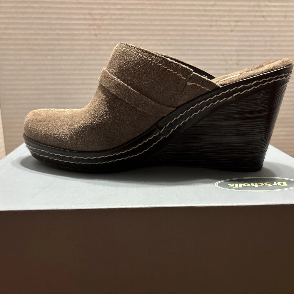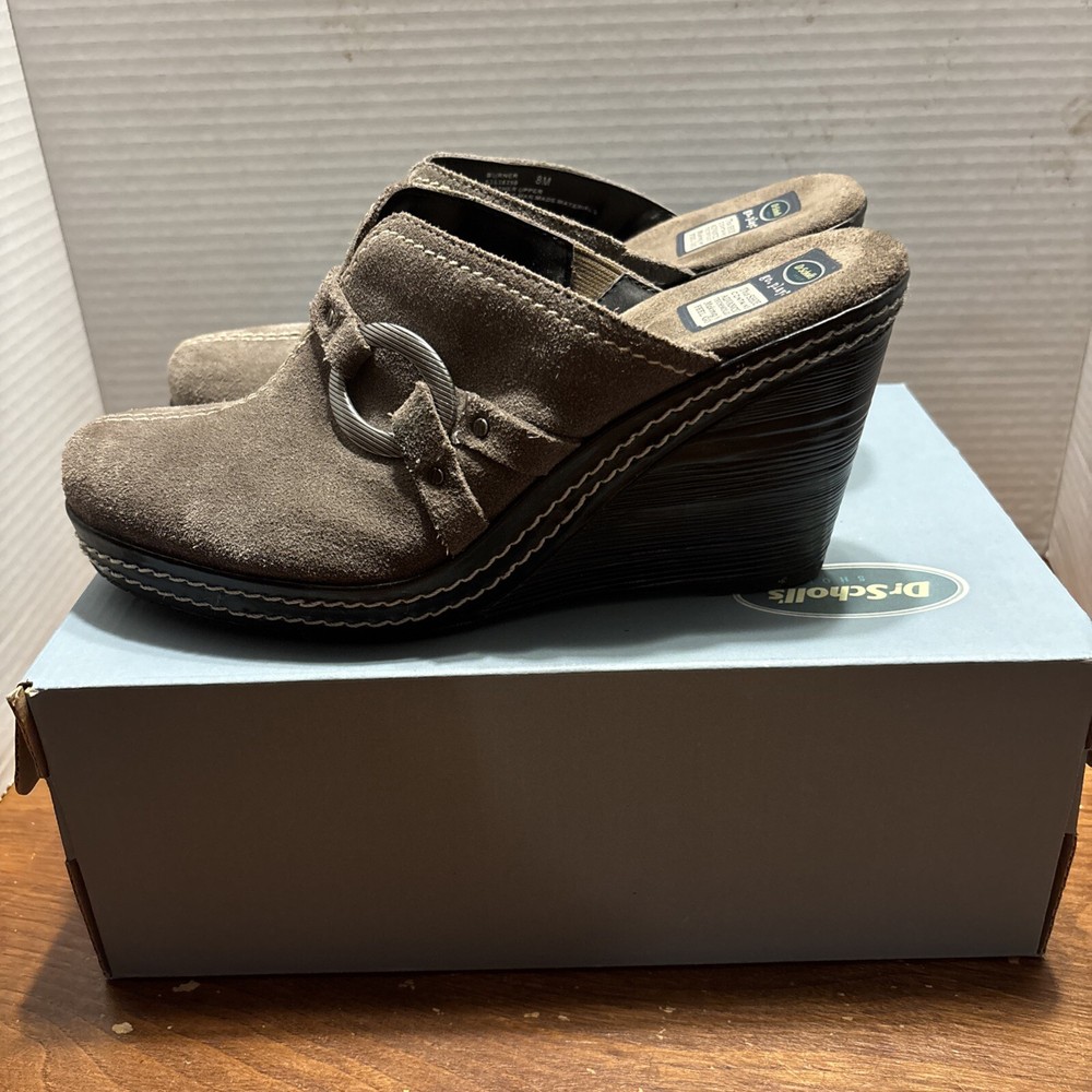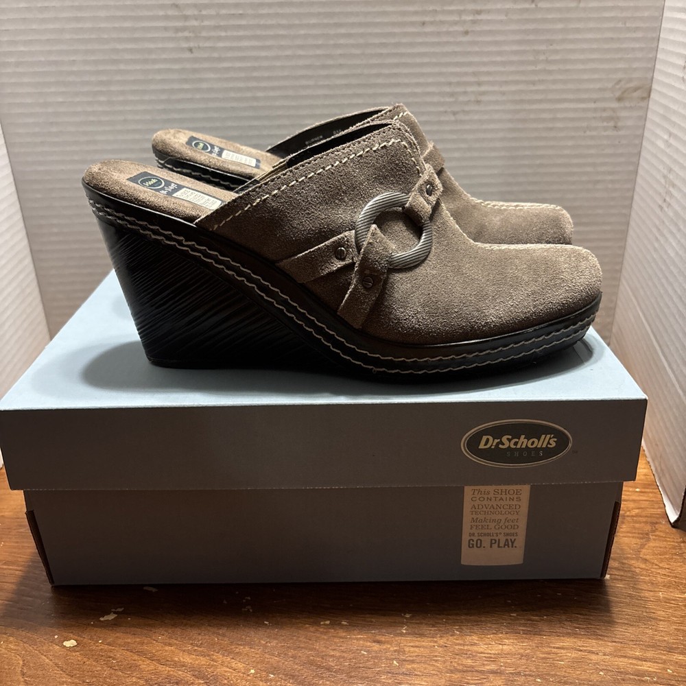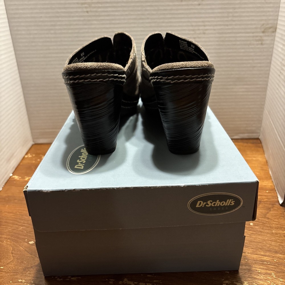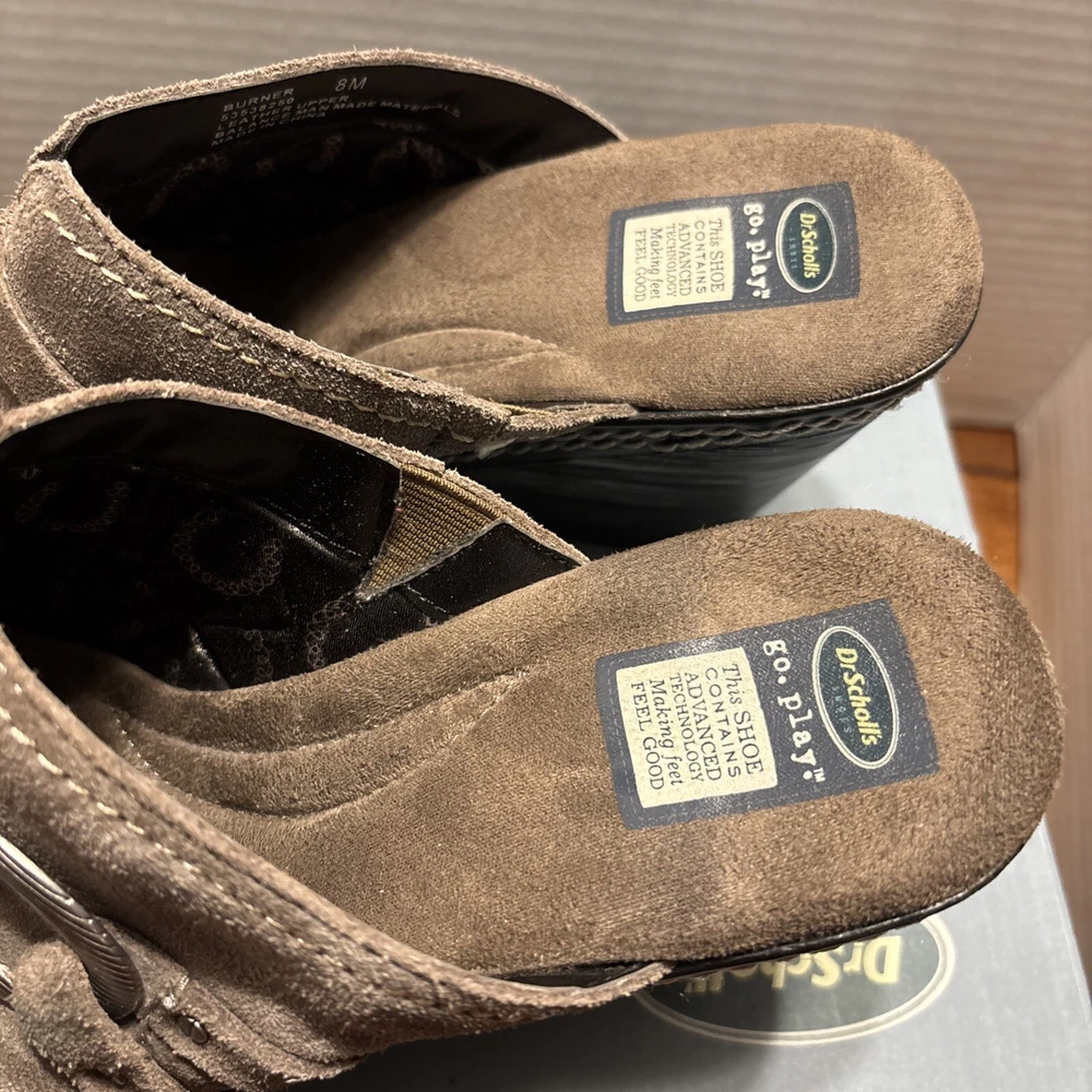These are Dr. Scholl's Burner clogs in a size 8M, designed with gray suede leather, a slip-on style, and a comfortable wedge heel. They feature textured heels, a strap with a round buckle decor, and are cushioned with memory foam for added comfort. These clogs have a Bohemian and American theme, making them a stylish and cozy choice for casual occasions. With box. Lightly worn once. EUC Like New. International charges are the buyer’s responsibility. No international returns.