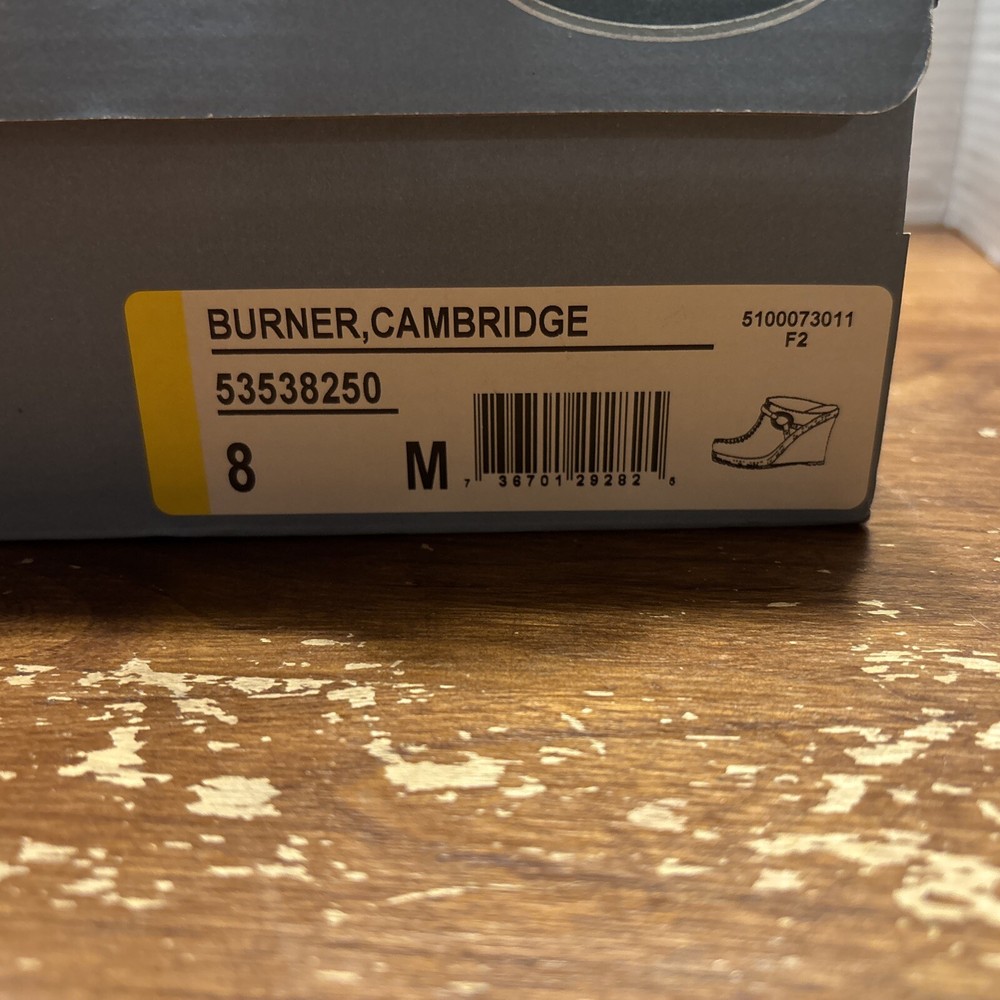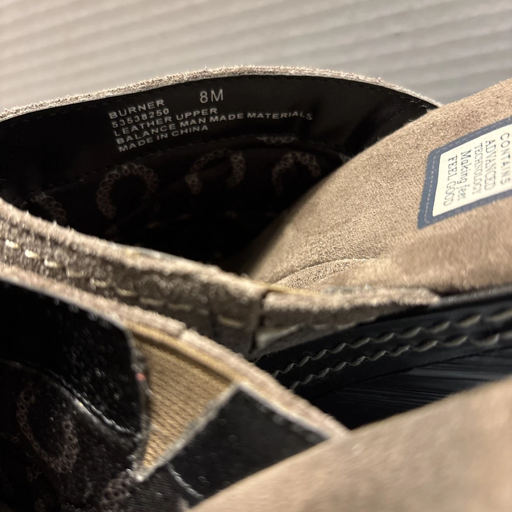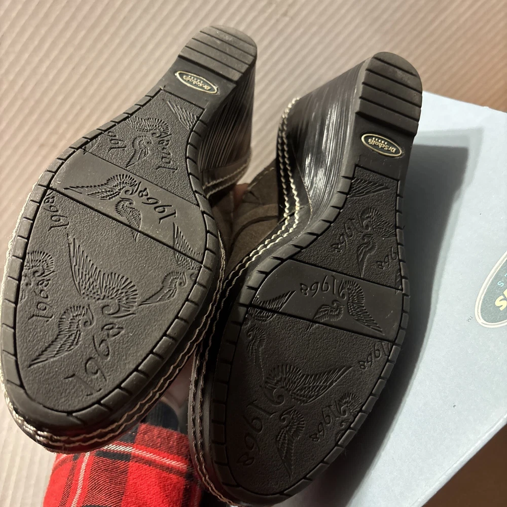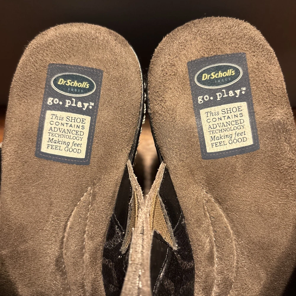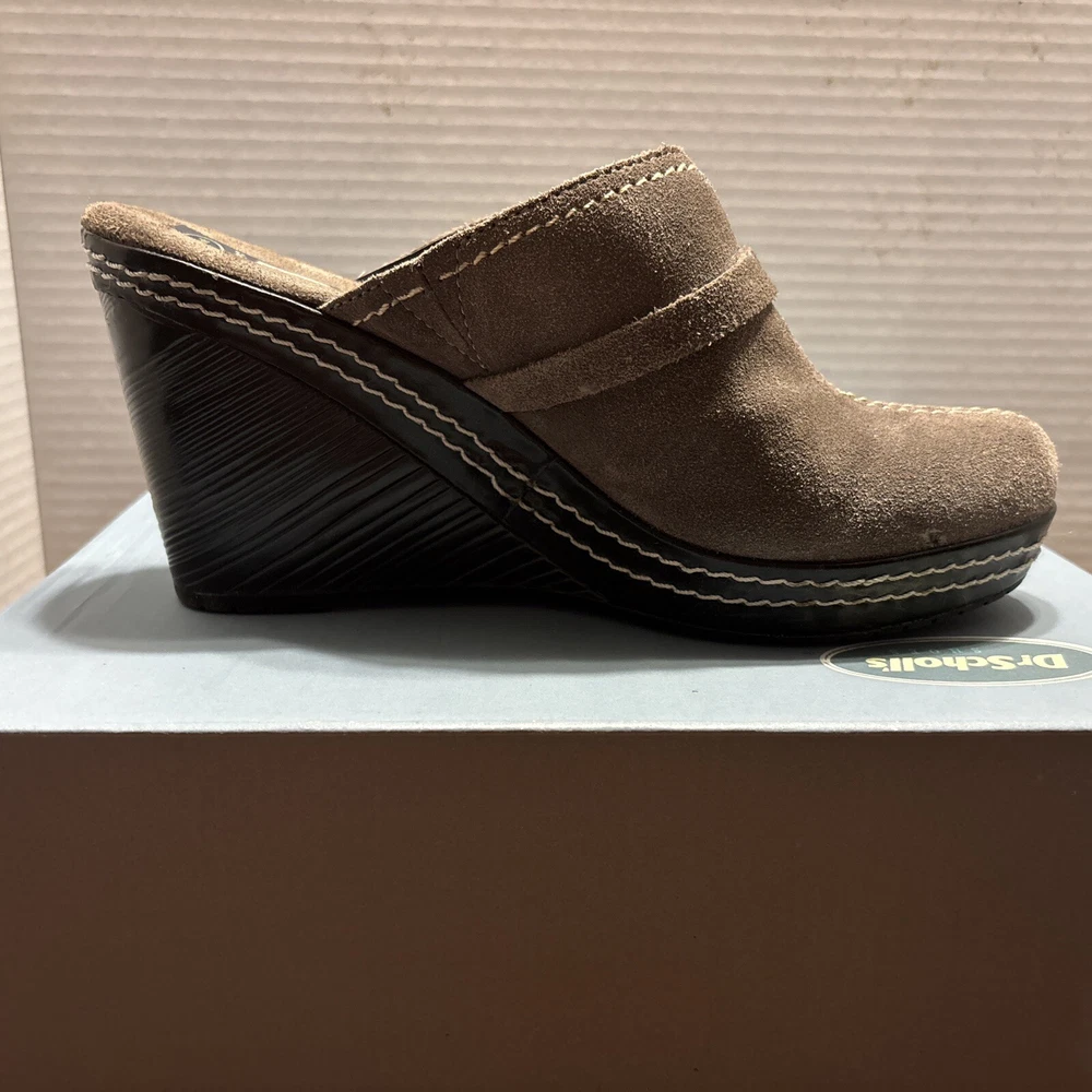 These are Dr. Scholl's Burner clogs in a size 8M, designed with gray suede leather, a slip-on style, and a comfortable wedge heel. They feature textured heels, a strap with a round buckle decor, and are cushioned with memory foam for added comfort. These clogs have a Bohemian and American theme, making them a stylish and cozy choice for casual occasions. With box. Lightly worn once. EUC Like New. International charges are the buyer’s responsibility. No international returns.
