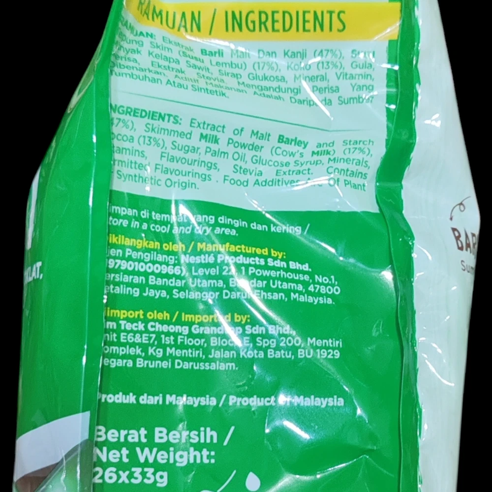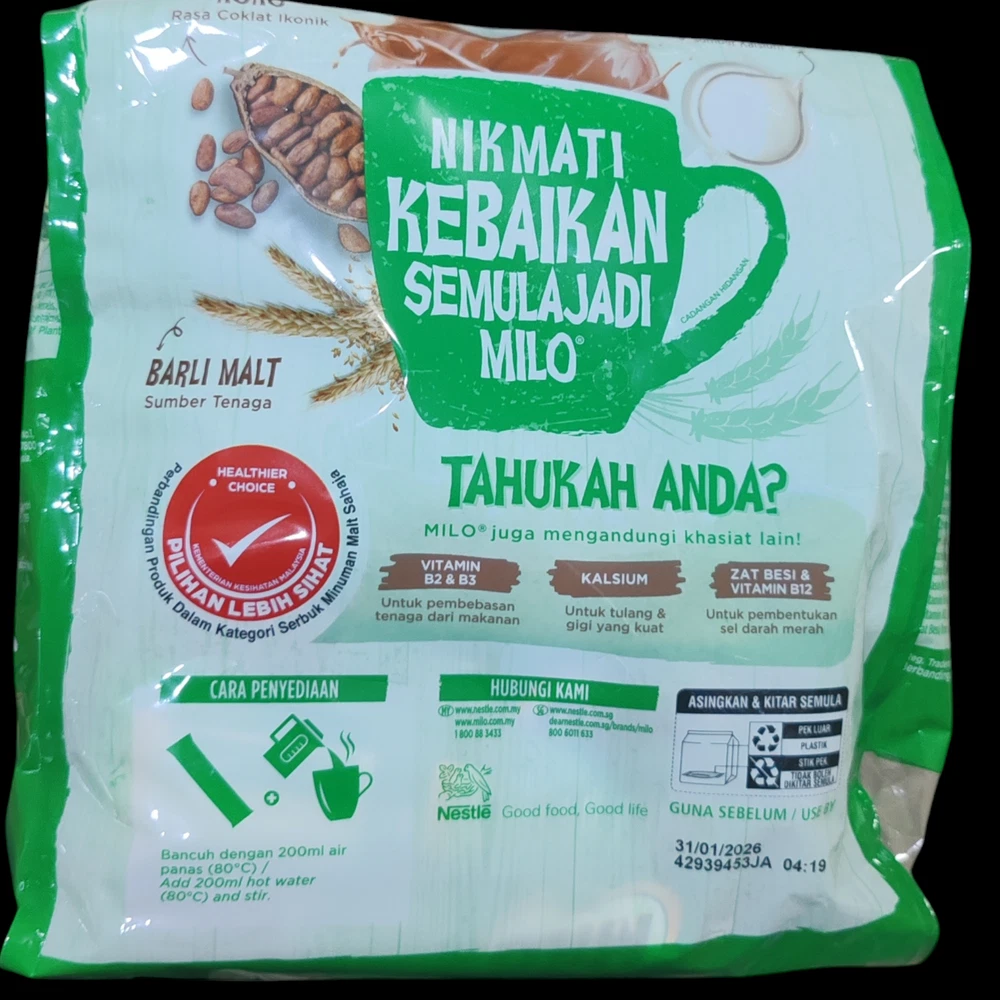 Item: Notable Item in MALAYSIAN Labels & Certifications: HALAL CERTIFICIATE MALAYSIA Style: More you Buy, Get more Taste Food Aisle: Pantry Occasion: PARTY, BIRTHDAY, BIG CEROMONY Number of Servings: 30 Calories per Serving: 145 Flavor: chocolate only Calories per 100 g/mL: DELICIOUS, SUITABLE ALL AGE, PURE MAKE COCO, FAVOURITE MALAYSIAN Course: DELICIOUS, SUITABLE ALL AGE, PURE MAKE COCO, FAVOURITE MALAYSIAN UPC: 9556001249449 Serving Size: 26 sachets Brand: Milo Product: Hot Chocolate & Malted Drink Item Weight: 858g Cocoa Content: 86% & Over Country/Region of Manufacture: Malaysia Regional Cuisine/Region: Taste Malaysia SHIP FROM MALAYSIAN: FREE SHIPPING, CHARGE INCLUDED PRICE IN SET Symbol Seller: Purchase Extra Item, Save Customer Money fit Duration Waiting Product Name: NESTLE MILO Number in Pack: 1 set in 2 packs bag Food Specifications: Halal Expiration Date: list on item Allergens: FREE ALERGENS Type: Chocolate Drink gtin13: 9556001249449
