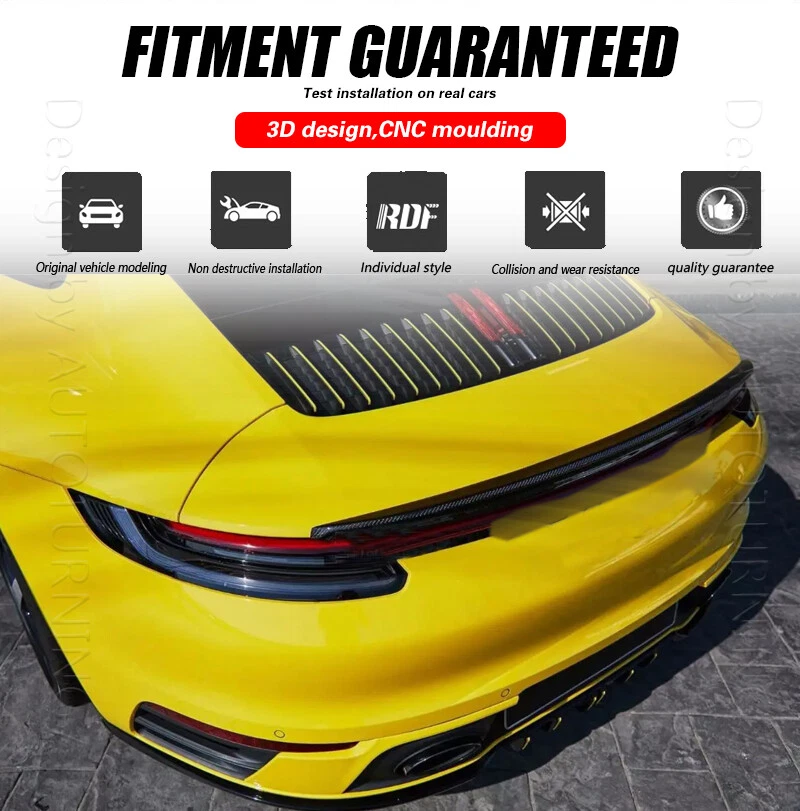 Fitment: Fits for Porsche 911 992 Carrera 4 S 4S Targa 4S 2-Door 2019-2020 Specifications: Product Name: Rear Spoiler Material: Carbon Fiber Size: Length: 116.6cm Features: Made of High Quality Lightweight Carbon Fiber. Latest Design GT Wing Spoiler Completed Kit, Improve Handling And Make Tail More Stable in High Speed. Water Transfer Carbon Fiber for Highest Durability and Appearances. Adjustable Angles for Customizable Usages and Efficiencies, Enhances Aerodynamic. Reduces Drag, Increases Fuel Efficiency, Reinforces Downforce, Traction and Stability. Double-sided adhesive paste, Easy to Install. Package included: 1 x Spoiler with self-adhesive glue tape Carbon Fiber Spoiler FOR Porsche The Rear Trunk Spoiler is one of the simplest mods you can do to the exterior of your car that will give your car that completely different look. Not only are spoilers meant for great looks, they also help with the aero dynamics of the car by lowering drag, or helping to put more downforce on the car making sure that the wheels stay grounded for maximum traction. Fitment: Fits for Porsche 911 992 Carrera 4 S 4S Targa 4S 2-Door 2019-2020 Specifications: Product Name: Rear Spoiler Material: Carbon Fiber Size: Length: 116.6cm Features: Made of High Quality Lightweight Carbon Fiber. Latest Design GT Wing Spoiler Completed Kit, Improve Handling And Make Tail More Stable in High Speed. Water Transfer Carbon Fiber for Highest Durability and Appearances. Adjustable Angles for Customizable Usages and Efficiencies, Enhances Aerodynamic. Reduces Drag, Increases Fuel Efficiency, Reinforces Downforce, Traction and Stability. Double-sided adhesive paste, Easy to Install. Package included: 1 x Spoiler with self-adhesive glue tape Delivery details Payment and TAX Return Policy Warranty Contact us Delivery details NOTE: The shipping fee is only for the mainland of each country, it does not include the overseas territories, such as Virgin Islands (U.S.) , Puerto Rico, Hawaii , French Reunion Island, etc. But on ebay, when buyers from Puerto Rico and overseas territories , the shipping fee is equal to United States, it is NOT correct,. please contact us for correct shipping fee, or we will cancel the order. Sorry for the inconvenience, and thanks for your cooperation. 1. Item will be shipped in 10 days, most within 2 days.usually it takes 7-30 days in transit to most countries. 2. If you want to upgrade the shipping, please contact us before making payment, we will revise the shipping fee. 3. We will ship according to your Ebay address. Please make sure it is correct and include phone number for delivery. If you have any questions , please contact us, we would do our best to serve you solve the problem. Payment and TAX 1.We accept Multiple Payment Methods Available: Credit Card, Debit Card, Gift Card, Apple Pay, Goggle Pay, PayPal and PayPal Cred. 2.Please leave note for your special request (e.g. Colors or Size) in ebay note when you pay the order. 3.Your must complete the payment within 7 days or Ebay will automatically open unpaid item case For US Buyer:The invoice value of each item is less than 800USD ,so you no need to pay any tariff . NON-US Buyer Note: Most countries are tax free based on our invoices, if tax is required, which will be buyer's responsibility. Return Policy 1.Customer satisfaction is our top goal. We believe our items are so outstanding. All products are quality checked. They are new and in good condition when shipped to our customers. We are convinced you will be happy with your Purchase. 2.If product is defective or damage upon arrival, or wrong product shipped, please contact us immediately. Returns accepted within 30 days of delivery date and item must be in original new condition, not worn or altered in any way with attached tags & wrap. Otherwise deal is final. Return shipping must be paid by buyer. Please always contact us to resolve any problems, we will do our best to satisfy you. Thanks very much. Warranty 30 Days Money Back It is our goal to provide 100% satisfaction and peace of mind to our customers. If you are not satisfied with the products for any reason within 30 days of receiving the item. (Items must be not opened in their original package. Any mark of installation, mounting, cutting, scratch or using will not be allowed.) Please be free to contact us first if you have any problems.thanks. Contact us 1.We are trying our best to explain all details of the products here! If you have any question, please feel free to contact us by Ebay message, and We will get back to you within 24-48 hours. 2.Customer satisfaction is our NO.1 priority. If you are not happy with the item that you purchase, please contact us first. We will try our best to solve the problem with you.Please leave us a positive feedback if you receive the item.Please do not leave negative or neutral feedback without any contact.If you haven't received item in 30 days, please contact us and we will arrange refund.We appreciate your business.Happy Bidding & Have a nice day! 3.Working hours: From 8 a.m. to 6 p.m. from Monday to Friday. From 8 a.m. to 12 a.m. on Saturday morning Holiday/Rest time: Saturday afternoon and Sunday