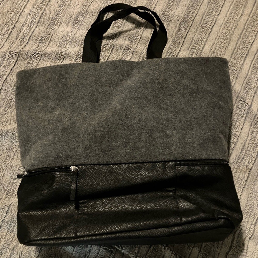 This contemporary tote bag features a striking color-block design with a heather gray upper and a sleek black bottom. Crafted with a mix of textured and smooth materials, it offers a minimalist yet stylish look. The sturdy black handle ensures comfortable carrying, making it perfect for everyday use.