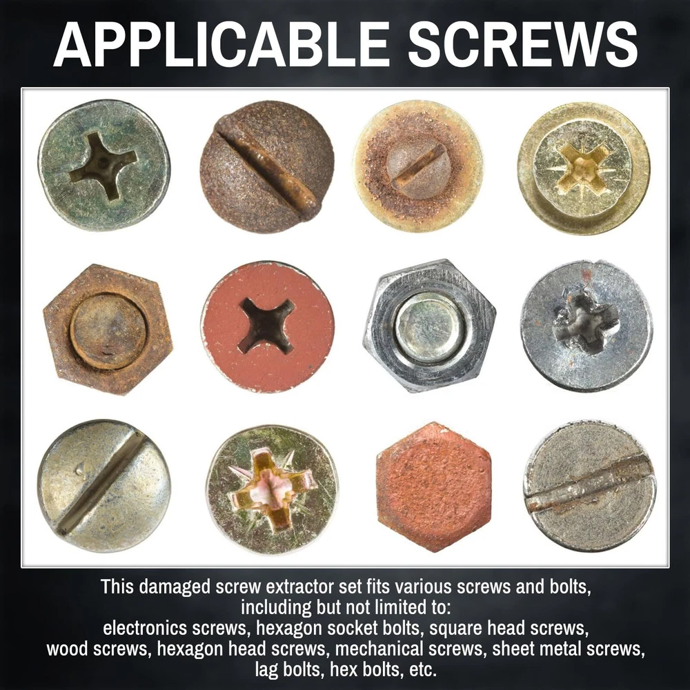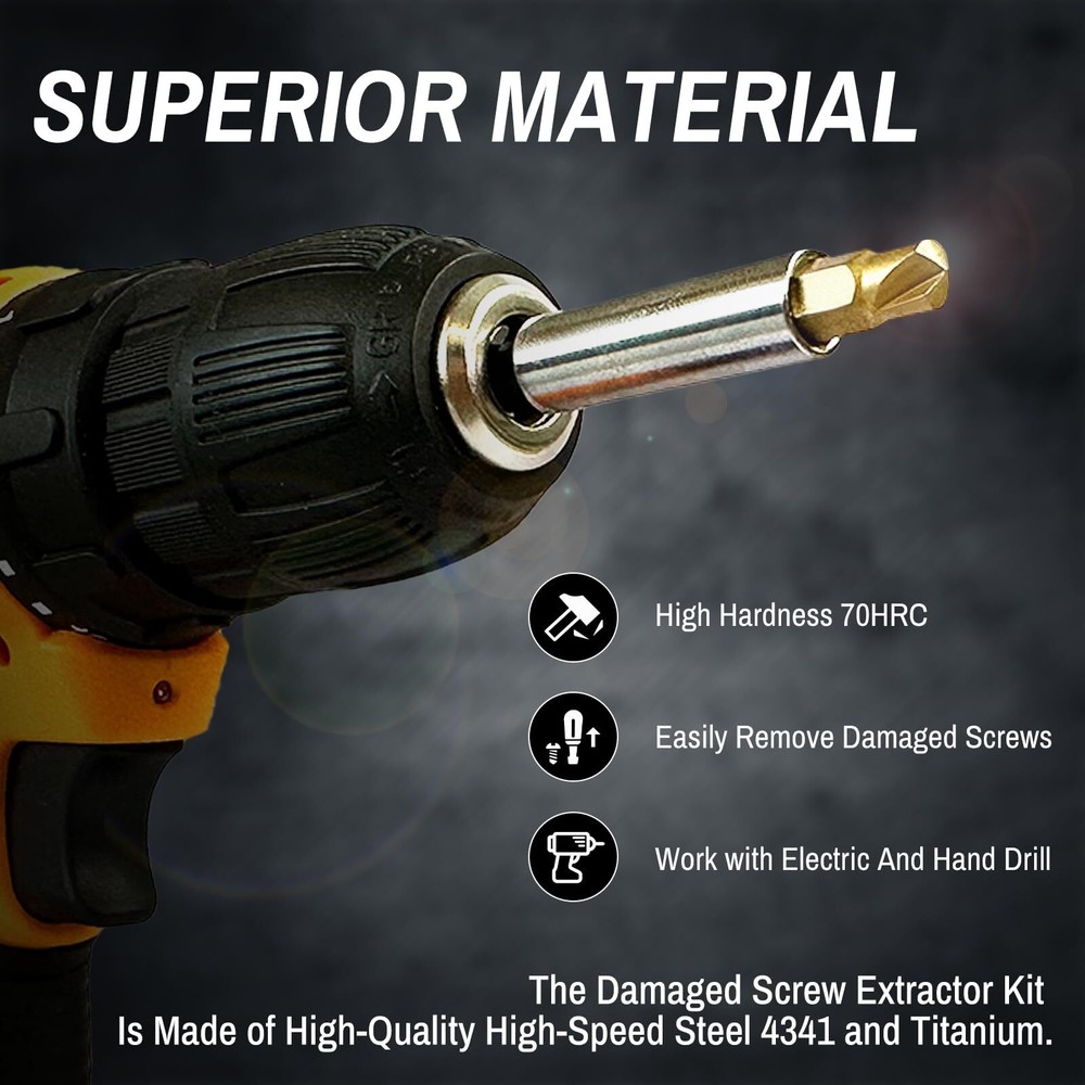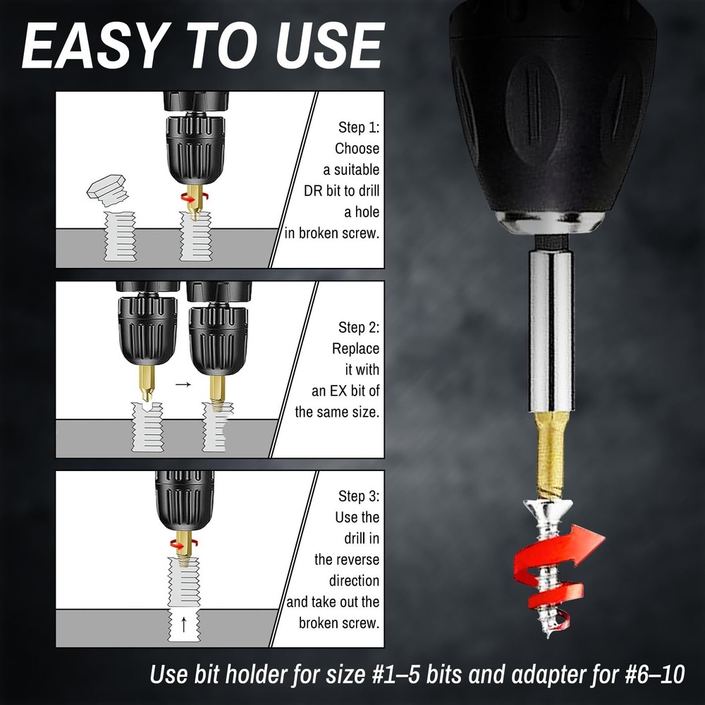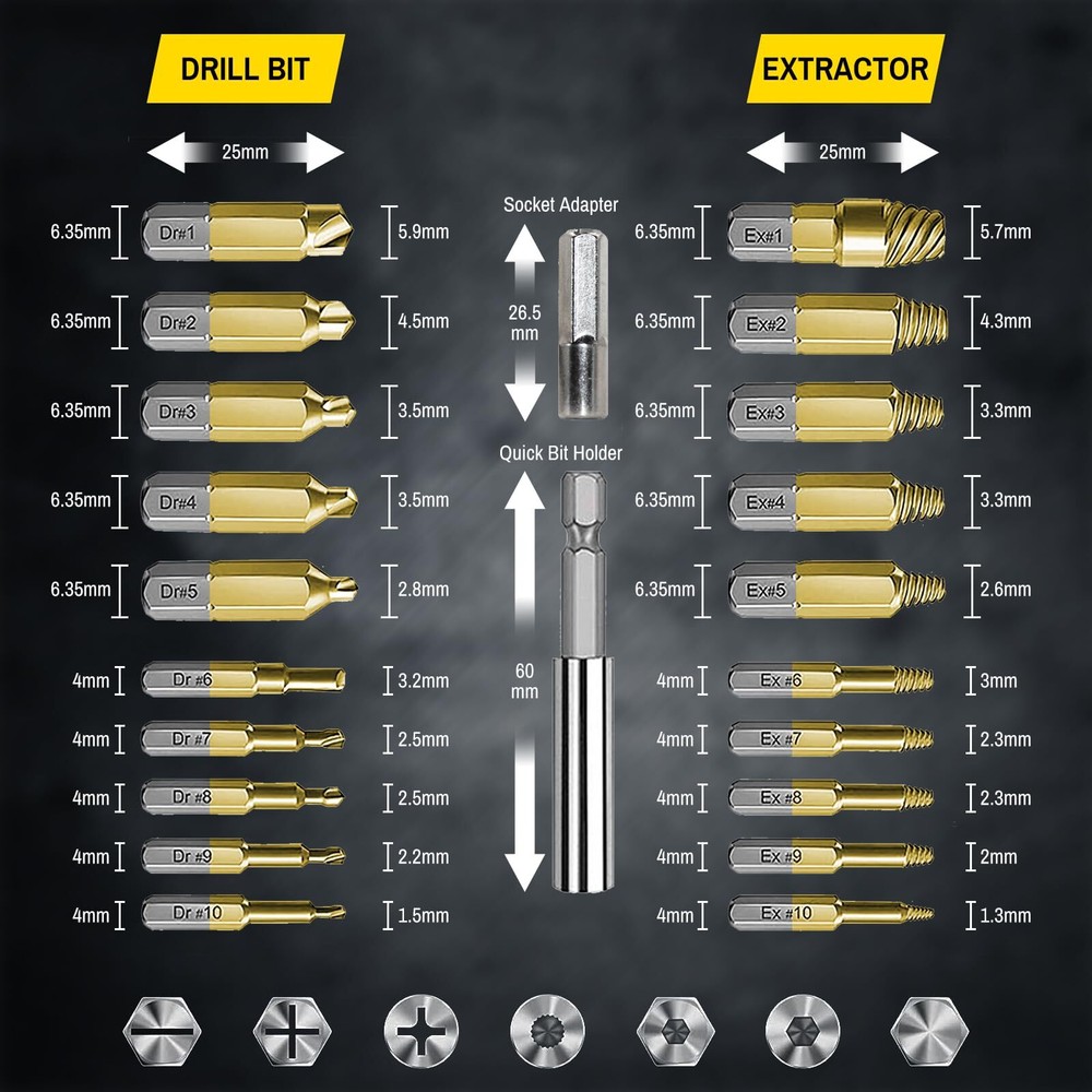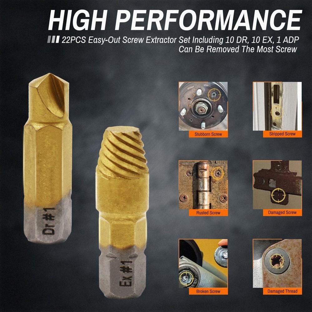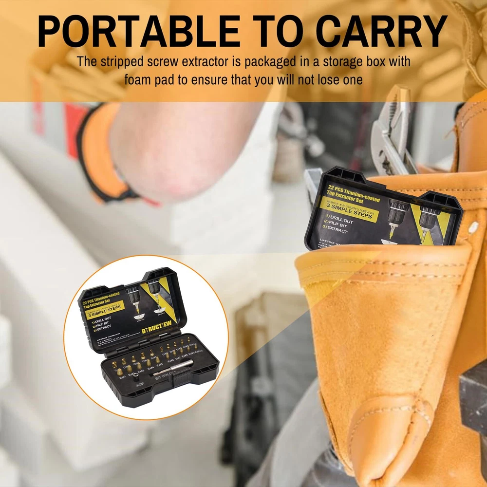 DTRUCTIEW 22PCS Titanium Damaged Screw Extractor Set, HSS 4341 Stripped Screw Extractor Kit, Easy Out Stripped Screw Extractor of Rusty & Broken with Magnetic Extension Bit Holder & Socket Adapter Superior Material: Our damaged screw extractor kit is made of high-quality high-speed Steel 4341 and Titanium. It features High hardness, is durable, and is tough enough to easily remove damaged screws and make your work more efficient. With the different size, which allows you to carry it in a pocket or with their drill. High Performance: 22Pcs easy-out screw extractor set, including 10 drills (DR), 10 extractors (EX), 1 adapter (ADP), and 1 extension bit holder, making it a conveniently comprehensive kit. Can be removed in one step, you do not need to convert the extractor or adjust the chuck. 0.05 to 0.22 inch extractors are suitable for extracting stripped, broken, or damaged screws with 0.06-0.36 inch bolts. Easy to Use:First, choose the drill bit that is smaller than the damaged screw, install the bit on the electric hand drill, and drill down to create a clean hole. Then, change to an extractor (usually the same size as the drill) that is suitable for the hole, screw in a counterclockwise rotation, and take it out. Note: The Drills (Dr#6–10) and Extractors (Ex#6–10) need a socket adapter with the extension bit holder to function. Applicable Screws: This damaged screw extractor set has 10 different sizes to satisfy all your demands. Fits various soft screws and bolts, such as tiny electronics screws, hexagon socket bolts, square head screws, wood screws, hexagon head screws, mechanical screws, sheet metal screws, lag bolts, hex bolts, etc. (Note: The screw extractor is made of high-speed steel 4341 and titanium. It is suitable for most standard screws, especially performing exceptionally well with aluminum alloy and mild steel screws. However, its effectiveness may vary when dealing with stainless steel screws) Portable to Carry: The stripped screw extractor is packaged in a storage box with foam pad to ensure that you will not lose one. The compact size allows you to carry with and use it for home DIY or garden woodwork, small household appliances, or electronics assembly. It is designed to work with the electric hand drills, can not be used in the hammer drill mode! Must be low speed during use! Superior Material: Our damaged screw extractor kit is made of high-quality high-speed Steel 4341 and Titanium. It features High hardness, is durable, and is tough enough to easily remove damaged screws and make your work more efficient. With the different size, which allows you to carry it in a pocket or with their drill. High Performance: 22Pcs easy-out screw extractor set, including 10 drills (DR), 10 extractors (EX), 1 adapter (ADP), and 1 extension bit holder, making it a conveniently comprehensive kit. Can be removed in one step, you do not need to convert the extractor or adjust the chuck. 0.05 to 0.22 inch extractors are suitable for extracting stripped, broken, or damaged screws with 0.06-0.36 inch bolts. Easy to Use:First, choose the drill bit that is smaller than the damaged screw, install the bit on the electric hand drill, and drill down to create a clean hole. Then, change to an extractor (usually the same size as the drill) that is suitable for the hole, screw in a counterclockwise rotation, and take it out. Note: The Drills (Dr#6–10) and Extractors (Ex#6–10) need a socket adapter with the extension bit holder to function. Applicable Screws: This damaged screw extractor set has 10 different sizes to satisfy all your demands. Fits various soft screws and bolts, such as tiny electronics screws, hexagon socket bolts, square head screws, wood screws, hexagon head screws, mechanical screws, sheet metal screws, lag bolts, hex bolts, etc. (Note: The screw extractor is made of high-speed steel 4341 and titanium. It is suitable for most standard screws, especially performing exceptionally well with aluminum alloy and mild steel screws. However, its effectiveness may vary when dealing with stainless steel screws) Portable to Carry: The stripped screw extractor is packaged in a storage box with foam pad to ensure that you will not lose one. The compact size allows you to carry with and use it for home DIY or garden woodwork, small household appliances, or electronics assembly. It is designed to work with the electric hand drills, can not be used in the hammer drill mode! Must be low speed during use! Shipping from the USA All of our products are shipped from the USA, ensuring quick delivery to your destination. Payment We offer the following payment methods: PayPal, credit card, bank transfer, and eBay's secure payment system. Free Shipping & Free Returns Shipping within the USA is FREE. Additionally, any return is absolutely free for you. Risk-Free Purchase You have the option to return an item within 30 days without any justification. We cover the return shipping costs! Fast Shipping We ship immediately upon receipt of payment. Generally, the package is delivered within 2-3 days in the USA. If it takes longer, we will contact you. Quality and Costs Made in Europe, USA, China No customs fees or additional charges Total satisfaction guarantee Invoice with declared VAT available upon request in .pdf format Feedback Your feedback is very important to us. After you pay for your purchase, you will automatically receive positive feedback from us.