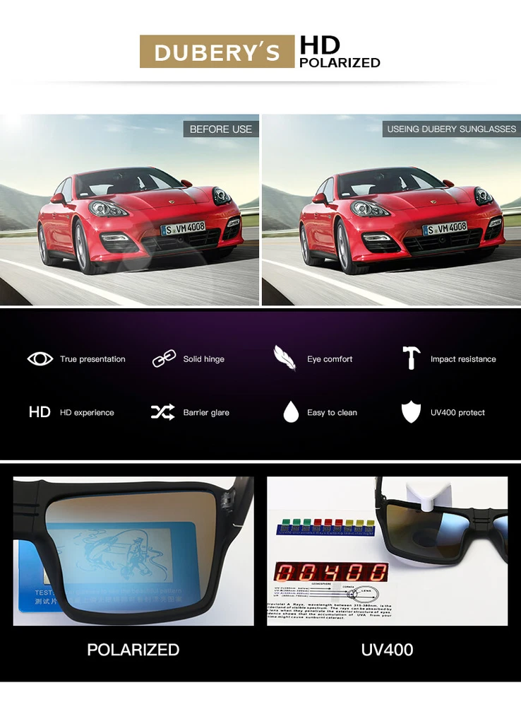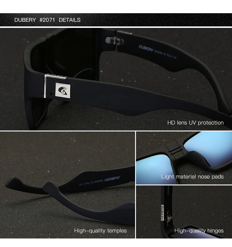 DUBERY Unisex Polarized Square Sunglasses Oversize Driving Fishing Sport Glasses Description Brand: DUBERY Condition: New without Tags Frame Material : Plastic Lens Material:TAC Anti-UV rating: UV400 Whether polarized : Yes. Gender: Men/Women Lens width: about 58 mm Lens height: about 52 mm Bridge: about 18 mm Frame Width: about 137 mm Temple Length: about 129 mm Package included 1* Sunglasses(Not include boxes and other accessories) Note: 1. Due to the different monitor and light effect, the actual color of the item might be slightly different from the color showed on the pictures. Thank you! 2. Please allow 1-3mm measuring deviation due to manual measurement ! Features Oversized, Reflective UV Protection UV400 MPN Does Not Apply Department Unisex Adults Frame Color Multicolor Frame Material Plastic Country/Region of Manufacture China Model D729 Brand DUBERY Lens Material Mirror, TAC Style Square Personalized No Lens Technology Polarized Theme Classic, Designer, Logo, Outdoor, Sports Type Sunglasses Temple Length 129 mm