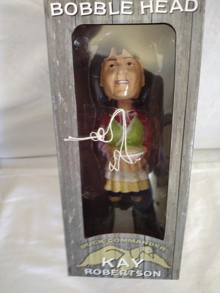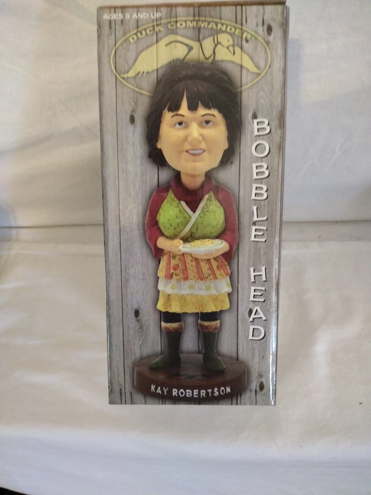 This duck dynasty bobble head features Kay Robertson and is a must-have for any fan of the popular TV show. The item measures 8 inches in length and comes in its original box, making it a great addition to any collection. Whether you're a hunter or just a fan of the show, this bobble head is sure to be a conversation starter. The duck dynasty bobble head is perfect for those who love to collect unique items or for those who want to show off their love for the popular TV show. Its intricate details and high-quality design make it a great piece to display in any room. Get yours today and add a touch of fun to your collection!