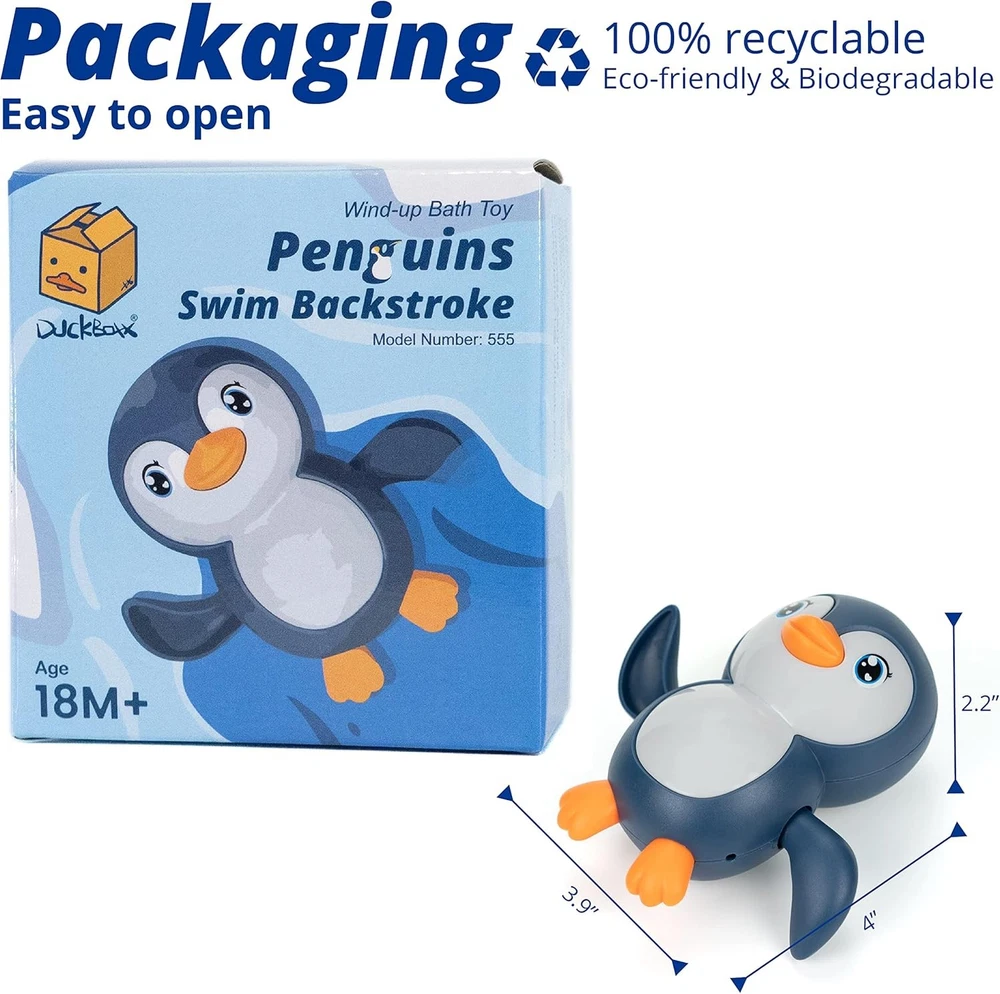 DUCKBOXX XX Bath Toys Wind up Backstroke Swimming Penguins for Kids 18M+ Blue Product Details Product Dimensions: 3.9 x 2.4 x 4.3 inches Item Weight: 2.89 ounces Country of Origin: China Item model number: 555 Manufacturer recommended age: 18 months - 6 years Manufacturer: DUCKBOXX XX Wind-up! See Penguins swimming around you. It runs about 25s if wind up for 3-4 circles at one time and 30 seconds for wind up fully. Normally, Kids 2+ could wind on her own. Made from ABS, non-toxic, durable. Perfect for kid's Christmas gifts, birthday presents. Help kids understand knowledge of physical buoyancy and develop their hand-eye coordination, dexterity, motor skill. Circular arc design and smooth edges. Recommended for ages 18 months and up. Wind-up bath toys, Made from ABS, non-toxic, ages 18M+.