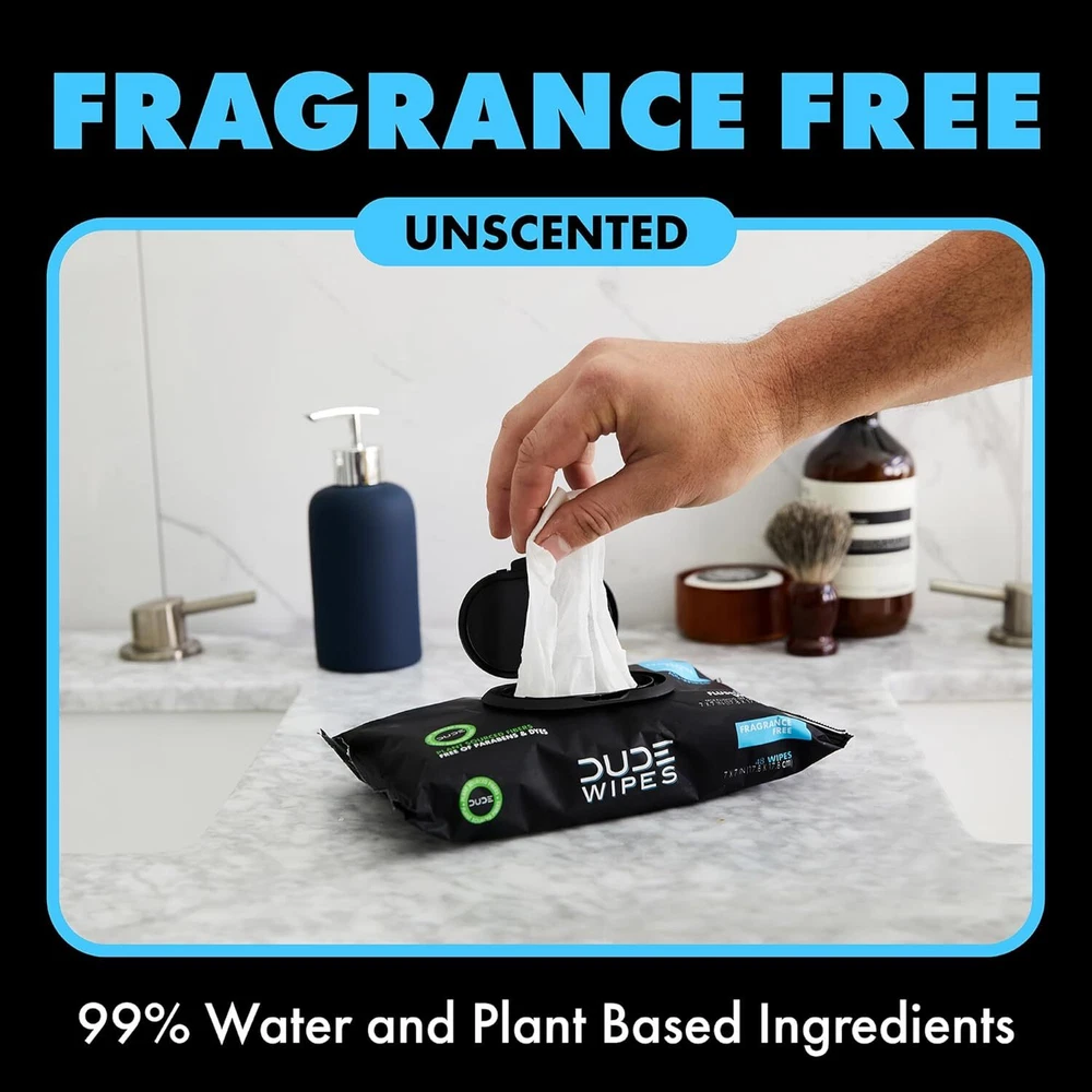 Send toilet paper back to the Stone Age where it belongs with DUDE Wipes at home packs. Our easy dispensers serve you flushable wipes that are extra large to tackle any job your butt or DUDE regions require. Made with 99% water and plant-based ingredients, including Aloe Vera and Vitamin E, DUDE Unscented Wipes are gentle on your skin and will clear instead of smear, leaving you feeling refreshed and ready for whatever the day brings. Traveling or on the go? Don't get caught with your pants down away from home, travel DUDE-style with our individually-wrapped wipes to keep your DUDE parts fresh wherever you go.