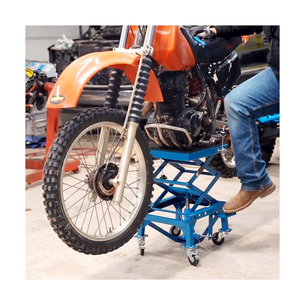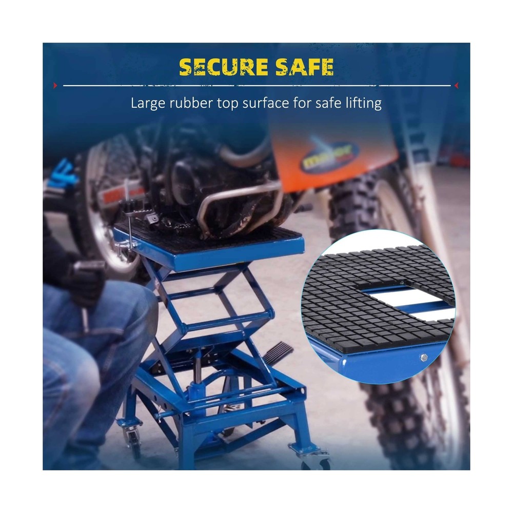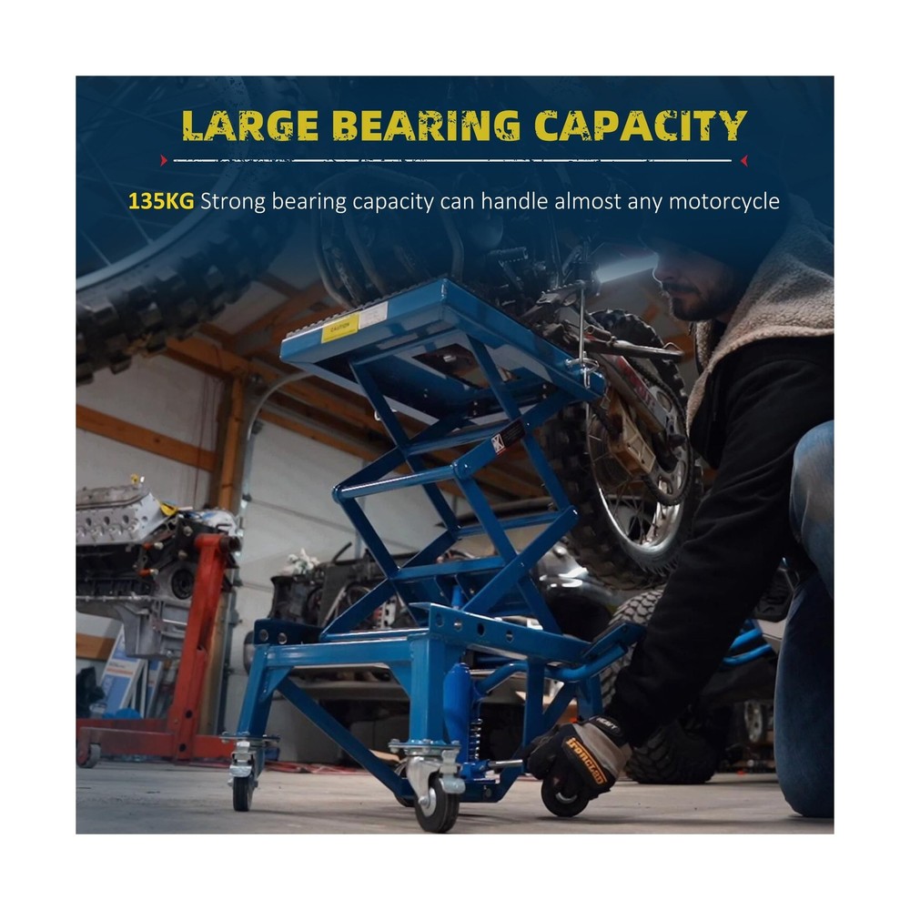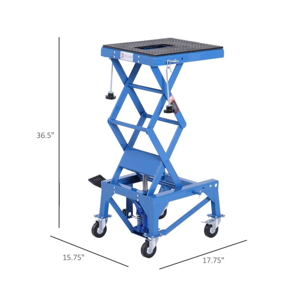DURHAND 300 lbs Hydraulic Motorcycle Scissor Jack Lift Foot Step Wheels for Small Dirt Bikes Description Features: Secure Elevation: A must-have for sport or dirt bike enthusiasts. When extended, the large rubber top surface holds the wheels securely off of the ground to allow for easy access for maintenance and repairs, while also folding away for convenient storage Security Foot Step Lever: The large foot step lever design helps avoid pinched fingers and strained shoulders from lifting your bike. The motorcycle stands allow you to lift your bike with ease Solid Construction: The solid high-grade steel frame creates a strong, stable platform for your motorbike during maintenance or storage. A gap in the platform provides access to your oil pan for home maintenance and oil changes Portable Convenience: Compact size and manageable weight allow for this motorcycle stand lift to be transported and moved whenever needed on its 4 rubber wheels, 2 of which are lockable for when working on your bike Non-Slip Design: Non-skid rubber padding on the top surface will keep your bike from slipping during maintenance and storage and securely holds up to 300 pounds Product Details: Load Capacity: 300 pound Maximum Lifting Height: 35.50 Brand: DURHAND Color: Blue Item dimensions L x W x H: 17.75 x 15.75 x 36.5 inches Load Capacity: 300 pound Maximum Lifting Height: 35.50 Brand: DURHAND Color: Blue Item dimensions L x W x H: 17.75 x 15.75 x 36.5 inches Style: Scissor Jack Manufacturer: Aosom LLC UPC: 842525131803 Model: Motorcycle Lift Stand Item Weight: 59.8 pounds Product Dimensions: 17.75 x 15.75 x 36.5 inches Item model number: C30-009 Manufacturer Part Number: USC30-0090131 Special Features: Extendable Date First Available: January 18, 2019 Delivery We Do Not Ship Outside of the Continental US. Return Policy All items qualify for returns within 30 days of receipt. Seller is responsible for return shipping on any item that is not damaged. Feedback We take our reputation seriously, we buy and sell online, so we understand the value of trust. If you are unsatisfied with your order, please contact us and we will work with you to resolve it to your satisfaction.