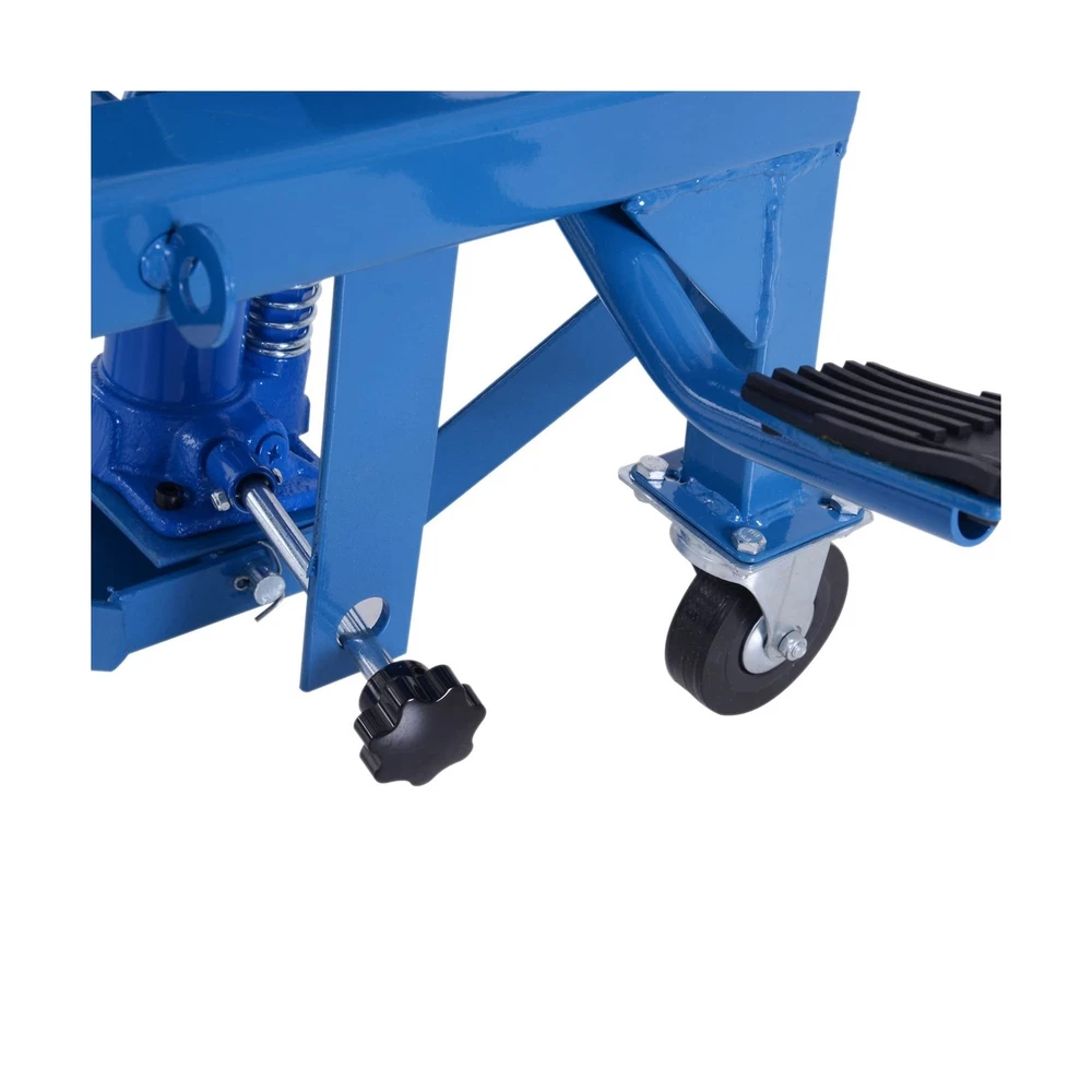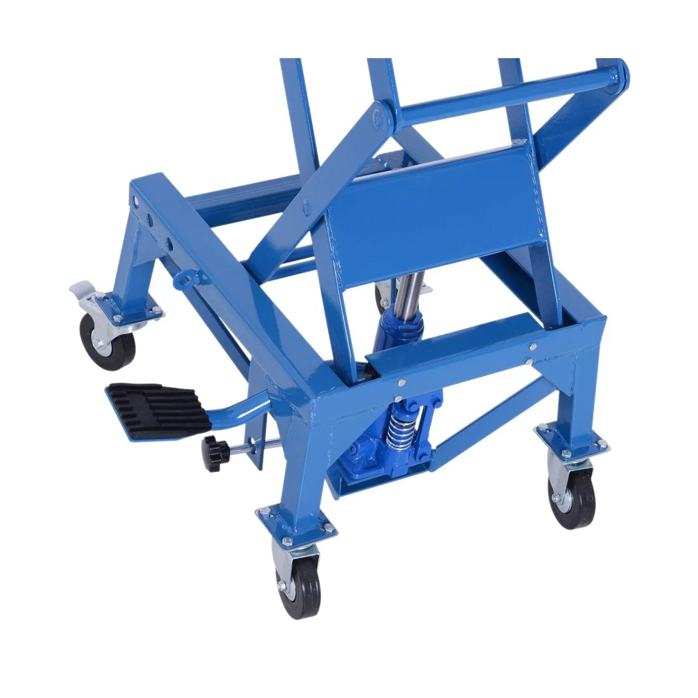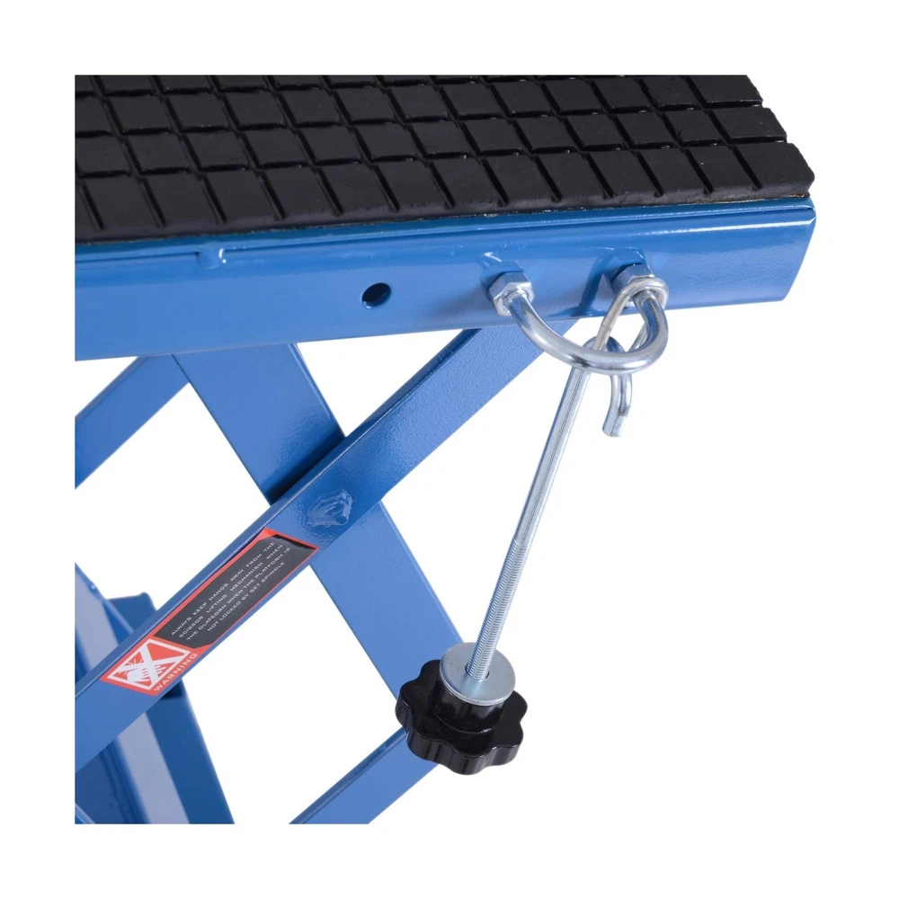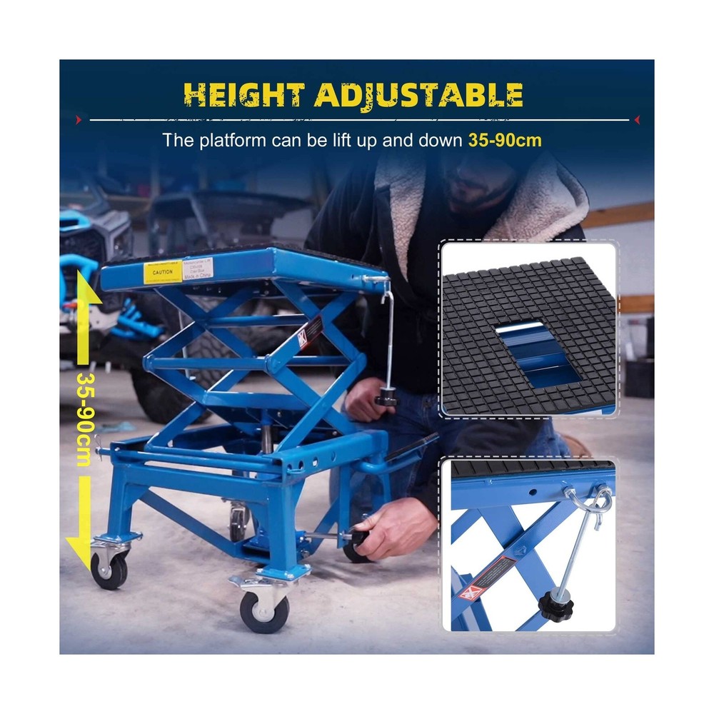 DURHAND 300 lbs Hydraulic Motorcycle Scissor Jack Lift Foot Step Wheels for Small Dirt Bikes Description Features: Secure Elevation: A must-have for sport or dirt bike enthusiasts. When extended, the large rubber top surface holds the wheels securely off of the ground to allow for easy access for maintenance and repairs, while also folding away for convenient storage Security Foot Step Lever: The large foot step lever design helps avoid pinched fingers and strained shoulders from lifting your bike. The motorcycle stands allow you to lift your bike with ease Solid Construction: The solid high-grade steel frame creates a strong, stable platform for your motorbike during maintenance or storage. A gap in the platform provides access to your oil pan for home maintenance and oil changes Portable Convenience: Compact size and manageable weight allow for this motorcycle stand lift to be transported and moved whenever needed on its 4 rubber wheels, 2 of which are lockable for when working on your bike Non-Slip Design: Non-skid rubber padding on the top surface will keep your bike from slipping during maintenance and storage and securely holds up to 300 pounds Product Details: Load Capacity: 300 pound Maximum Lifting Height: 35.50 Brand: DURHAND Color: Blue Item dimensions L x W x H: 17.75 x 15.75 x 36.5 inches Load Capacity: 300 pound Maximum Lifting Height: 35.50 Brand: DURHAND Color: Blue Item dimensions L x W x H: 17.75 x 15.75 x 36.5 inches Style: Scissor Jack Manufacturer: Aosom LLC UPC: 842525131803 Model: Motorcycle Lift Stand Item Weight: 59.8 pounds Product Dimensions: 17.75 x 15.75 x 36.5 inches Item model number: C30-009 Manufacturer Part Number: USC30-0090131 Special Features: Extendable Date First Available: January 18, 2019 Delivery We Do Not Ship Outside of the Continental US. Return Policy All items qualify for returns within 30 days of receipt. Seller is responsible for return shipping on any item that is not damaged. Feedback We take our reputation seriously, we buy and sell online, so we understand the value of trust. If you are unsatisfied with your order, please contact us and we will work with you to resolve it to your satisfaction.
