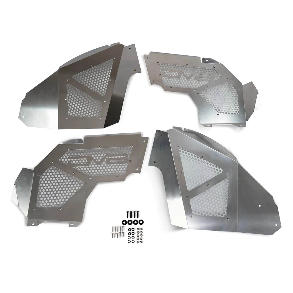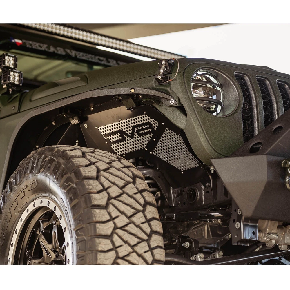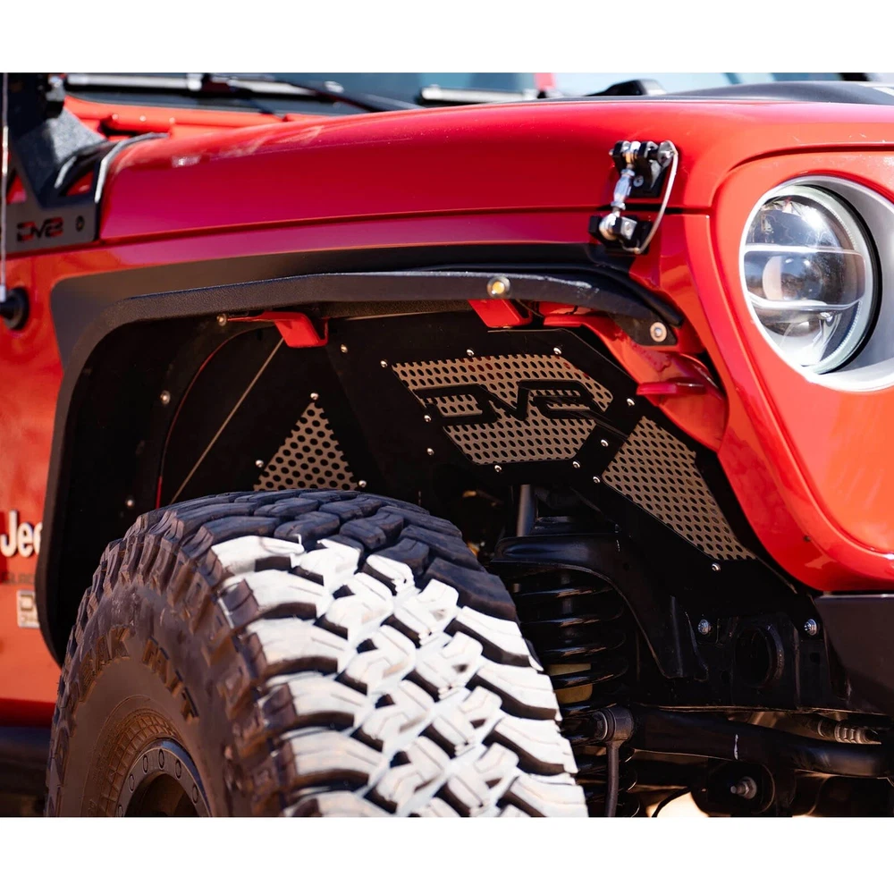 $ImageURL1$ DV8 Offroad Front Inner Black Fenders for Wrangler JL Gladiator JT INFEND-03FB PART NUMBER: INFEND-03FB BRAND: DV8 Offroad DESCRIPTION DV8 Offroad Front Inner Fenders DV8 Off Road Aluminum Jeep Wrangler JL & Gladiator Inner Fenders are designed to reseal your engine compartment when using aftermarket or stock fenders, clean up the look of your inner fender, and provide better air flow where it counts. Their inner fenders also allow easy access to the shocks and do not require for the fender and inner fender to be removed like their competitors! DV8 Inner fenders are available in raw aluminum or powder coated black. Key Features: Lightweight aluminum Mesh panels to improve airflow Paintable aluminum mesh panels Protects the engine compartment Simple installation Specifications: Fitment: Direct Fit, Bolt-On Finish: Black Powder Coat OR Raw Aluminum, the choice is yours! Material: Aluminum