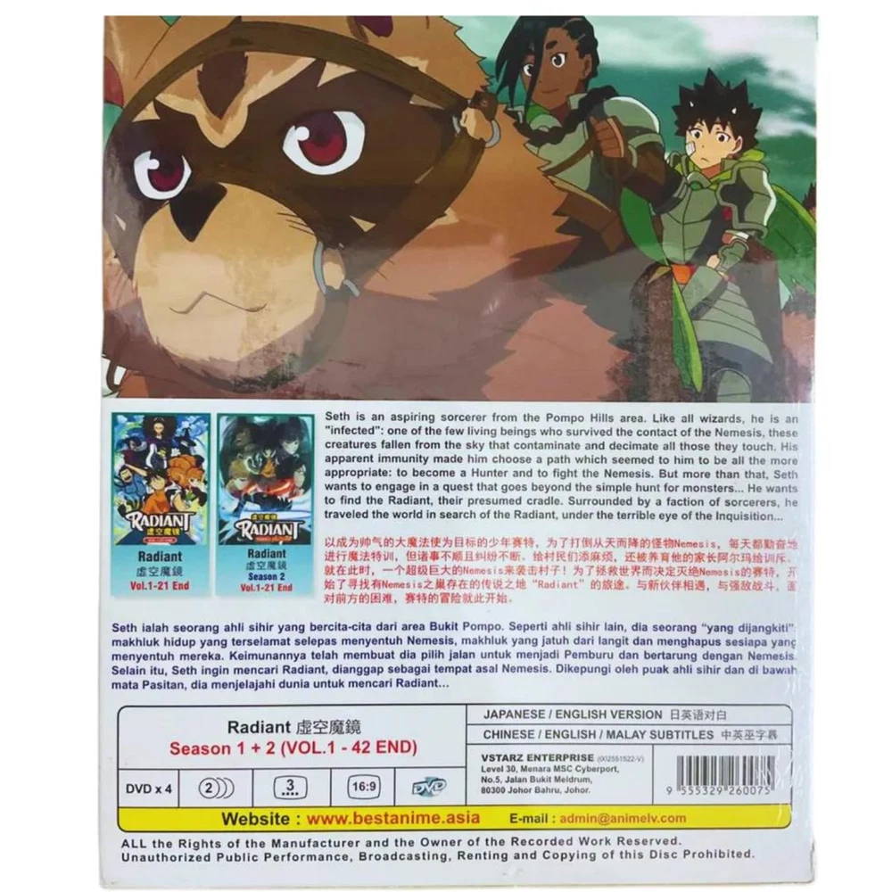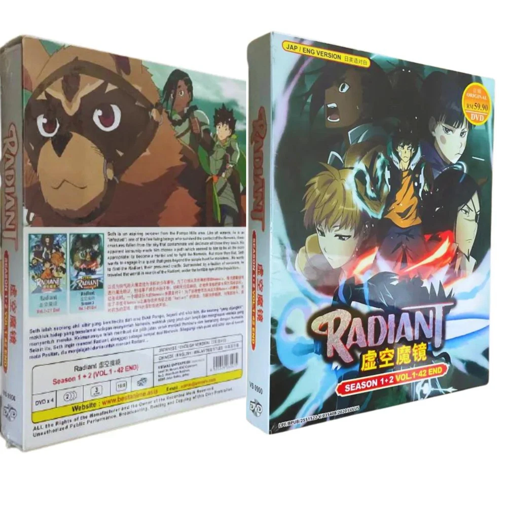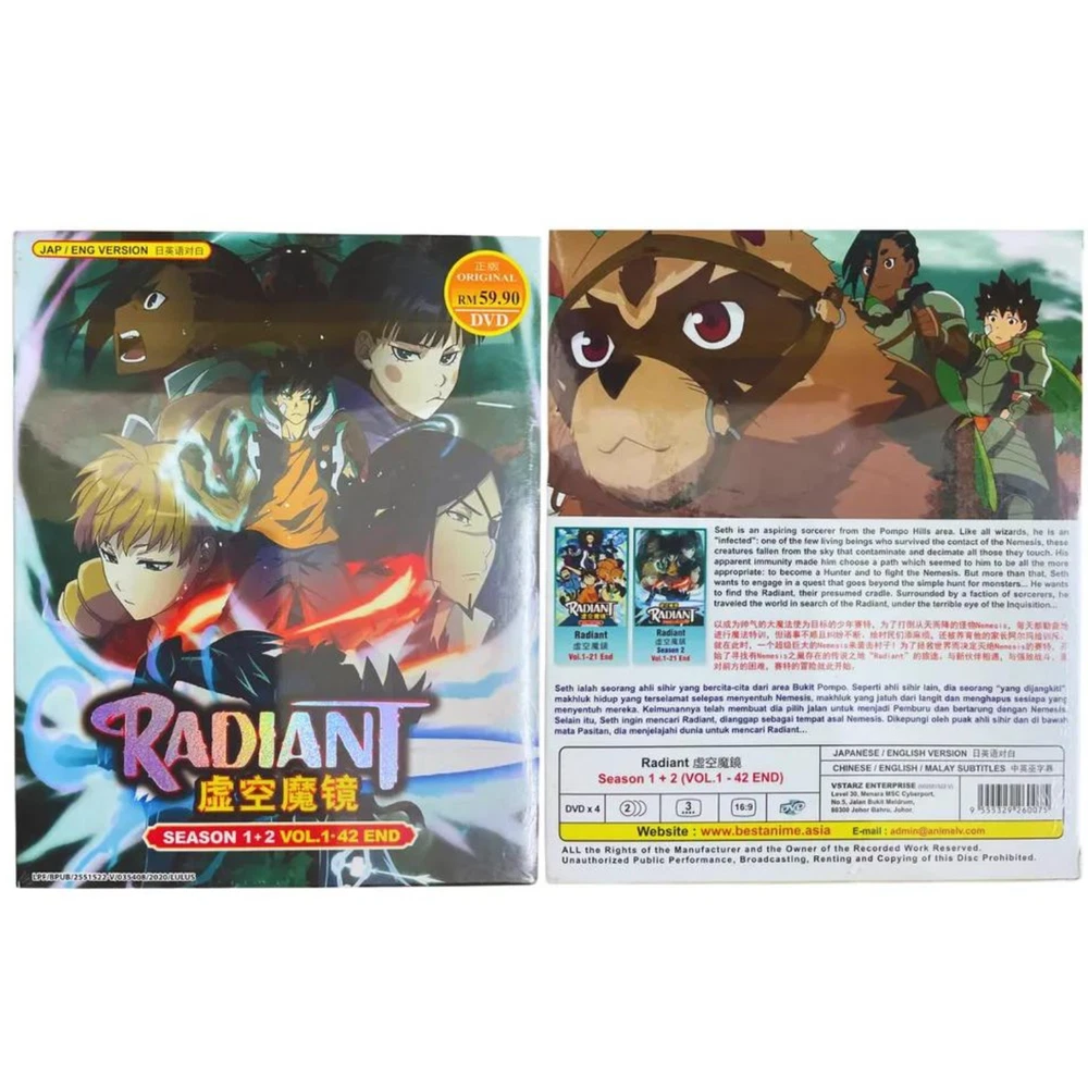 Language: Japanese, English Region Code: DVD: 0/All (Region Free/Worldwide) Movie/TV Title: RADIANT SEASON 1-2 Format: DVD Actor: N/A Director: N/A Studio: Lerche UPC: Does not apply Edition: Box Set Genre: Action, Adventure, Animation, Anime, Fantasy Sub-Genre: Japanese Release Year: 2020 Rating: PG gtin13: Does not apply Subtitle Language: Chinese, English Features: Dubbed, With Subtitles Season: 1, 2, Complete Series Box Set Franchise: N/A Type: TV Series Country/Region of Manufacture: Malaysia