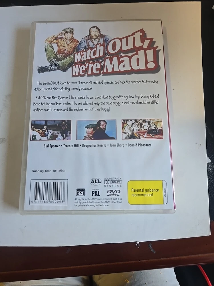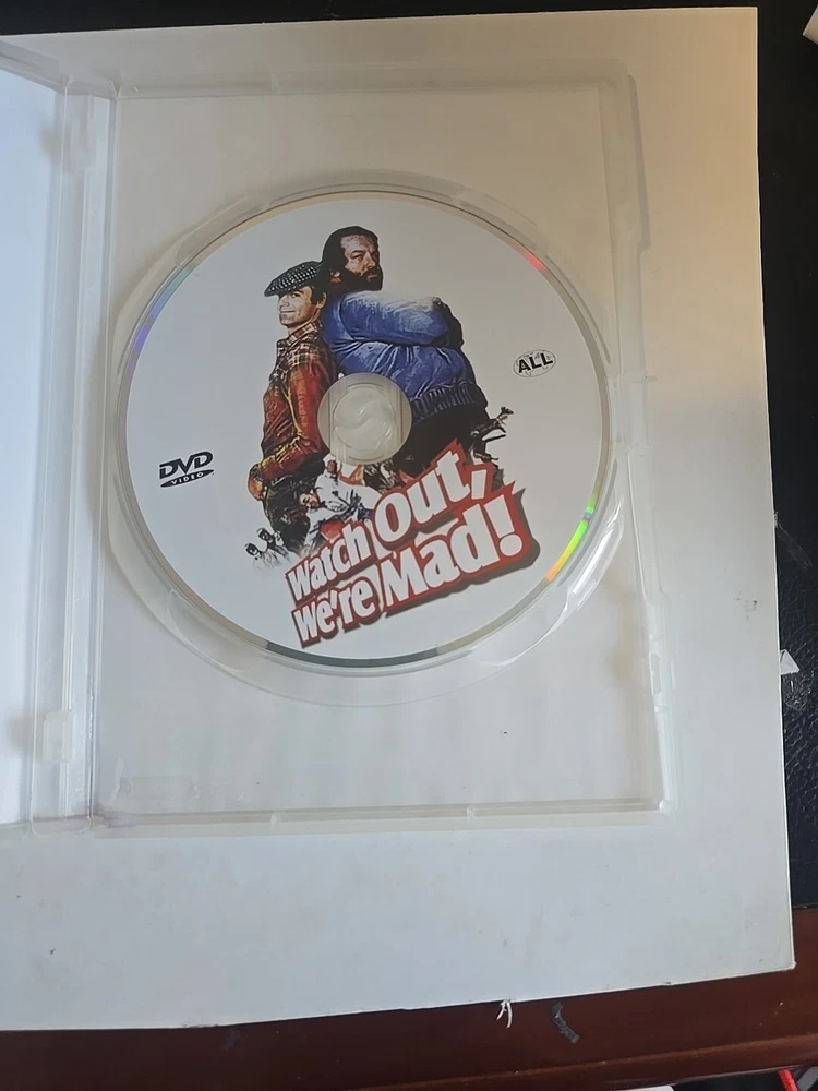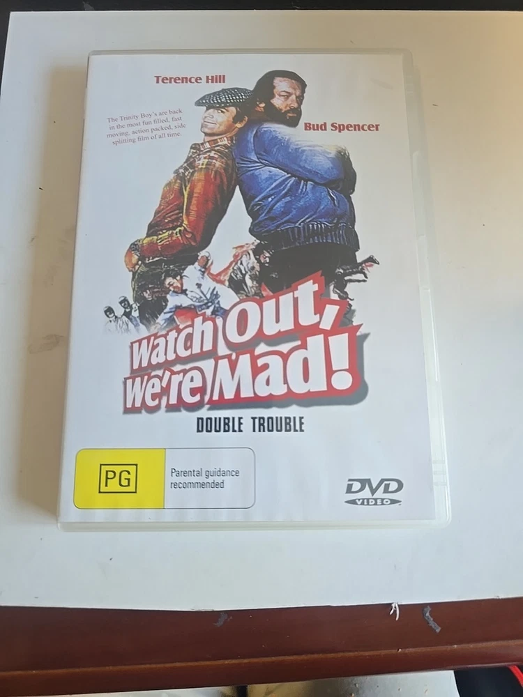 DVD - WATCH OUT WE'RE MAD (1944) Region Free features the dynamic duo of Terence Hill and Bud Spencer in this action-packed adventure comedy. The movie is rated PG and is presented in PAL video format, suitable for worldwide viewing. Housed in a tall DVD case, this film is a must-have for fans of the genre. Enjoy the comedic antics and thrilling stunts of Hill and Spencer as they navigate through a series of hilarious mishaps in this classic film.