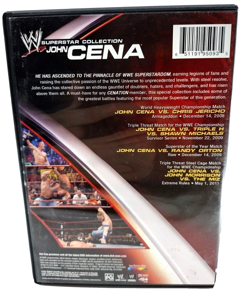 Actor: John Cena, Randy Orton, Shawn Michaels, Triple H, Chris Jericho Rating: PG gtin13: 651191950935 Type: Movie Genre: Sports, Wrestling Seller Notes: “DVD has some light scratches/scuffs. Case has minor wear.” Movie/TV Title: WWE Superstar Collection John Cena UPC: 651191950935 Format: DVD Sub-Genre: Pro Wrestling/WWE Release Year: 2012