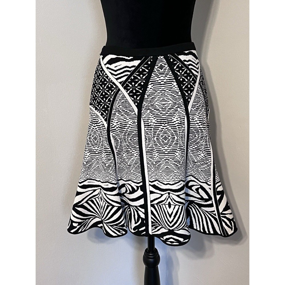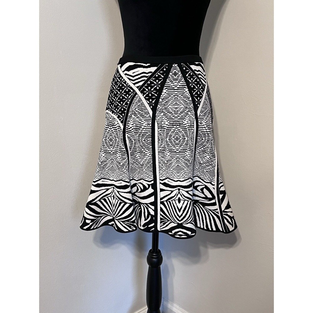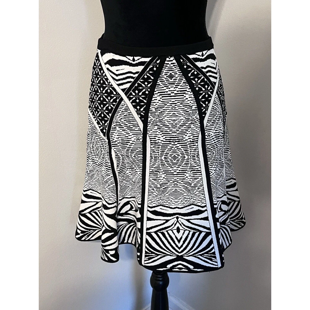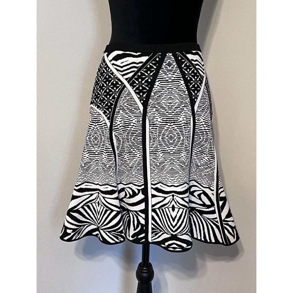 Bold contrast print skirt from Diane Von Furstenberg Thick knit sweater material 83% rayon, 15% poly, 2% spandex Flirty tulip/trumpet silhouette High quality sophisticated piece Size small