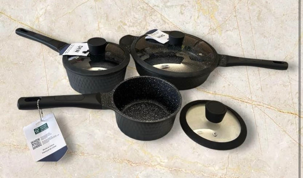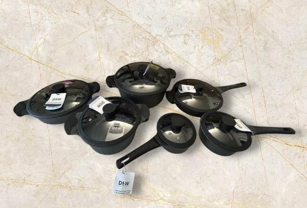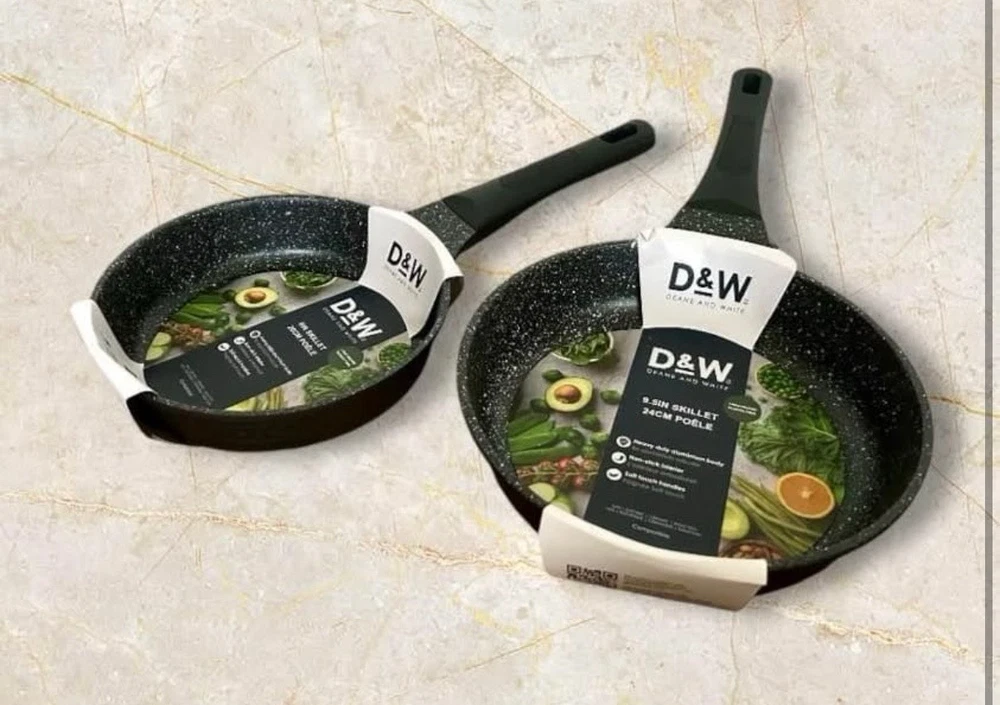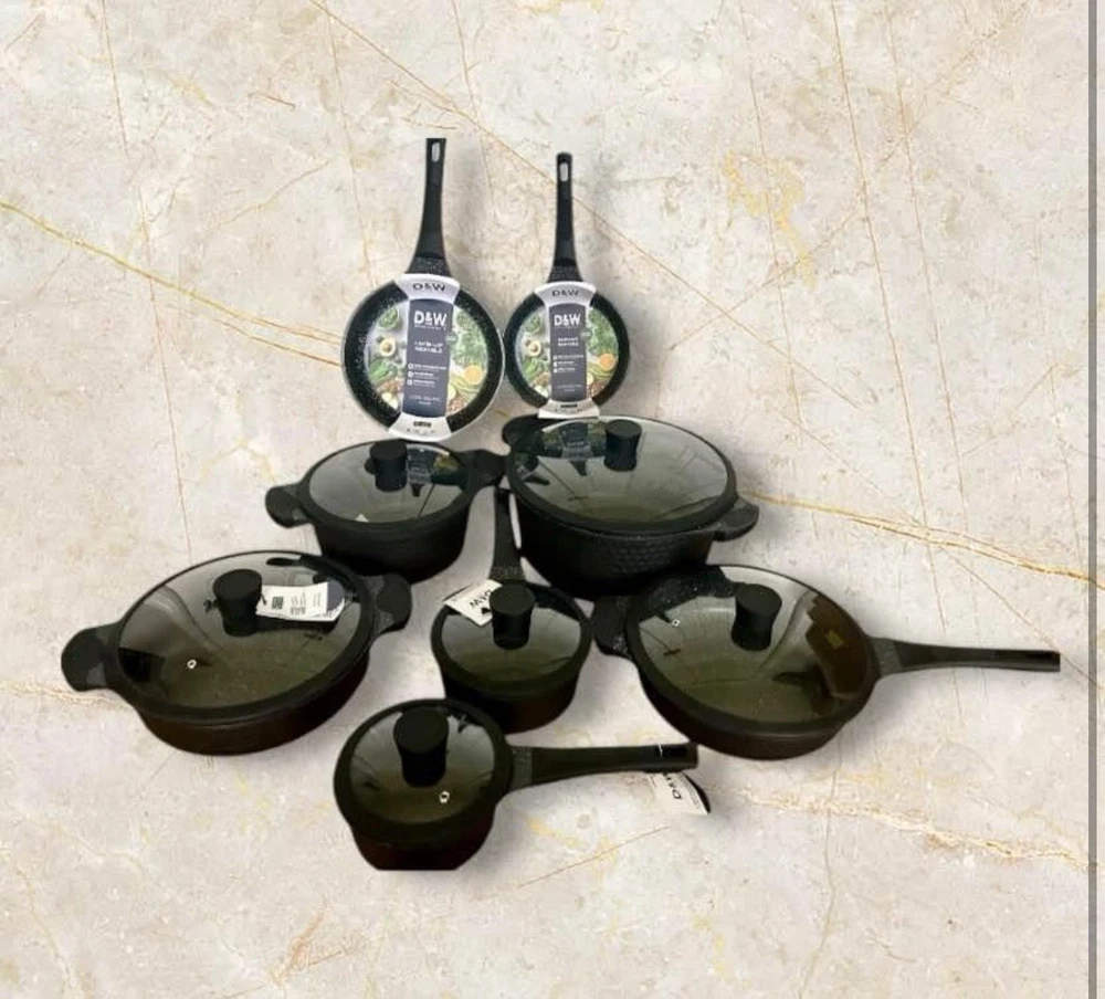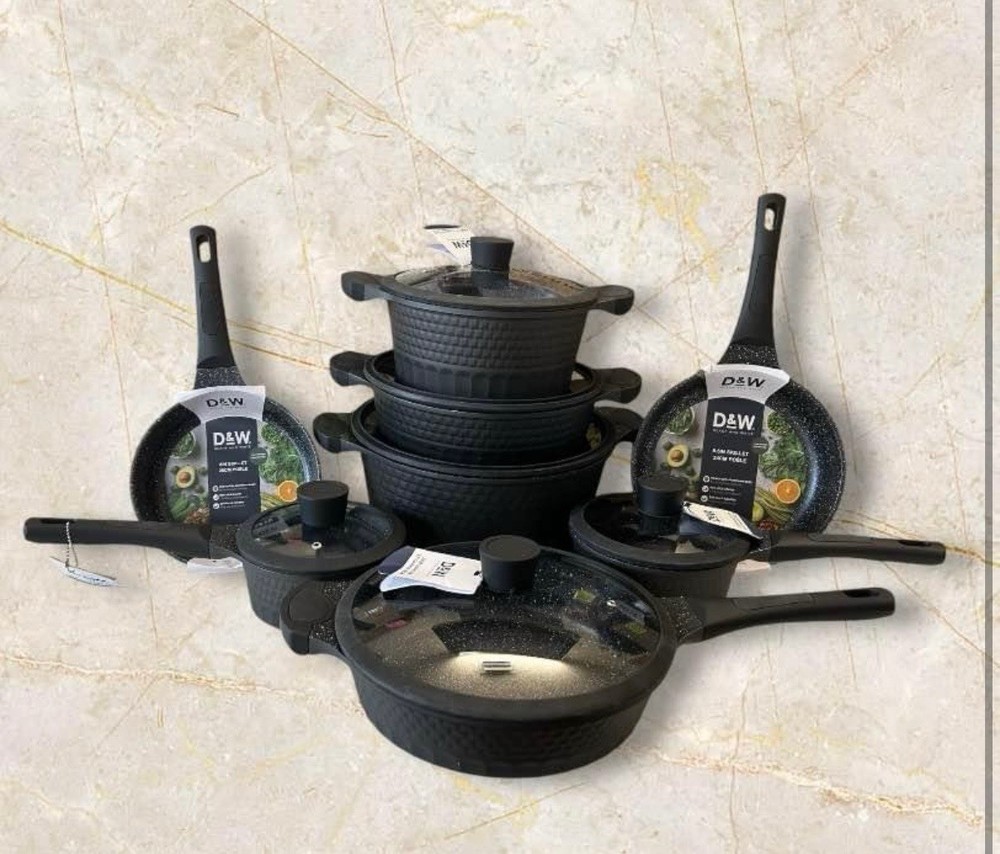 The D&W Deane & White Cookware Collection Set includes 14 pieces in a sleek black color, perfect for any modern kitchen. This set features a casserole pan, saucepan, asparagus pot, egg poaching pan, grill pan, and more, all made of aluminum and ceramic materials for durability. The cookware is suitable for use on induction, electric, and gas stoves, and can also be used in electric and gas ovens. With features like long handles, non-stick surfaces, easy cleaning, and dishwasher-safe convenience, this set provides everything you need for your cooking needs.