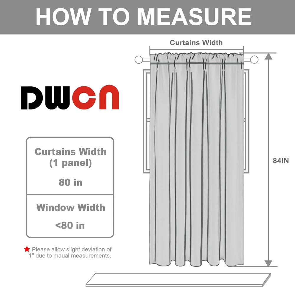 Store New Arrivals Add to Favorite View Feedback DWCN Patio Sliding Door Curtains - Extra Wide Curtains for Glass Door, Room Divider Blackout Thermal Curtain Panel with Back Tab & Rod Pocket for Bedroom Partition, 80 X 84 Inches, Greyish White Description Item model number DWUS-ZGBGD-BD1P-80x84-01 Style Modern Number of Items 1 Pattern Solid Package Weight 1.12 Kilograms Theme Art Opacity Blackout Unit Count 1.0 Count Room Type Bedroom Product Dimensions 84"L x 80"W Batteries required No Brand DWCN Material Polyester, Polyester Blend Top Style Back Tab, Rod Pocket, Rod Model Name 1 Seasons All Season Lining Description Lined Specific Uses For Product Room Darkening, Privacy Included Components Rod,Liner Closure Type Back tab Curtain Form Room Divider Curtain Water Resistance Level Not Water Resistant Item Weight 2.47 pounds Size 80"W x 84"L (Pack of 1) Compatible with Rod Size 3.15 Inches Special Feature Durable,Extra Wide Antibacterial treatment Thermal Hanging Method Back Tab Color Greyish White Recommended Uses For Product Indoor Manufacturer DWCN Fabric Type 100% Polyester Product Care Instructions Machine Wash Number of pieces 1 100% Polyester Package Includes: 1 greyish white patio sliding door curtain panel of 80 inches wide x 84 inches tall. Each panel has 3.15" rod pocket & back tab loops top, which can be hung in different style: Slot Top, Back Loops or with your own Clip-rings. (The panels are the same color on both sides) Heavy Weighted Blackout Fabric: These extra wide curtains are crafted from high quality heavy duty 100% durable Triple Weaved Polyester Fabric. Our room partitioning curtains can block 70%-80% of UV sunlight without liner ( Darker colors work better) and thermally insulate against extreme heat and cold. Total Privacy & Noise Reducing Curtain: Our heavyweight privacy thermal curtains help reduce noise and provide TOTAL privacy protection from unwanted views and viewers at any time of the day. As a general rule, for proper fullness panels should measure 2-3 times the width of your window/opening. Space Partitioning Solution: Featuring an extra wide width, these curtains are designed for room partition and management. They can be used in Patio Sliding Doors, Large Windows, Shared Bedroom, Apartment, Storage, Studio, Dorms, Loft, Office Workspace, High Ceilings, Factories, Hospitals, Cafes, and Hotels. Easy Care Fabric: Our room darkening divider curtains are machine washable in cold water, gentle cycle, no bleaching, iron at low temperature if required, no color fading guaranteed. (Curtains Rod not Included) Product Description Embellish your homes with our Patio Sliding Door Curtains. These Extra Wide Curtains are crafted from a super soft material that block-out sunlight, insulate thermal and reduce noise. Sliding Door Curtain Stylish and functional, perfect for sliding doors. Room Divider Transform any space effortlessly. Privacy Protection Enhance your privacy and secure your space. As a door Add convenience and practicality as a door replacement. 1 Sliding Door Curtain 2 Room Divider 3 Privacy Protection 4 As a Door HANGING METHODS BLACKOUT PERFORMANCE Why is there a slight color difference between the actual curtains received and the website pictures? The colors vary a bit on different screens and lighting. How well do the curtains block out light? These curtains are crafted from high quality 100% durable Triple Weaved Polyester Fabric. The light colors have 50%-70% blackout and darker colors have 70%-90% blackout. How are curtains measured in length? The length described for our curtains is from the top of the rod pocket to the bottom of the fabric. Other Products from DWCN Add to Cart Add to Cart Add to Cart Add to Cart Customer Reviews 4.4 out of 5 stars 1,221 4.6 out of 5 stars 1,255 4.6 out of 5 stars 604 4.6 out of 5 stars 9,134 4.5 out of 5 stars 13,347 Price $24.79 $ 24 . 79 $25.59 $ 25 . 59 $29.99 $ 29 . 99 $20.06 $ 20 . 06 $22.67 $ 22 . 67 Fabric Polyester, Polyester Blend Polyester, Polyester Blend Polyester, Polyester Blend Faux Linen Fabric Polyester, Polyester Blend Panels 1 Panel 1 Panel 2 Panels 2 Panels 2 Panels Hanging method Rod Pocket Grommet Grommet Grommet Rod Pocket Pattern Solid Solid Solid Solid Solid Machine Wash ✔ ✔ ✔ ✔ ✔ ABOUT US We offer the best prices around on high quality products. Our E-store includes media such as books, movies, music and games while offering electronics, toys, sporting apparel, clothing, tools, general home, garden items and more. SHIPPING We are always working hard to ensure your package arrives as soon as possible. Please understand that some factors like weather, high postal traffic, and the performance of shipping companies are outside of our control. We offer free shipping to the lower 48 states and ship within 2 business days of payment, usually sooner. We do not accept P.O. Boxes. Please provide a physical address. RETURNS We offer a 30-Day Return Policy on items which you are not completely satisfied with. You have the option for a full-refund or an exchange of the item. No returns are available on items shipped outside of the USA. PAYMENT We accept PayPal. CONTACT US This page content is yet to come Please ad us to your favorite seller and visit again later Thank You