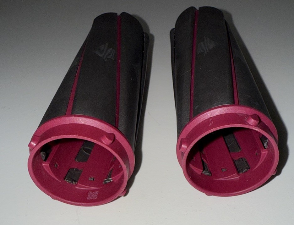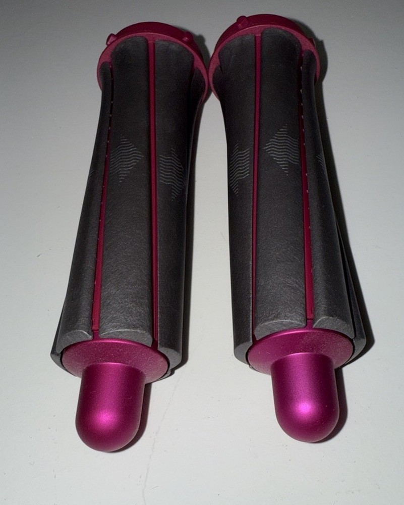 First generation 1.6 inch Airwrap barrels in the colors nickel/fuchsia use the Coanda effect to create loose curls or waves in shorter hair. Comes with two barrels to create curls in in both directions. 1.6" x H 5.29" Excellent condition used only a couple of times