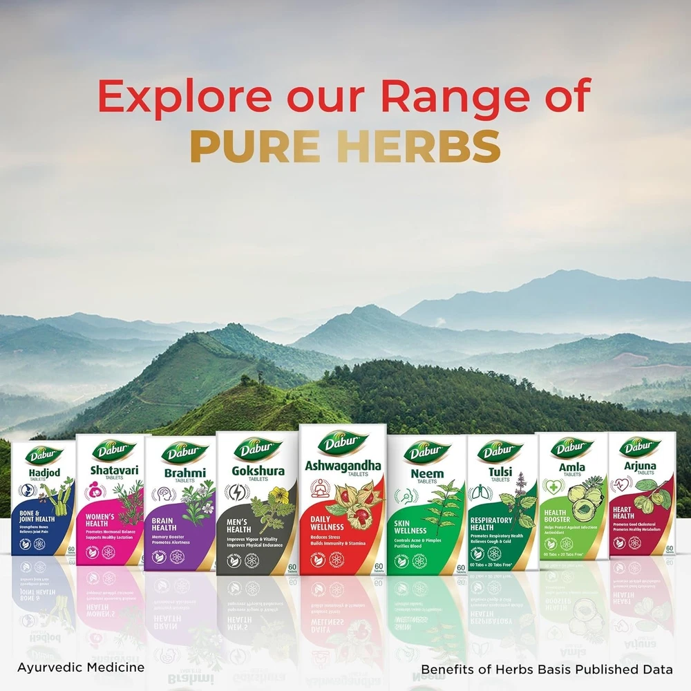 Product description With over 130 years of expertise in ayurveda, dabur has always been committed to the health and well-being of every household. Power packed with the age-old wisdom of ayurveda, dabur pure herbs range of tablets is the latest offering from the house of dabur in fulfilling this vision. The immunity boosting dabur ashwagandha tablets in our range have the goodness of ashwagandha in it. Dabur Ashwagandha Tablets are 100 % Ayurvedic Immunity booster tablets that help strengthen your immunity. Ashwagandha is an immunomodulator that helps boost the immunity and it also has antioxidant properties. Ashwagandha also helps with general weakness and in relieving stress levels, thereby making it a perfect choice for your overall health. For best results, take one tablet twice everyday with water (or as directed by the physician) From the manufacturer