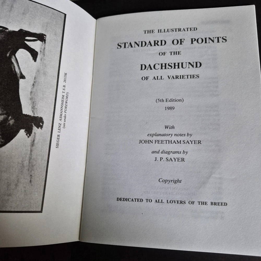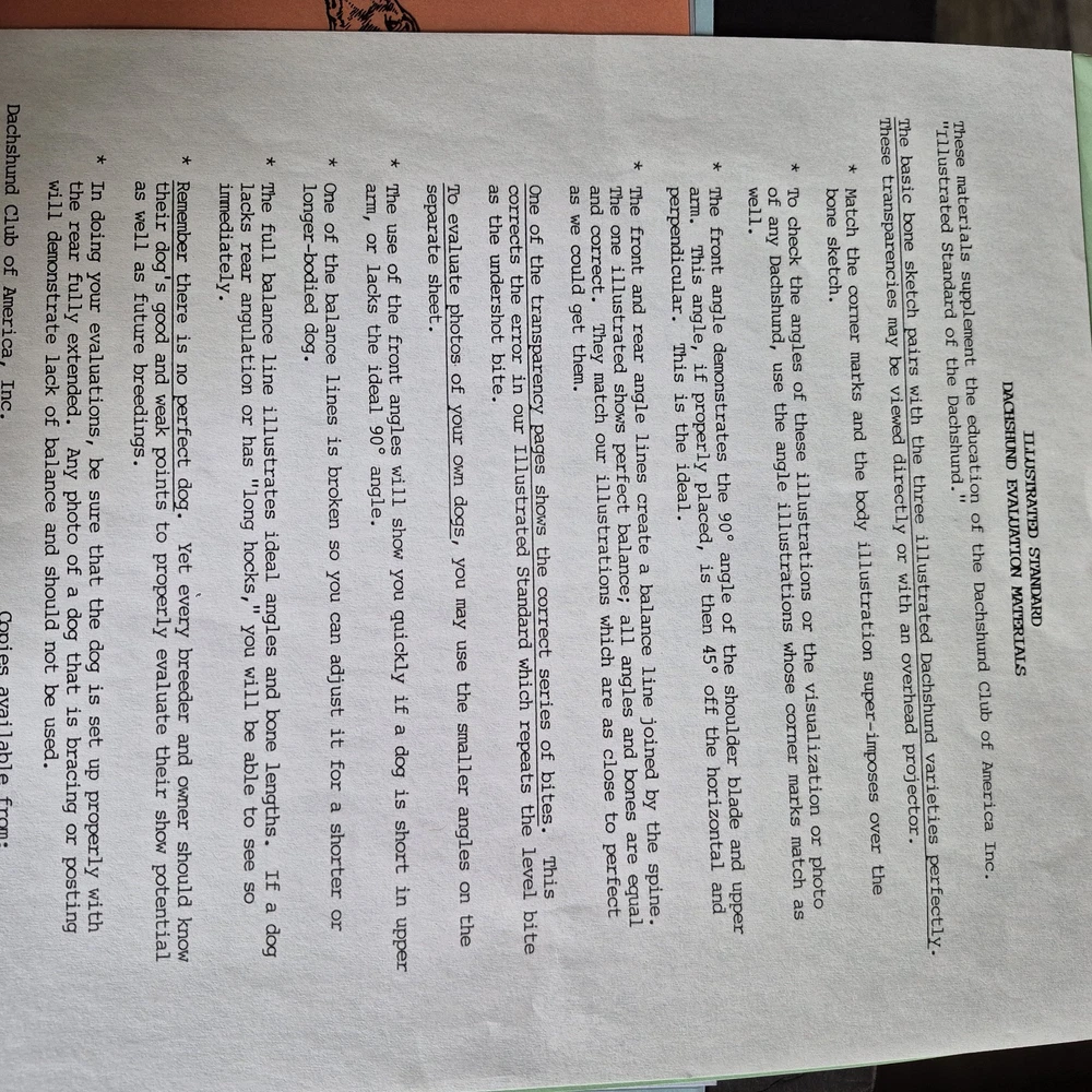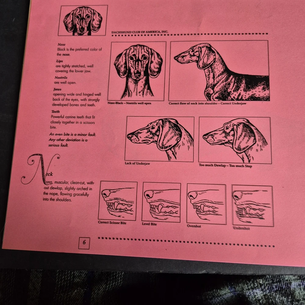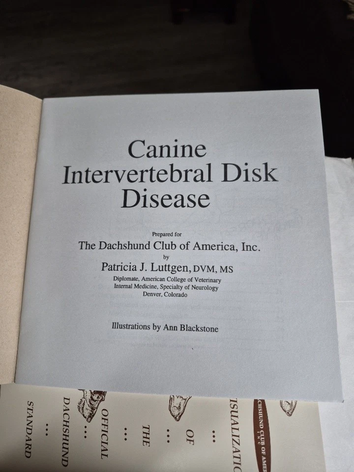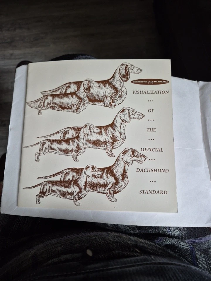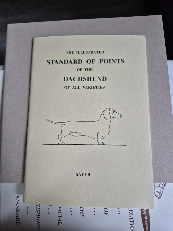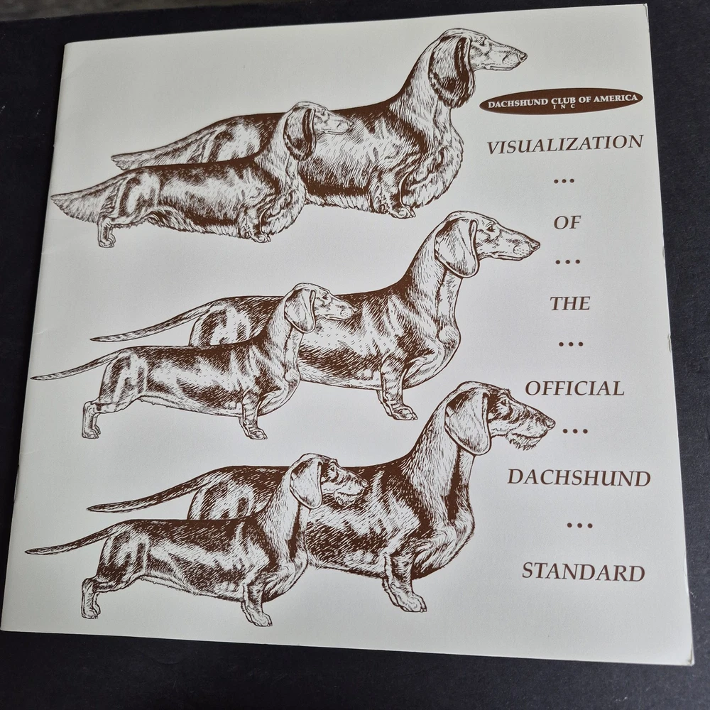 Almost new Booklets regarding dachshunds The Dachshund history & info - 20 pgs Visualization of the Official dachshunds standard 1997 24 pgs The Illustrated Standard of Points of all varieties by Sayer 31 pgs 5th Edition Canine intervertebral Disk Disease in dachshunds 1993 33 pgs Illustrated Standard dachshund Evaluation Materials overlays