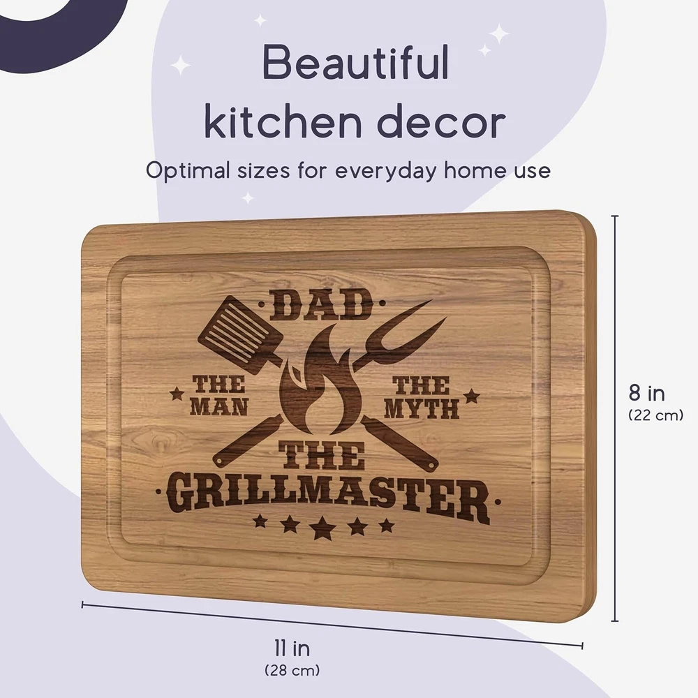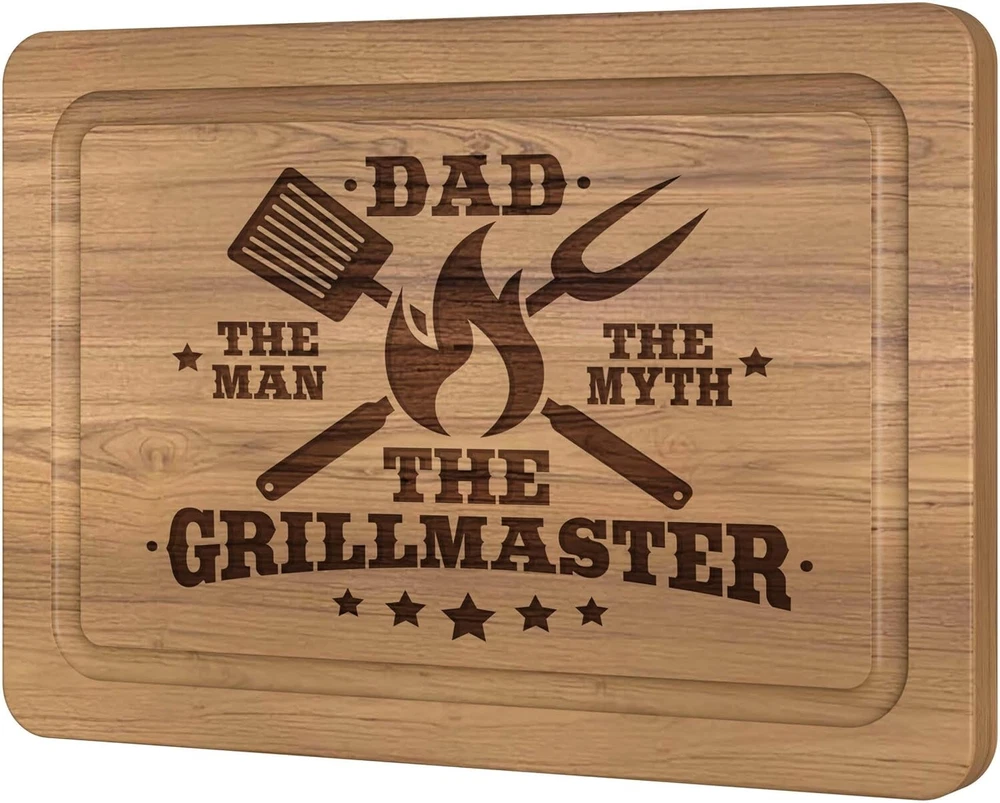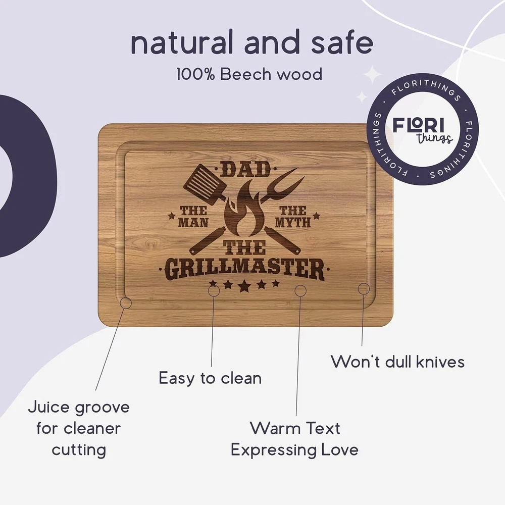Dad Birthday Gift - Grillmaster Cutting Board BBQ - personalized Cutting Boards Description : Meaningful Dad Birthday Gift – This thoughtful cutting board is a heartfelt way to express your love and admiration for your dad. Perfect for birthdays, Christmas, Thanksgiving, Father's Day, or any occasion when you want to make your dad feel cherished, this cutting board will show him how much his daughter/son values and loves him. It’s a gift that will create lasting memories and make any special day even more memorable. High-Quality Beech Cutting Board - The high-quality cutting board with juice groove made of beech wood is the perfect gift for dad. The motif “Grillmaster” is laser engraved on the board and is therefore particularly durable. It is the perfect gift for the father who has everything from sons and daughters. Juice Groove - The cutting board's juice groove ensures that juices such as meat juices do not spill onto the worktop. The chopping board is ideal as a BBQ accessory and should not be missing in any household where dad likes to barbecue. Knife-friendly and Easy-to-clean - Beech cutting boards are particularly knife-friendly because beech wood has a suitable hardness that does not dull the knife so quickly. This hardness ensures that the blade is not subjected to as much damage when cutting and remains sharp for longer. Found the perfect gift - You probably searched for “ BBQ Accessories for Men , " Christmas Gifts for Dad ", " Birthday Gifts for Dad ", " Grill Gift " or " BBQ Cutting Boards for meat ". Now you've found the perfect gift for a father