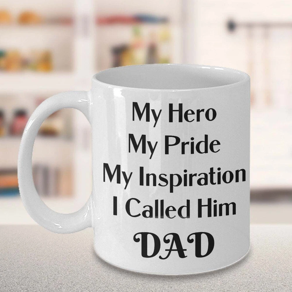Dad Mug My Hero My Pride Dad Mug Father's Day Gift From Daughter Dad Mug Gift Product Details.. This high quality 11oz. ceramic white mug has a premium hard coat that provides crisp and vibrant color reproduction sure to last for years. Perfect for all hot & cold beverages. The highest quality printing possible is used. It will never fade no matter how many times you wash it. Material: 100% Ceramic. Print both sides. Dishwasher and Microwave Safe. High Gloss + Premium White Finish. Printed in the U.S.A. Personalized & Custom. We support personalized and custom mug to add custom, when placing an order, you can add notes to the "order note" in shipping address section. Also you can contact us directly via message. Shipping Info. Ready to ship in 1 to 2 business days, All products are made-to-order and proudly printed in the United States. Shipped by USPS and DHL, You will receive your order in 5-7 days. Replace & Refund. All products are defective during shipping broken, chipped will be replaced free of charge. You are not satisfied with the product, we will refund 100% money to you. If any other issues arise, please do not hesitate to message, we would be more than happy to assist you.