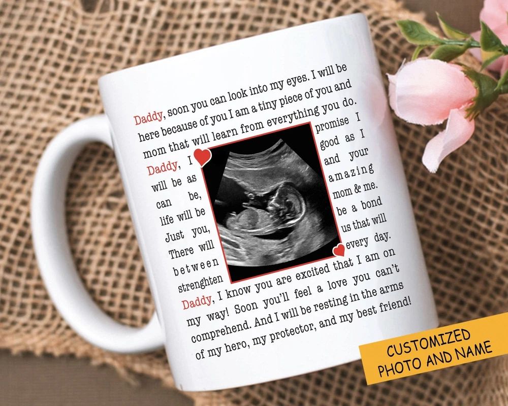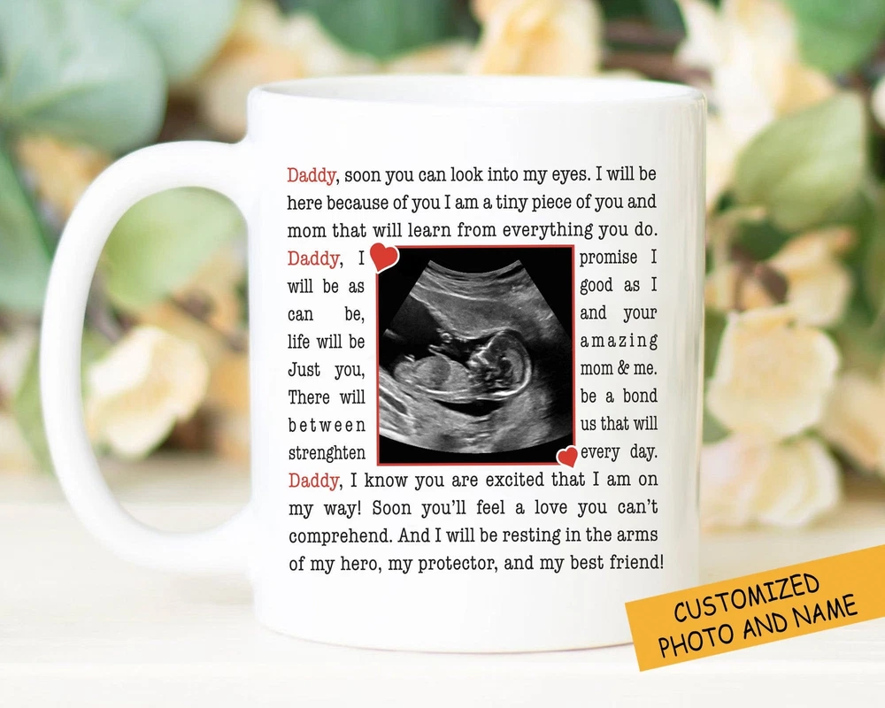 Daddy Words Personalized Mug Ultrasound Photo Mug Fathers Day Gift Baby Bump Mug Product Details.. This high quality 11oz. ceramic white mug has a premium hard coat that provides crisp and vibrant color reproduction sure to last for years. Perfect for all hot & cold beverages. The highest quality printing possible is used. It will never fade no matter how many times you wash it. Material: 100% Ceramic. Print both sides. Dishwasher and Microwave Safe. High Gloss + Premium White Finish. Printed in the U.S.A. Personalized & Custom. We support personalized and custom mug to add custom, when placing an order, you can add notes to the "order note" in shipping address section. Also you can contact us directly via message. Shipping Info. Ready to ship in 1 to 2 business days, All products are made-to-order and proudly printed in the United States. Shipped by USPS and DHL, You will receive your order in 5-7 days. Replace & Refund. All products are defective during shipping broken, chipped will be replaced free of charge. You are not satisfied with the product, we will refund 100% money to you. If any other issues arise, please do not hesitate to message, we would be more than happy to assist you.