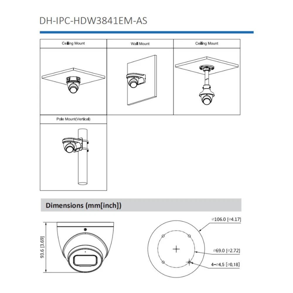 Product Description 8MP IR Fixed focal Eyeball WizSense Network Camera Features: > 8MP, 1/2.8” CMOS image sensor, low illuminance, high image definition > Outputs max. 8MP (3840 × 2160) @20 fps (AI function enabled by default) and supports 8MP (3840 × 2160) @25/30 fps (when AI function disabled) > H.265 codec, high compression rate, low bit rate > Built-in IR LED, max. IR distance: 30 m > ROI, SMART H.264+/H.265+, flexible coding, applicable to various bandwidth and storage environments. > Rotation mode, WDR, 3D DNR, HLC, BLC, digital watermarking, applicable to various monitoring scenes > Intelligent detection: Intrusion, tripwire (support the classification and accurate detection of vehicle and human) > Abnormality detection: Motion detection, video tampering, scene changing, audio detection, no SD card, SD card full, SD card error, network disconnection, IP conflict, illegal access, and voltage detection > Supports max. 256 G Micro SD card, built-in Mic > 12V DC/PoE power supply > IP67 protection > SMD Plus Specifications: Camera Image Sensor 1/2.8”8Megapixel progressive CMOS Max. Resolution 3840 (H) × 2160 (V) ROM 128 MB RAM 512 MB Scanning System Progressive Electronic Shutter Speed Auto/Manual 1/3 s–1/100,000 s Min. Illumination 0.007 Lux@F1.4 (Color, 30IRE) 0.0007 Lux@F1.4 (B/W, 30IRE) 0 Lux (Illuminator on) S/N Ratio > 56 dB Illumination Distance 30 m (98.4 ft) Illuminator On/Off Control Auto/Manual Illuminator Number 2 (IR LED) Pan/Tilt/Rotation Range Pan: 0°–360° Tilt: 0°–78° Rotation: 0°–360° Lens Lens Type Fixed-focal Mount Type M12 Focal Length 2.8 mm; 3.6 mm Max. Aperture F1.4 Field of View 2.8 mm: Horizontal 108° × Vertical 58° × Diagonal 127° 3.6 mm: Horizontal 85° × Vertical 45° × Diagonal 100° Iris Type Fixed Close Focus Distance 2.8 mm: 1.4 m (4.6 ft) 3.6 mm: 2.4 m (7.9 ft) Electronic Shutter Speed Auto/Manual 1/3 s–1/100,000 s DORI Distance Lens Detect Observe Recognize Identify 2.8 mm 85.5 m (280.5 ft) 34.2 m (112.2 ft) 17.1 m (56.1 ft) 8.6 m (28.2 ft) 3.6 mm 110.3 m (361.9 ft) 44.1 m (144.7 ft) 22.1 m (72.5 ft) 11.0 m (36.1 ft) Professional, intelligent Perimeter Protection Tripwire; intrusion (support the classification and accurate detection of vehicle and human) Intelligent Search Work together with Smart NVR to perform refine intelligent search, event extraction and merging to event videos. Video Video Compression H.265; H.264; H.264H; H.264B; MJPEG (only supported by the sub stream) Smart Codec Smart H.265+/ Smart H.264+ Stream Capability 3 streams Video Frame Rate Main stream: 3840 × 2160 @(1–20 fps by default) 3840 × 2160 @(1–25/30 fps when AI function disabled) sub stream: 704 × 576 @(1–25 fps)/704 × 480 @ (1–30 fps) third stream: 1920 × 1080 @(1–25/30 fps) Resolution 8M (3840 × 2160); 6M (3072 × 2048); 5M (3072 × 1728/2592 × 1944); 4M (2688 × 1520); 3M (2048 × 1536/2304 × 1296); 1080p (1920 × 1080); 1.3M (1280 × 960); 720p (1280 × 720); D1(704 × 576/704 × 480); VGA (640 × 480); CIF (352 × 288/352 × 240) Bit Rate Control CBR/VBR Video Bit Rate H.264: 3 kbps–8192 kbps H.265: 3 kbps–8192 kbps Day/Night Auto (ICR)/Color/B/W BLC Yes HLC Yes WDR 120 dB Scene Self-adaptation (SSA) Yes White Balance Auto/natural/street lamp/outdoor/manual/regional custom Gain Control Auto/Manual Noise Reduction 3D DNR Motion Detection OFF/ON (4 areas, rectangular) Region of Interest (RoI) Yes (4 areas) Smart Illumination Yes Image Rotation 0°/90°/180°/270° (Support 90°/270° with 1080p resolution and lower.) Mirror Yes Privacy Masking 4 areas Audio Built-in MIC Yes Audio Compression G.711a; G.711Mu; G726 Alarm Alarm Event No SD card; SD card full; SD card error; service life warning (only supported by Dahua card); network disconnection; IP conflict; illegal access; motion detection; video tampering; intrusion; tripwire; scene changing; audio detection; voltage detection; SMD; safety exception Network Network RJ-45 (10/100 Base-T) SDK and API Yes Protocol IPv4; IPv6; HTTP; TCP; UDP; ARP; RTP; RTSP; RTCP; RTMP; SMTP; FTP; SFTP; DHCP; DNS; DDNS; QoS; UPnP; NTP; Multicast; ICMP; IGMP; NFS; SAMBA; PPPoE; SNMP Cyber Security Video encryption; firmware encryption; configuration encryption; Digest; WSSE; account lockout; security logs; IP/MAC filtering; generation and importing of X.509 certification; syslog; HTTPS; 802.1x; trusted boot; trusted execution; trusted upgrade Interoperability ONVIF (Profile S/Profile G/Profile T); CGI; P2P; Milestone; Genetec User/Host 20 (Total bandwidth: 72 M) Storage FTP; SFTP; Micro SD card (support max. 256 G); NAS Browser IE: IE8; IE9; IE11 Chrome Firefox Management Software Smart PSS; DSS; DMSS Mobile Phone IOS; Android Certification Certifications CE-LVD: EN62368-1 CE-EMC: Electromagnetic Compatibility Directive 2014/30/EU FCC: 47 CFR FCC Part 15, Subpart B UL/CUL: UL60950-1 CAN/CSA C22.2 No.60950-1-07 Power Power Supply 12V DC/PoE (802.3af) Power Consumption Basic power consumption: 2.6W (12V DC); 3.3W (PoE) Max. power consumption (WDR + H.265 + IR LED intensity): 6.9W (12V DC); 7.9W (PoE) Environment Operating Conditions –40°C to +60°C (–40°F to +140°F)/Less than 95% RH Storage Conditions –40°C to +60°C (–40°F to +140°F) Protection Grade IP67 Structure Casing Metal Dimensions 93.6 mm × Φ106 mm (3.7" × Φ4.2") Net Weight 530 g (1.1 lb) Gross Weight 800 g (1.7 lb) Shipping & Handling: Warranty & Return Policy: Feedback & About Us: About Customs duty/Tax: 1. Item will be shipped out within 5 business days after the payment. Please check and make sure your address is correct before payment. (In order to make sure you can receive the items successfully, please provide your phone number as well.) 2. The items will be shipped via Post Office Airmail. It usually takes around 2 to 3 weeks to United Stated, United Kingdom, Australia, Canada and some European countries. But for other countries, it may need 4-6 weeks to deliver the parcel. It may take longer time if there 