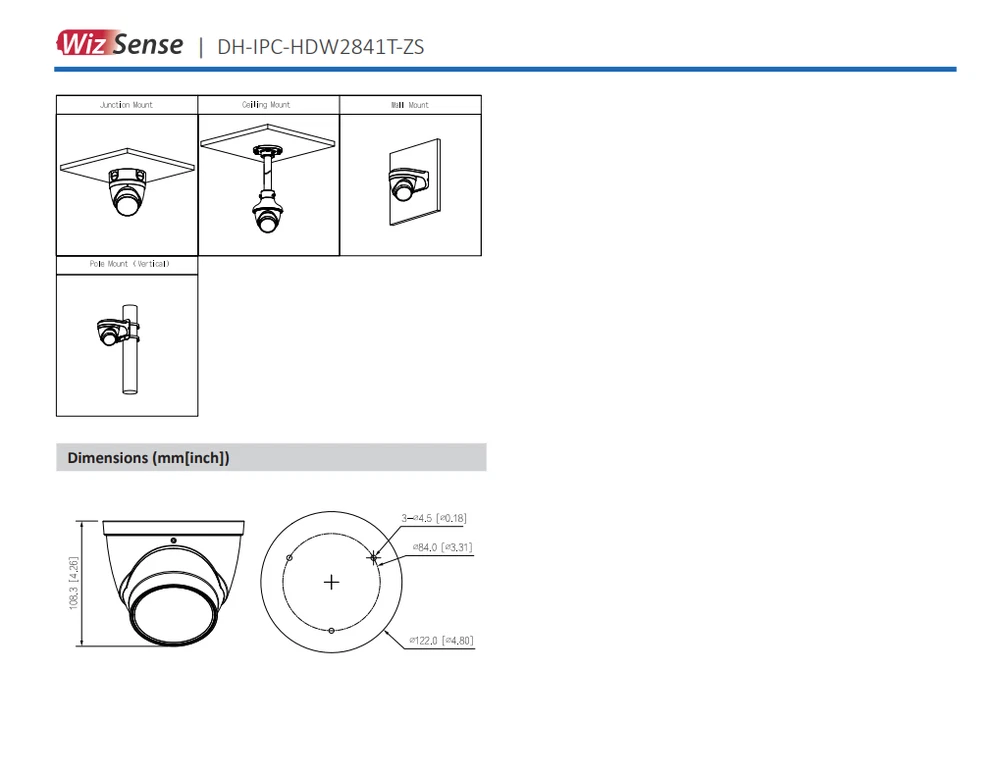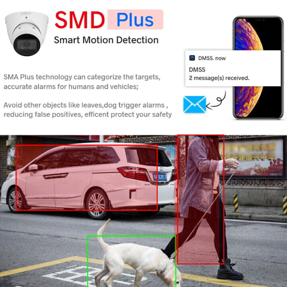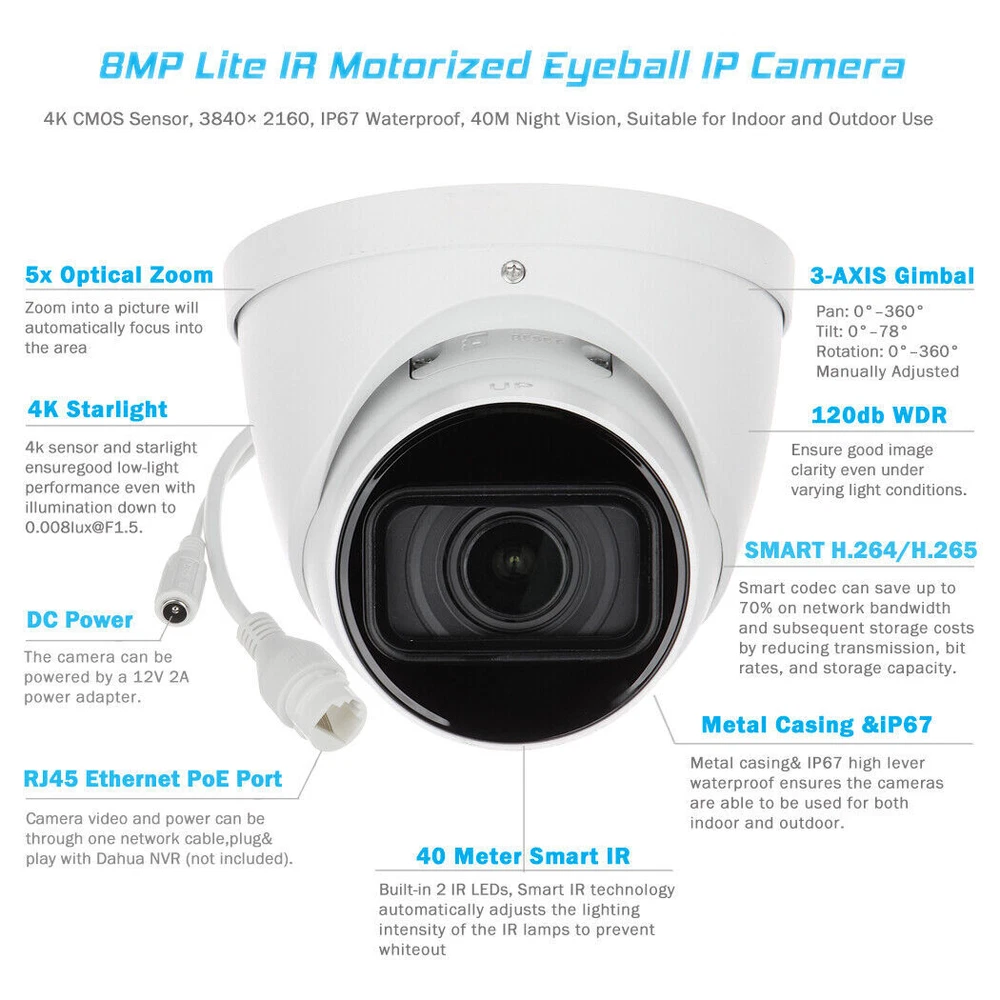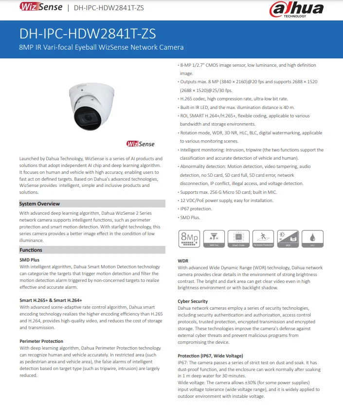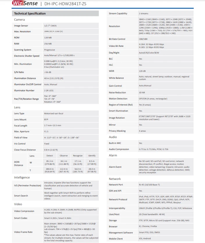 Illumination Distance: 40 m (131.23 ft) (IR) Storage Capacity: Supports max. 256 G Micro SD card Power: 12 VDC/PoE Brand: Dahua Illuminator Number: 2 (IR LED) Power Supply: 12 VDC/PoE (802.3af) Focal Length: 2.7 mm–13.5 mm Image Sensor: 1/2.7" CMOS Surveillance Technology: IP/Network Lens Mount: φ14 Maximum Resolution: 3840 (H) × 2160 (V) gtin13: Does not apply Connectivity: Wired Max. Aperture: F1.5 Model: IPC-HDW2841T-ZS Smart Codec: Smart H.265+; Smart H.264+ Interoperability: ONVIF Color: White UPC: Does not apply Location: Outdoor & Indoor Mirror: Yes Type: Dome Built-in MIC: Yes Compatible Brand: Dahua WDR: 120 dB Color Mode: Color Day, B&W Night Protection: IP67 Smart Home Compatibility: Dahua DMSS APP Lens Type: Motorized vari-focal MPN: Does not apply Day/Night: Auto(ICR)/Color/B/W Smart Home Protocol: Infrared Features: 8-MP 1/2.7" CMOS image sensor, Built-in IR LED, H.265 codec, IP67 protection, Night Vision, Outdoor/Weatherproof, Smart Light, SMD Plus
