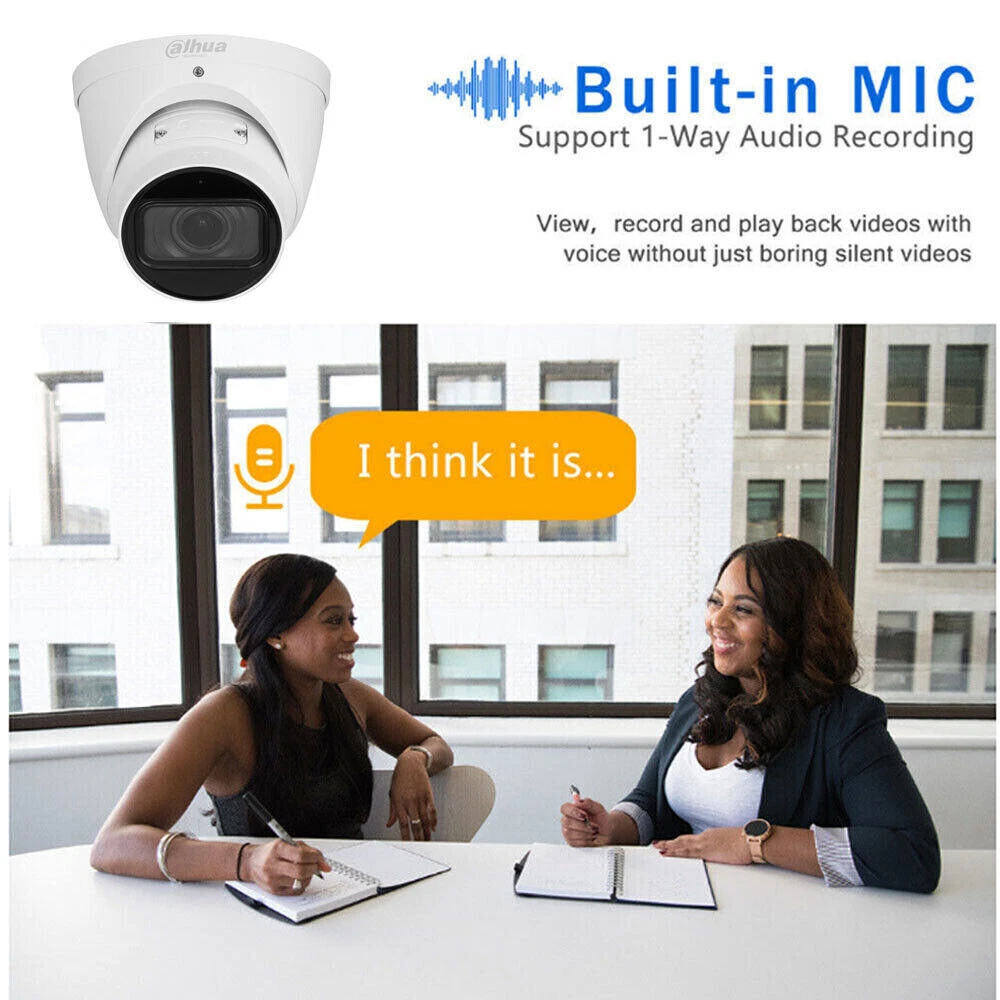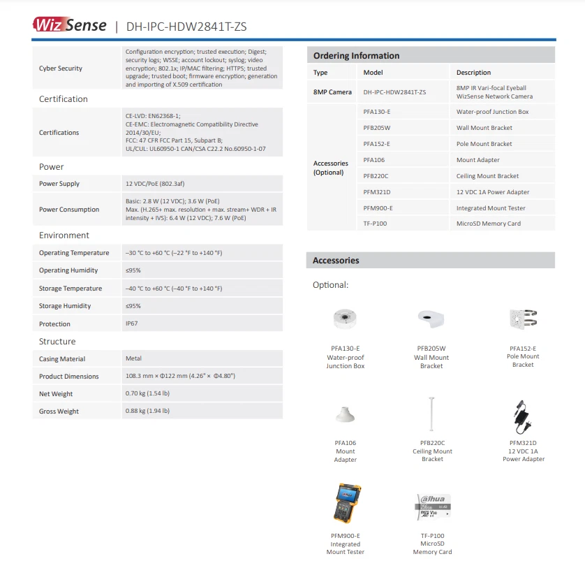 Product Description 8MP IR Vari-focal Eyeball WizSense Network Camera Features: > 8-MP 1/2.7" CMOS image sensor, low luminance, and high definition image. > Outputs max. 8 MP (3840 × 2160) 20 fps and supports 2688 × 1520 (2688 × 1520) 25/30 fps. > H.265 codec, high compression rate, ultra-low bit rate. > Built-in IR LED, and the max. illumination distance is 40 m. > ROI, SMART H.264+/H.265+, flexible coding, applicable to various bandwidth and storage environments. > Rotation mode, WDR, 3D NR, HLC, BLC, digital watermarking, applicable to various monitoring scenes. > Intelligent monitoring: Intrusion, tripwire (the two functions support the classification and accurate detection of vehicle and human). > Abnormality detection: Motion detection, video tampering, audio detection, no SD card, SD card full, SD card error, network disconnection, IP conflict, illegal access, and voltage detection. > Supports max. 256 G Micro SD card; built in MIC. > 12 VDC/PoE power supply, easy for installation. > IP67 protection. Specifications: Camera Image Sensor 1/2.7" CMOS Max. Resolution 3840 (H) × 2160 (V) ROM 128 MB RAM 256 MB Scanning System Progressive Electronic Shutter Speed Auto/Manual 1/3 s–1/100,000 s Min. Illumination 0.008 lux F1.5 (Color, 30 IRE) 0.0008 lux F1.5 (B/W, 30 IRE) 0 lux (Illuminator on) S/N Ratio > 56 dB Illumination Distance 40 m (131.23 ft) (IR) Illuminator On/Off Control Auto; Manual Illuminator Number 2 (IR LED) Pan/Tilt/Rotation Range Pan: 0°–360° Tilt: 0°–78° Rotation: 0°–360° Lens Lens Type Motorized vari-focal Lens Mount φ14 Focal Length 2.7 mm–13.5 mm Max. Aperture F1.5 Field of View H: 113°–31°; V: 58°–18°; D: 138°–36° Iris Control Fixed Close Focus Distance 0.8 m (2.62 ft) DORI Distance Lens Detect Observe Recognize Identify W 85.3 m (279.86 ft) 34.1 m (111.88 ft) 17.1 m (56.10 ft) 8.5 m (27.89 ft) T 280.0 m (918.64 ft) 112.0 m (367.45 ft) 56.0 m (183.73 ft) 28.0 m (97.86 ft) Intelligence IVS (Perimeter Protection) Intrusion, tripwire (the two functions support the classification and accurate detection of vehicle and human) Smart Search Work together with Smart NVR to perform refine intelligent search, event extraction and merging to event videos Video Video Compression H.265; H.264; H.264H; H.264B; MJPEG (Only supported by the sub stream) Smart Codec Smart H.265+; Smart H.264+ Video Frame Rate Main stream: 3840 × 2160 (1–20 fps)/2688 × 1520 (1–25/30 fps) sub stream: 704 × 576 (1–25 fps)/704 × 480 (1–30 fps) *The values above are the max. frame rates of each stream; for multiple streams, the values will be subjected to the total encoding capacity. Stream Capability 2 streams Resolution 3840 × 2160 (3840 × 2160); 3072 × 2048 (3072 × 2048); 3072 × 1728 (3072 × 1728); 2880 × 1620 (2880 × 1620); 2688 × 1520 (2688 × 1520); 3M (2048 × 1536); 2304 × 1296 (2304 × 1296); 1080p (1920 × 1080); 1.3M (1280 × 960); 720p (1280 × 720); D1 (704 × 576/704 × 480); VGA (640 × 480); CIF (352 × 288/352 × 240) Bit Rate Control CBR/VBR Video Bit Rate H.264: 32 kbps–8192 kbps H.265: 12 kbps–8192 kbps Day/Night Auto(ICR)/Color/B/W BLC Yes HLC Yes WDR 120 dB White Balance Auto; natural; street lamp; outdoor; manual; regional custom Gain Control Auto;Manual Noise Reduction 3D NR Motion Detection OFF/ON (4 areas, rectangular) Region of Interest (RoI) Yes (4 areas) Smart Illumination Yes Image Rotation 0°/90°/180°/270° (Support 90°/270° with 2688 × 1520 resolution and lower) Mirror Yes Privacy Masking 4 areas Audio Built-in MIC Yes Audio Compression G.711a; G.711Mu; PCM; G.726 Alarm Alarm Event No SD card; SD card full; SD card error; network disconnection; IP conflict; illegal access; motion detection; video tampering; tripwire; intrusion; audio detection; voltage detection; defocus detection; SMD; security exception Network Network Port RJ-45 (10/100 Base-T) SDK and API Yes Network Protocol IPv4; IPv6; HTTP; TCP; UDP; ARP; RTP; RTSP; RTCP; RTMP; SMTP; FTP; SFTP; DHCP; DNS; DDNS; QoS; UPnP; NTP; Multicast; ICMP; IGMP; NFS; PPPoE; Boujour Interoperability ONVIF (Profile S/Profile G/Profile T); CGI; P2P; Milestone User/Host 20 (Total bandwidth: 48 M) Storage FTP; SFTP; Micro SD card (support max. 256 GB); NAS Browser IE; Chrome; Firefox Management Software Smart PSS; DSS; DMSS Mobile Client iOS; Android Cyber Security Configuration encryption; trusted execution; Digest; security logs; WSSE; account lockout; syslog; video encryption; 802.1x; IP/MAC filtering; HTTPS; trusted upgrade; trusted boot; firmware encryption; generation and importing of X.509 certification Certification Certifications CE-LVD: EN62368-1; CE-EMC: Electromagnetic Compatibility Directive 2014/30/EU; FCC: 47 CFR FCC Part 15, Subpart B; UL/CUL: UL60950-1 CAN/CSA C22.2 No.60950-1-07 Power Power Supply 12 VDC/PoE (802.3af) Power Consumption Basic: 2.8 W (12 VDC); 3.6 W (PoE) Max. (H.265+ max. resolution + max. stream+ WDR + IR intensity + IVS): 6.4 W (12 VDC); 7.6 W (PoE) Environment Operating Temperature –30 °C to +60 °C (–22 °F to +140 °F) Operating Humidity ≤95% Storage Temperature –40 °C to +60 °C (–40 °F to +140 °F) Storage Humidity ≤95% Protection IP67 Structure Casing Material Metal Product Dimensions 108.3 mm × Φ122 mm (4.26" × Φ4.80") Net Weight 0.70 kg (1.54 lb) Gross Weight 0.88 kg (1.94 lb) Shipping & Handling: Warranty & Return Policy: Feedback & About Us: About Customs duty/Tax: 1. Item will be shipped out within 5 business days after the payment. Please check and make sure your address is correct before payment. (In order to make sure you can receive the items successfully, please provide your phone number as well.) 2. The items will be shipped via Post Office Airmail. It usually takes around 2 to 3 weeks to United Stated, United Kingdom, Australia, Canada and some European countries. But for other countries, it may need 4-6 weeks to deliver the parcel. It may take longer time if there is abnormal weather condition or cus