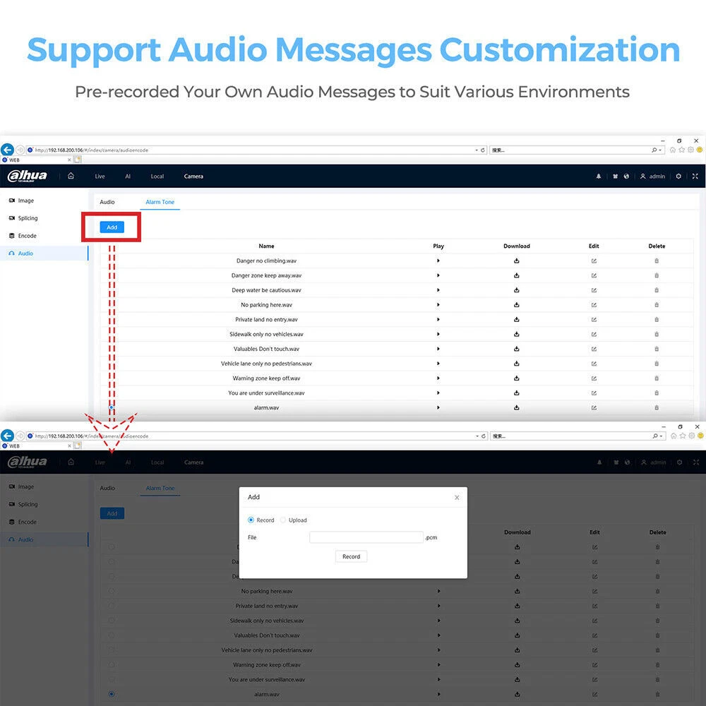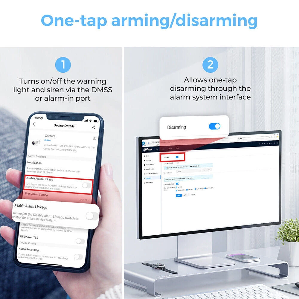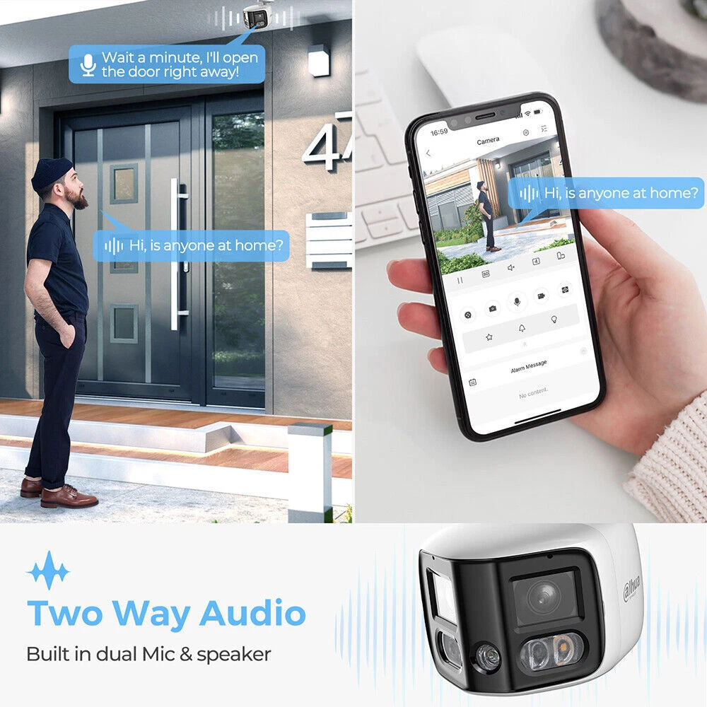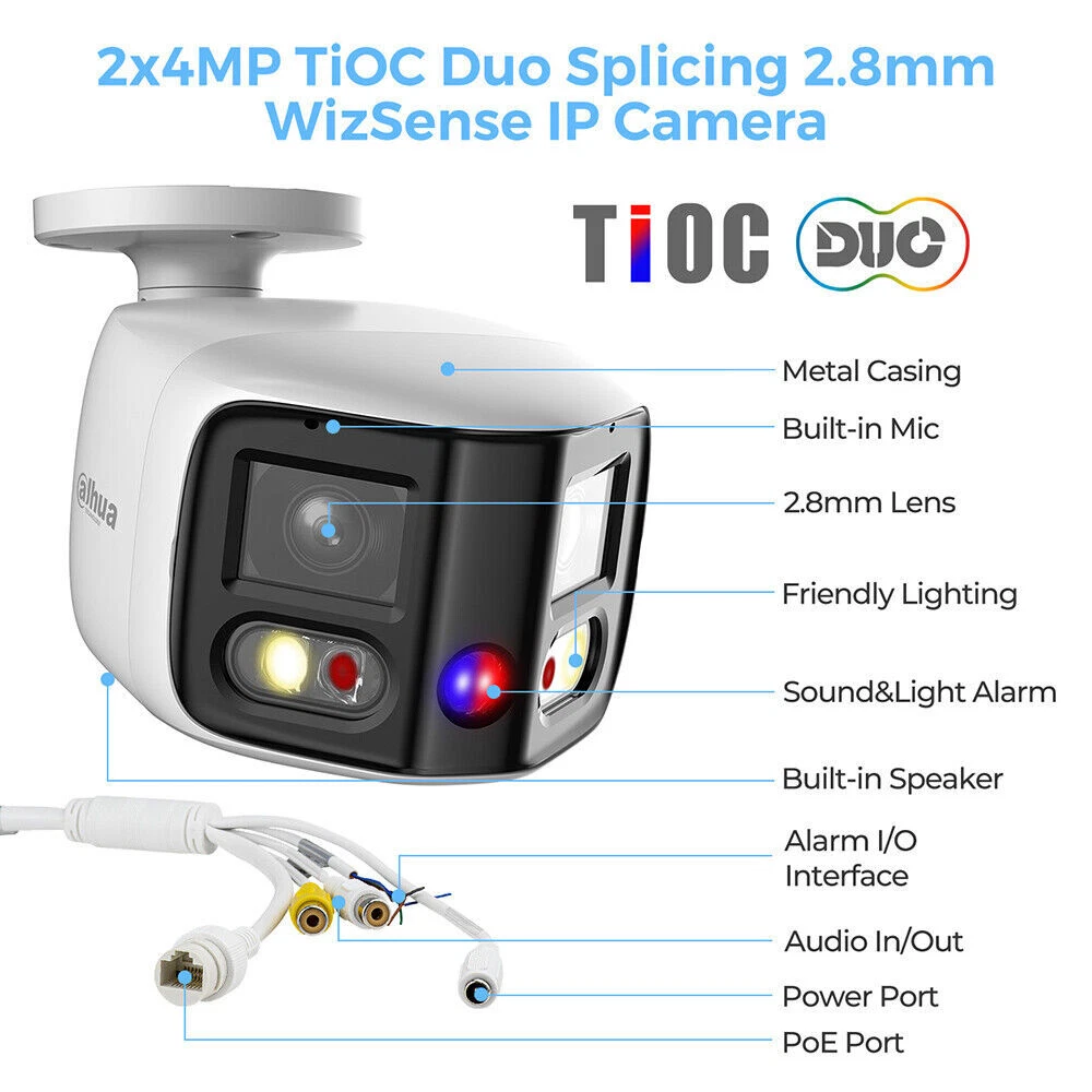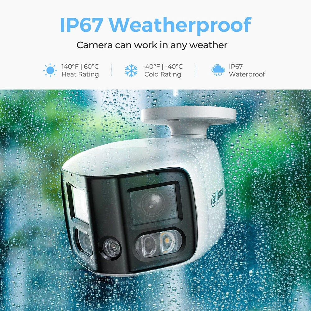 Product Description Note*: Original Dahua English version and Firmware upgradeable. Features > Outputs 180° wide angle splicing image. > Outputs max. 8 MP (4096 × 1860) 20 fps. > H.265 codec, high compression rate, ultra-low bit rate. > Built-in IR LED and warm light, the max. IR illumination distance is 25 m and warm light distance is 20m. > ROI, SMART H.264 +/H.265+, AI H.264/H.265, flexible coding, applicable to various bandwidth and storage environments. > WDR, 3D NR, HLC, BLC, digital watermarking, applicable to various monitoring scenes. > Alarm: 1 in, 1 out; audio: 1 in, 1 out; supports max. 256 G Micro SD card; built in dual Mic; built in speaker, support two-way talk. > 12 VDC/PoE power supply, easy for installation. > IP67 protection. > Sound and light alarm (red and blue lights) > EPTZ: Enlarge and track the targets of intelligent alarms. > SMD 4.0. > One-tap arming/disarming through alarm input. System Overview Dahua WizSense 3 Series Network Camera greatly saves on bandwidth and storage space through its AI Coding technology. Driven by its advanced deep learning algorithms, the camera supports intelligent functions such as perimeter protection, smart motion detection (SMD), Quick Pick, making it easy and convenient to use. Starlight technology and its large aperture lens also allow the camera to produce clear, vivid images even in poor lighting conditions. Functions Siren and Light Active Deterrence Dahua siren and light active deterrence network camera supports the light alarm and voice alarm when perimeter event occurs, to realize the deterrence and effective intervention. The camera is built in multiple voices for selection, and supports customized voice importing. Smart Dual Light Dahua Smart Dual Light technology adopts smart algorithm to detect targets. Usually, the IR illuminator is on at night; when the target appears in the monitoring area, the warm light is on, and the camera records the full-color video and information of key events. That is, the camera links snapshot and video with full-color image. When the target is out of the monitoring area, the warm light is off and the IR illuminator is on, which reduces light pollution efficiently. SMD 4.0 Dahua Smart Motion Detection technology works with intelligent algorithms to classify targets that trigger motion detection alarms. It filters out objects that are not targets, such as small and large animals, to avoid triggering false alarms. With an AI NVR, Quick Pick technology becomes available, allowing you to easily search for and pick out human and vehicle targets from SMD event videos, prioritizing the highest matches. EPTZ With advanced target detection and tracking algorithms, Dahua EPTZ technology can simultaneously zoom in and track multiple humans and vehicles that trigger alarms. It provides rich details and a panoramic view at the same time One-tap Disarming Dahua One-tap Disarming function, which is convenient and easy for operation, is the switch for event linkage. Customers can close and recover event linkage through mobile App, which meets multi-scenarios needs. Cyber Security Dahua network cameras employ a series of security technologies, including security authentication and authorization, access control protocols, trusted protection, encrypted transmission and encrypted storage. These technologies improve the camera's defense against external cyber threats and prevent malicious programs from compromising the device. Protection (IP67, wide voltage) IP67: The camera passes a series of strict test on dust and soak. It has dust-proof function, and the enclosure can work normally after soaking in 1 m deep water for 30 minutes. Wide voltage: The camera allows ±30% input voltage tolerance (wide voltage range), and it is widely applied to outdoor environment with instable voltage Specifications Camera Image Sensor Dual 1/2.7" CMOS Max. Resolution 4096 (H) × 1860 (V) ROM 128 MB RAM 1 GB Scanning System Progressive Electronic Shutter Speed Auto/Manual 1/3 s–1/100,000 s Min. Illumination 0.005 lux F1.4 (Color, 30 IRE) 0.0005 lux F1.4 (B/W, 30 IRE) 0 lux (Illuminator on) S/N Ratio >56 dB Illumination Distance Up to 25 m (82.02 ft) (IR LED) Up to 20 m (65.62 ft) (Warm light) Illuminator On/Off Control Auto; Manual Illuminator Number 2 (IR LED); 2 (Warm light) Angle Adjustment Pan: 0°–360° Tilt: 0°–77° Rotation: 0°–360° Lens Lens Type Fixed-focal Lens Mount M12 Focal Length 2.8 mm Field of View Horizontal: 180°; Vertical: 86° Max. Aperture F1.4 Iris Control Fixed Close Focus Distance 0.8 m (2.62 ft) DORI Distance Lens Detect Observe Recognize Identify 2.8 mm 50.6 m (166.01 ft) 20.2 m (66.27 ft) 10.1 m (33.14 ft) 5.1 m (16.73 ft) Intelligence IVS (Perimeter Protection) Intrusion, tripwire (the two functions support the classification and accurate detection of vehicle and human) SMD SMD 4.0 Quick Pick With AI NVR, quickly pick up the human/vehicle targets that users are interested in from SMD events. Smart Search Work together with Smart NVR to perform refine intelligent search, event extraction and merging to event videos. EPTZ Enlarge and track the targets of intelligent alarms Video Video Compression H.265; H.264; H.264H; H.264B; MJPEG (Only supported by the sub stream) Smart Codec Smart H.265+; Smart H.264+ AI Coding AI H.265; AI H.264 Video Frame Rate Main stream: 4096 × 1860 (1–20 fps ) Sub stream: 1200 × 530 (1–20 fps) Third stream: 1920 × 860 (1–20 fps) *The values above are the max. frame rates of each stream; for multiple streams, the values will be subjected to the total encoding capacity. Stream Capability 3 streams Resolution 4096 × 1860; 3632 × 1632; 3040 × 1368; 1200 × 530; 1920 × 860; 960 × 432 Bit Rate Control CBR/VBR Video Bit Rate H.264: 6 kbps –16384 kbps H.265: 6 kbps –16384 kbps Day/Night Auto(ICR)/Color/B/W BLC Yes HLC Yes WDR 120 dB Scene Self-adaptation (SSA) Yes White Balance Auto; natural; street lamp; outdoor; manual; regional custom Gain Control Au