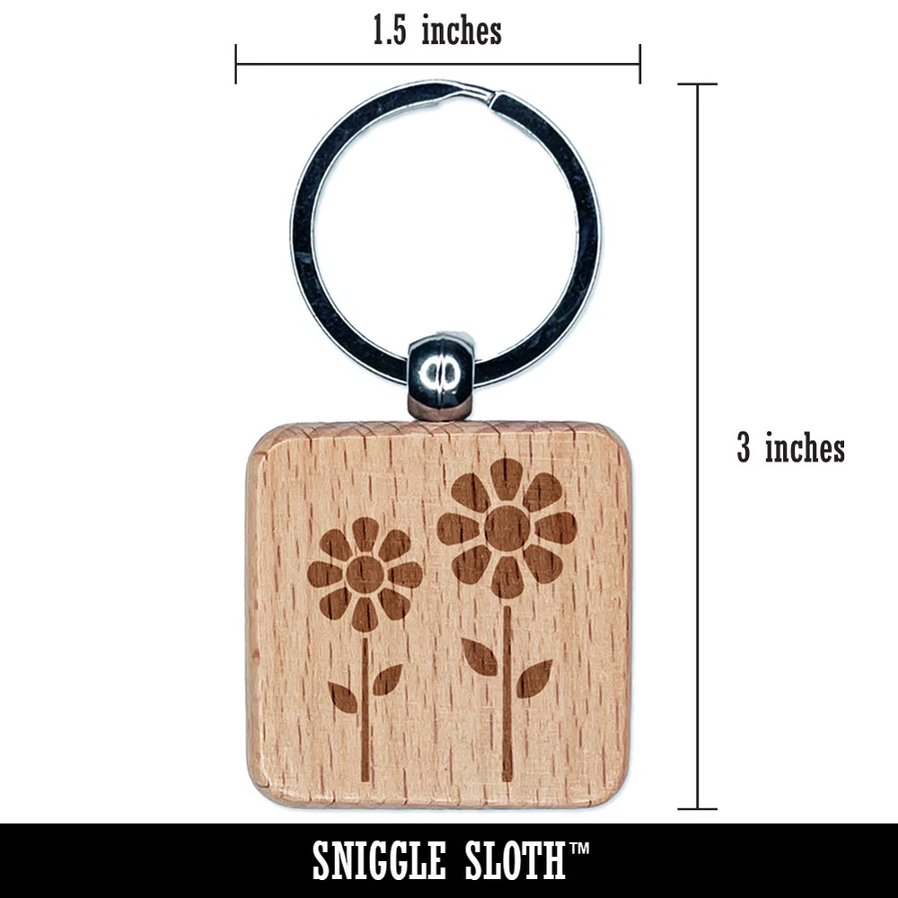 Daisy Flower Pair Engraved Wood Square Keychain Tag Charm
