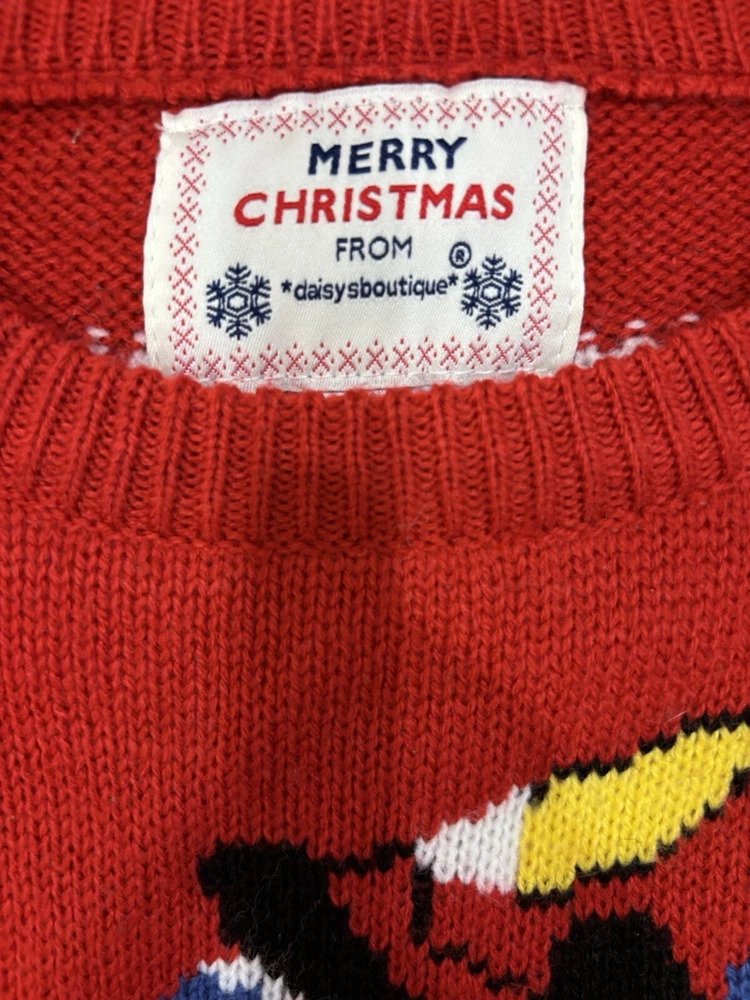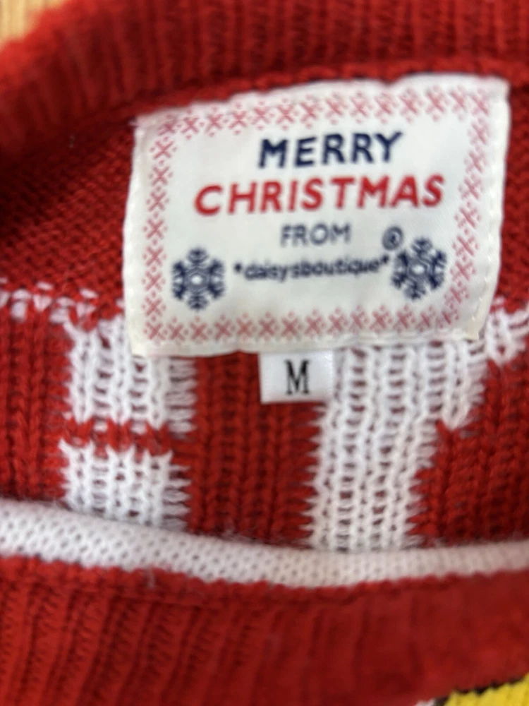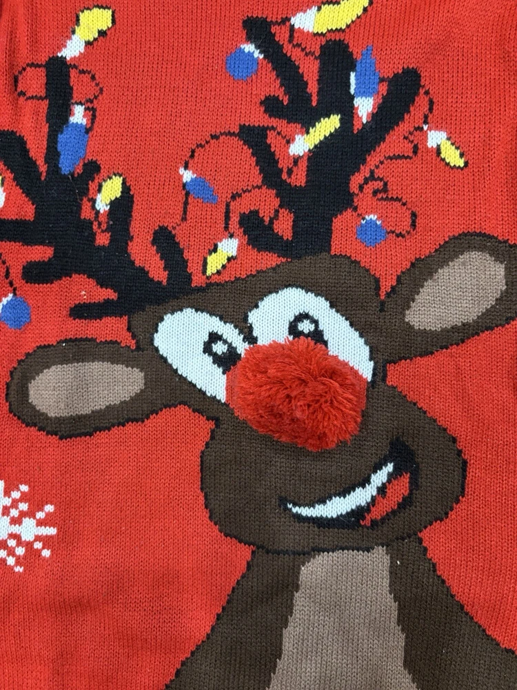 Daisy’s Boutique pom pom nosed Reindeer Christmas sweater. Women’s size medium. Back says “Oh Deer”. Preowned. Good condition.