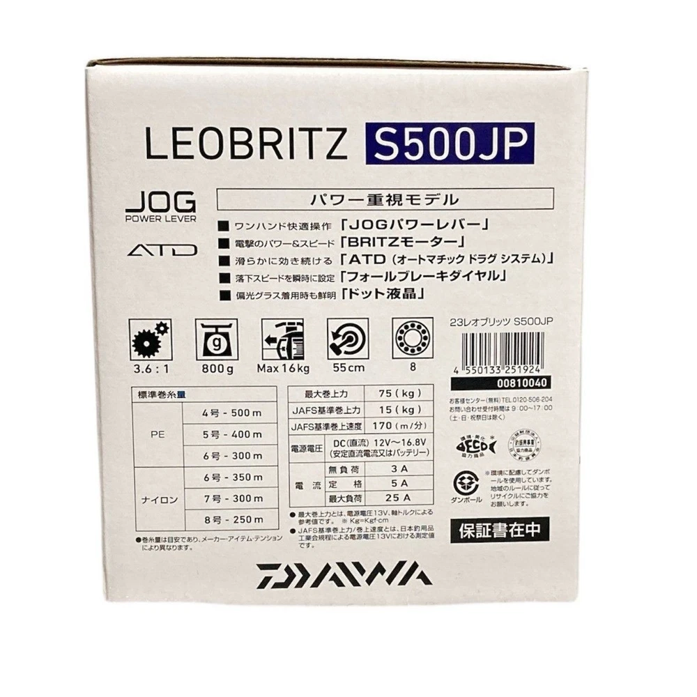 DAIWA Electric Reel 23 Leo Blitz S500JP Description About This Items 23 Leoblitz S500JP Brand: DAIWA (fishing) Reel gear ratio: 3.6 (gear ratio) Reel weight: 800.0 g Maximum drag force: 16.0 kg Maximum winding length: 55.0 cm Number of ball bearings: 8.0 Right handle/left handle: Right handle Maximum winding force: 83.0 kg Shipping We always send the item with a tracking number. So please place an order without any concern on delivery. You can always track the delivery status. Shipping is only available to the address registered in eBay. If you want us to send another address, please change your address on eBay and then place an order. Shipping is available from Monday to Friday. Weekends are not available because freight (shipping) companies are closed. We do not mark merchandise values below value or mark items as “gifts” – Japan, US and International government regulations prohibit such behavior. About Importer's Obligation Import duties, taxes, and charges are not included in the item price or shipping cost. These charges are the buyer's responsibility. Please check with your country's customs office to determine what these additional costs will be prior to bidding or buying. Thank you for your understanding.