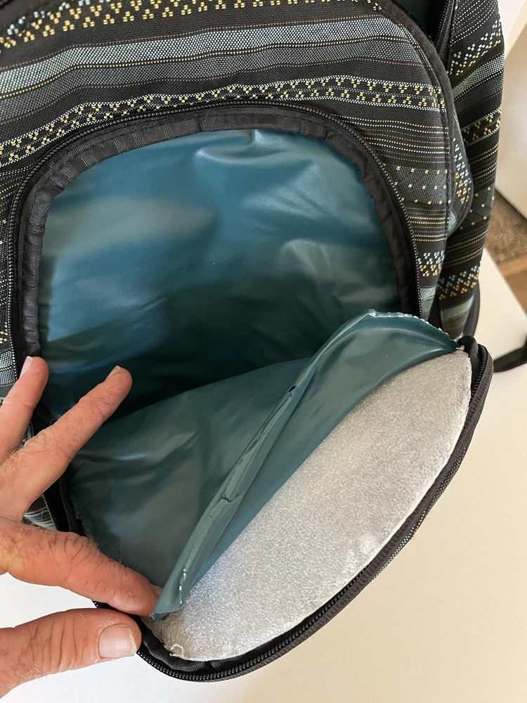Please look at photos. Has flaw on the inside of the insulated pocket. the stitching came loose. As seen in the last 3 photos. Besides the one pocket the back pack is in good condition. Also has a small blemish on the very bottom of backpack where the material is slightly torn but doesn’t go all the way through material.