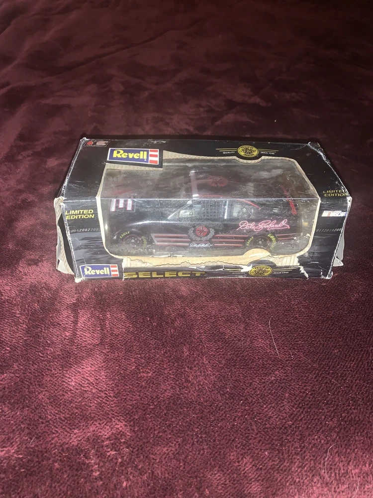 This is a 1:24 scale diecast replica of Dale Earnhardt's 2002 Chevrolet Monte Carlo featuring the logo of Dale Earnhardt Incorporated. The black vehicle, part of the Revell Select series, features authentic details like Earnhardt's signature and is a limited edition collectible piece. This NASCAR racecar model is recommended for adult collectors. This diecast is in excellent and undamaged condition, however the original box is severely water damaged.