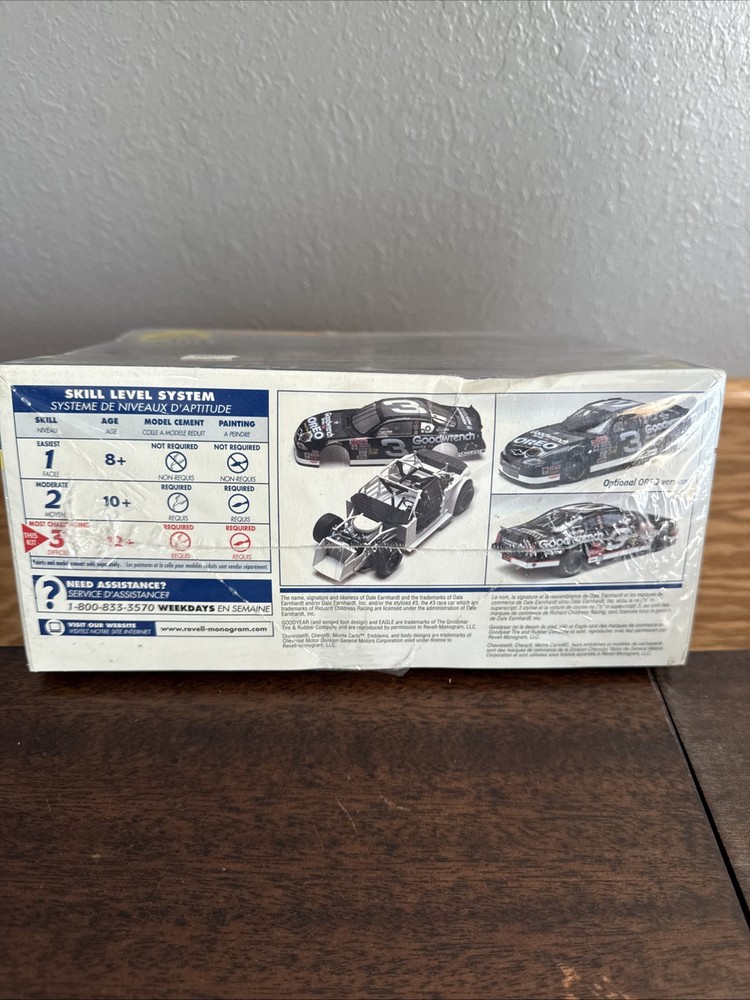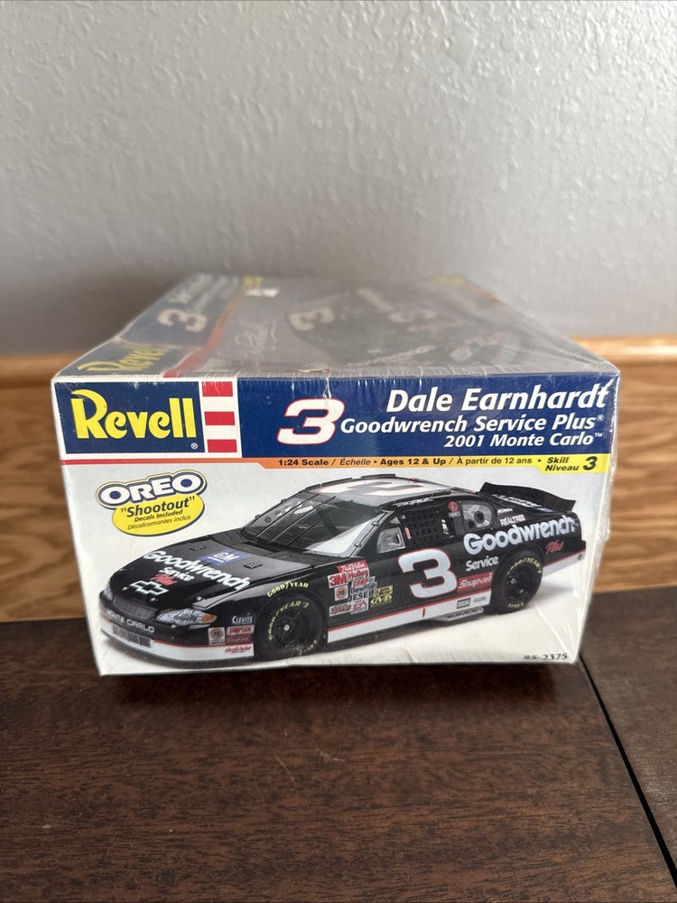 The product is a Revell model car of Dale Earnhardt's #3 Goodwrench Service Plus 2001 Chevrolet Monte Carlo NASCAR racecar in 1:24 scale. The car is white in color and comes in an unopened box. It is part of the NASCAR Shootout series, targeted for ages 12-16. The model is made of plastic and is themed around NASCAR, featuring the iconic driver Dale Earnhardt.