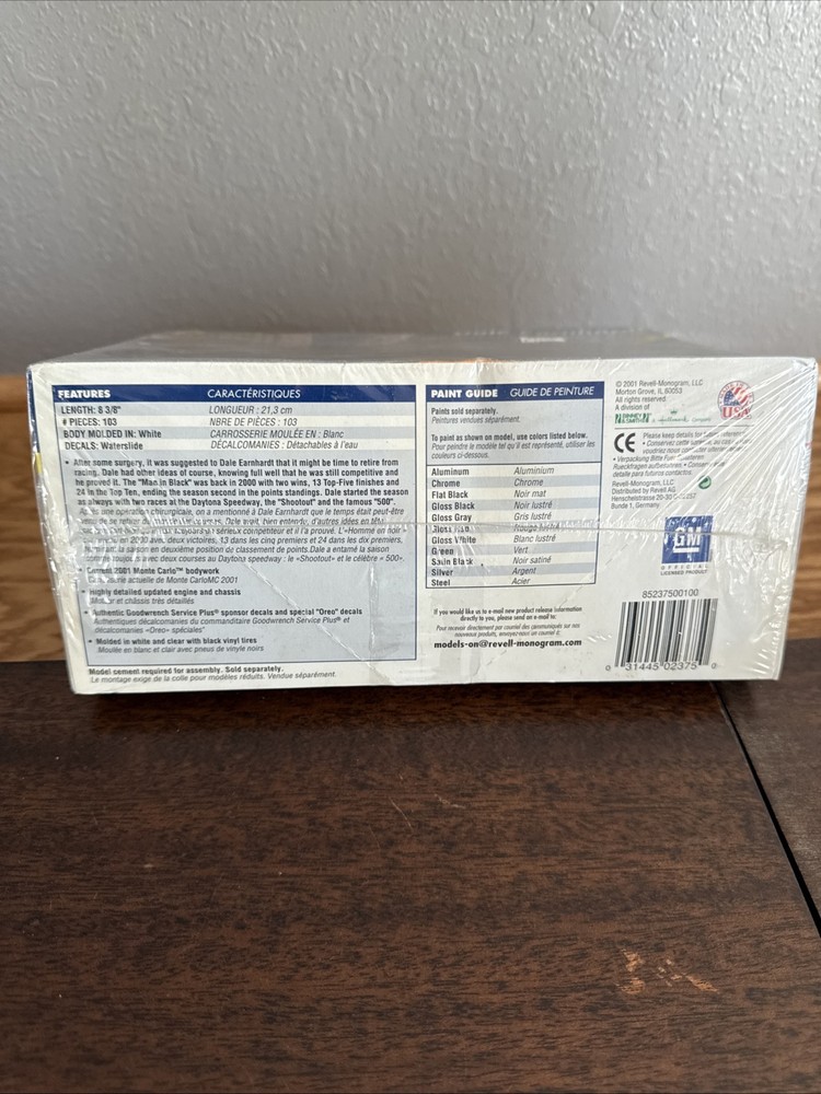 UPC: 031445023750 Race series: Shootout Age Level: 12-16 Years Recommended Age Range: 12 Material: Plastic Vehicle Make: Chevrolet Theme: NASCAR Brand: Revell Country/Region of Manufacture: United States Driver: Dale Earnhardt Features: Unopened Box Organization: NASCAR gtin13: 031445023750 Character Family: Cars Model: Monte Carlo Vehicle Type: NASCAR Racecar Vehicle Year: 2001 Scale: 1:24 Color: White