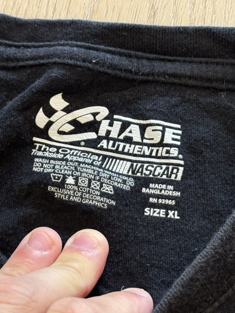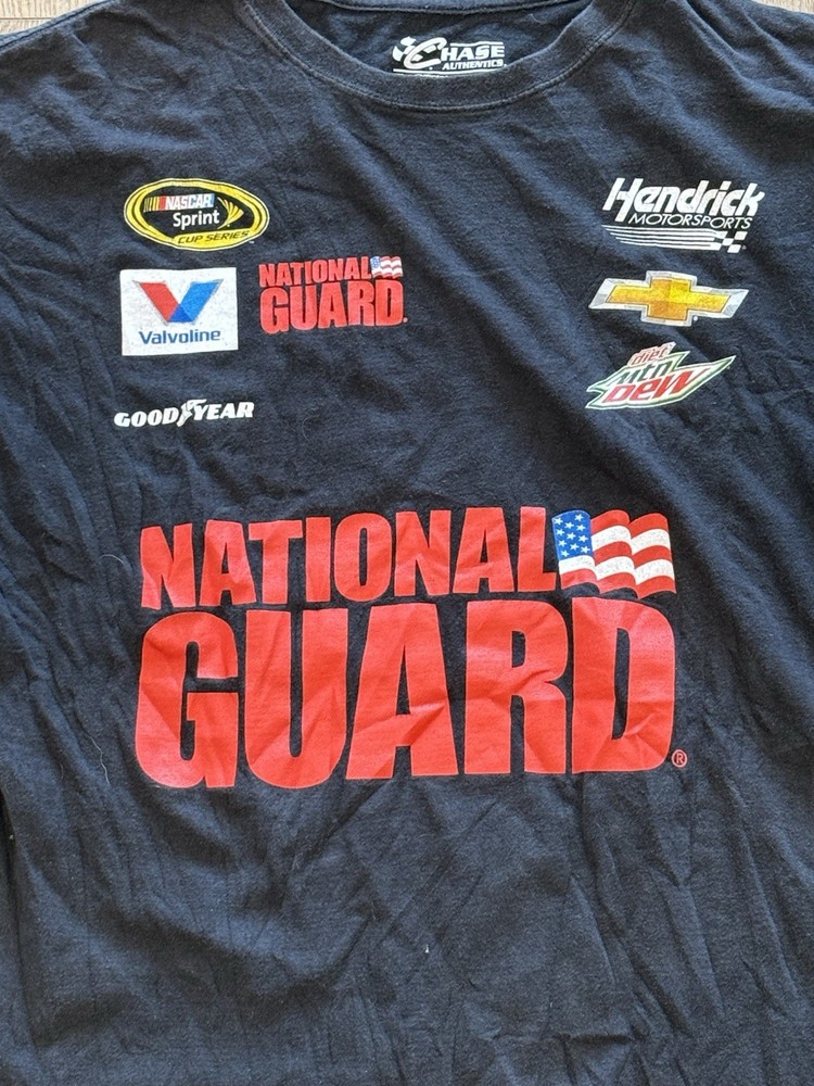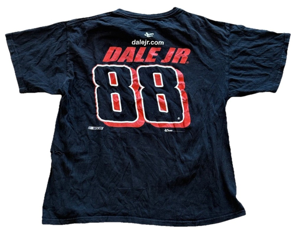 Small tear shown! The product is a black XL youth boys shirt featuring Dale Earnhardt Jr.'s #88 Nascar racing uniform. Officially licensed by the driver and team, JR Motorsports, this shirt is perfect for young fans of NASCAR and Dale Earnhardt Jr. Made in Bangladesh, the shirt is a great way for boys to show their support for their favorite driver in style.