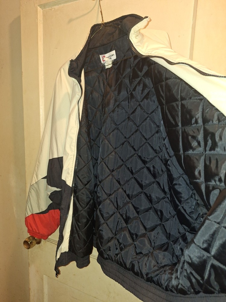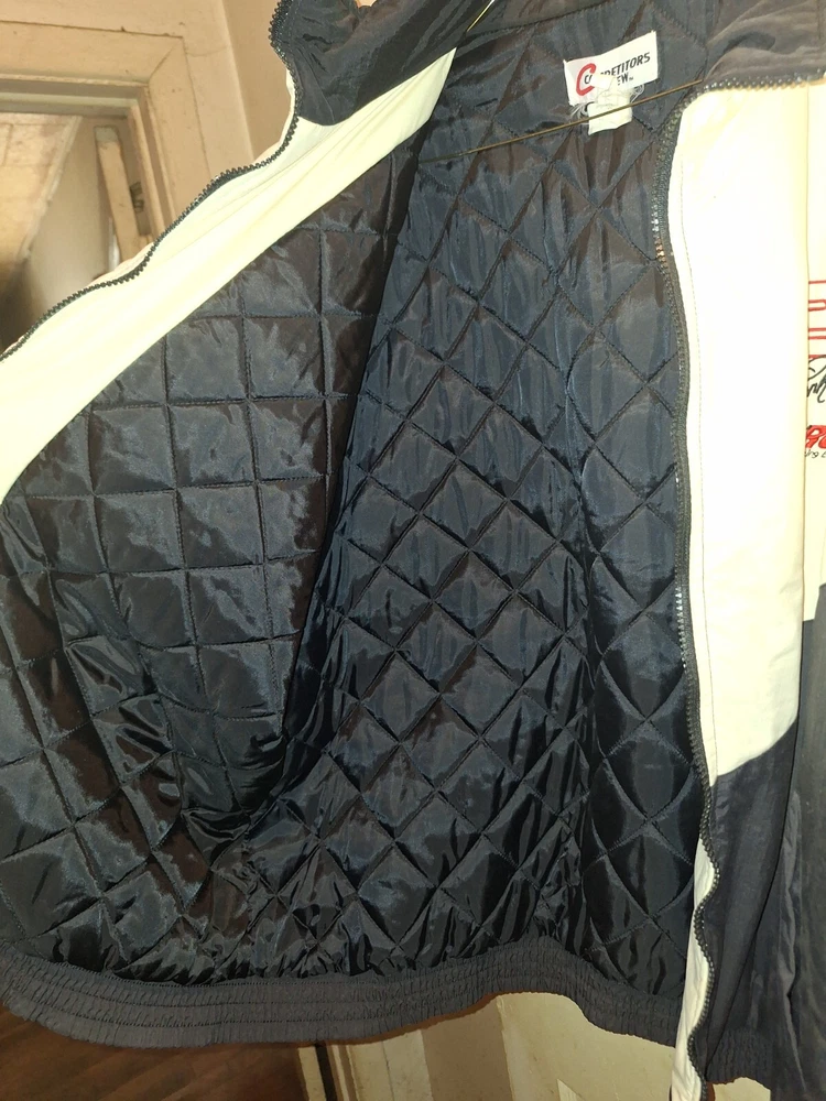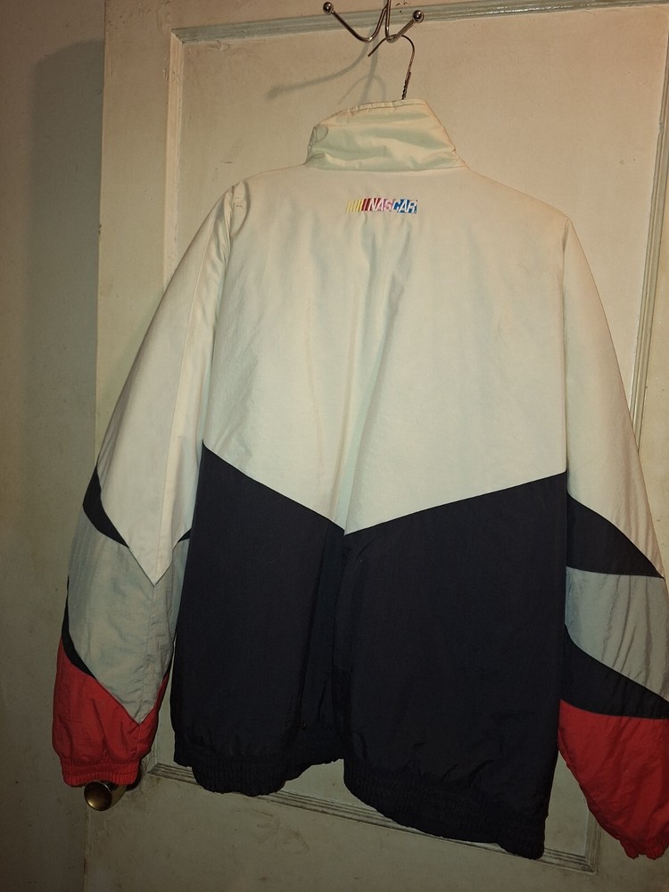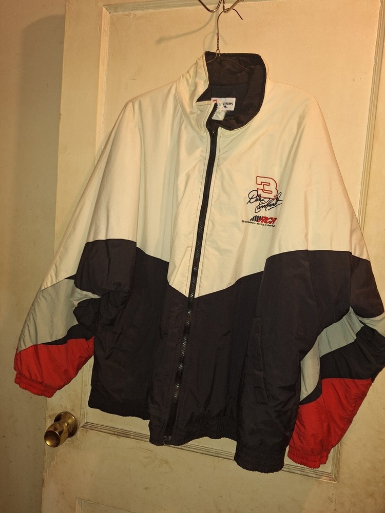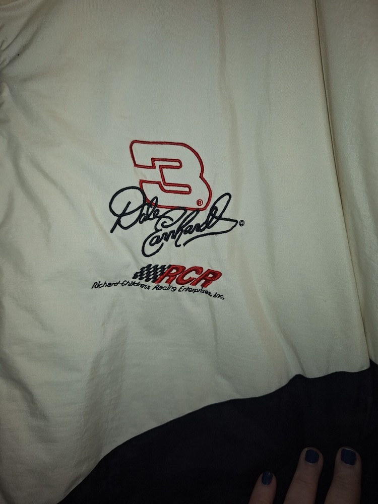 Never been worn. The product is a white satin jacket featuring the branding of Dale Earnhardt Jr., a prominent NASCAR driver. This officially licensed apparel is designed for fans of auto racing, specifically those who admire the legendary Dale Earnhardt. Perfect for showing support for the driver and the sport of NASCAR, this jacket is a stylish and comfortable way for fans to represent their favorite driver and league.